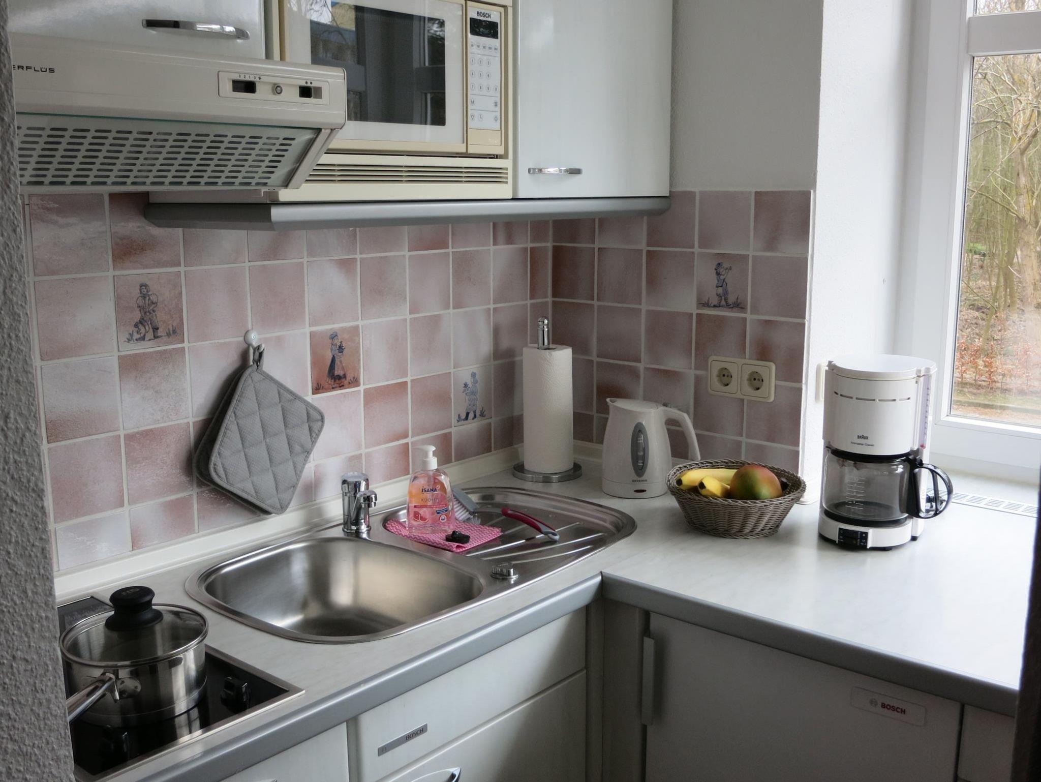 Küche:Einbauküche, 2 Platten-Ceranfeld, Spüle, Dunstabzugshaube, Mikrowelle, Kühlschrank, Kaffeemaschine, Senseo Kaffeepadmaschine, Wasserkocher, Toaster, Geschirr und Besteck, Gläser, Haushalts- u. Kochutensilien, Kochtöpfe, Pfanne