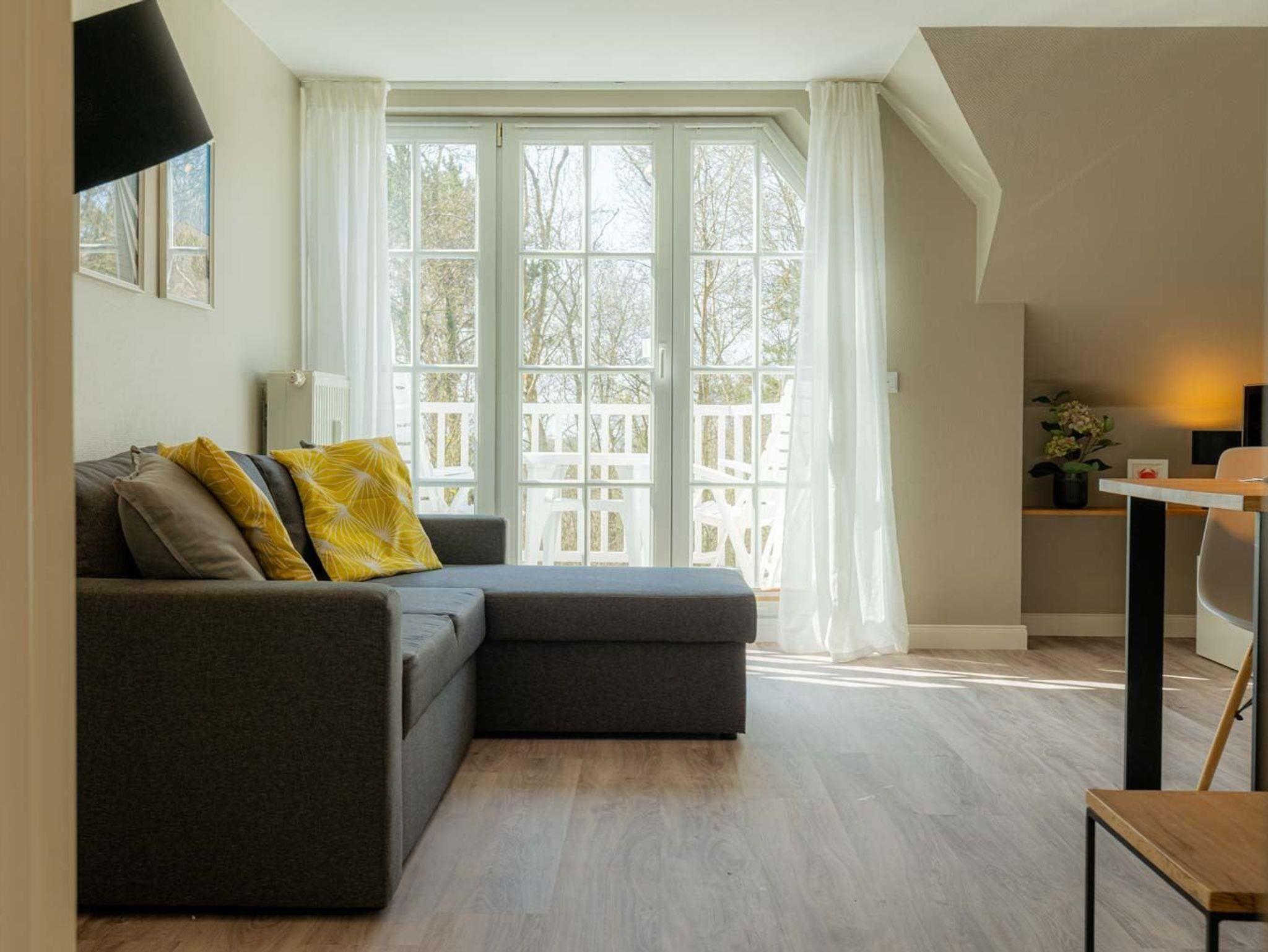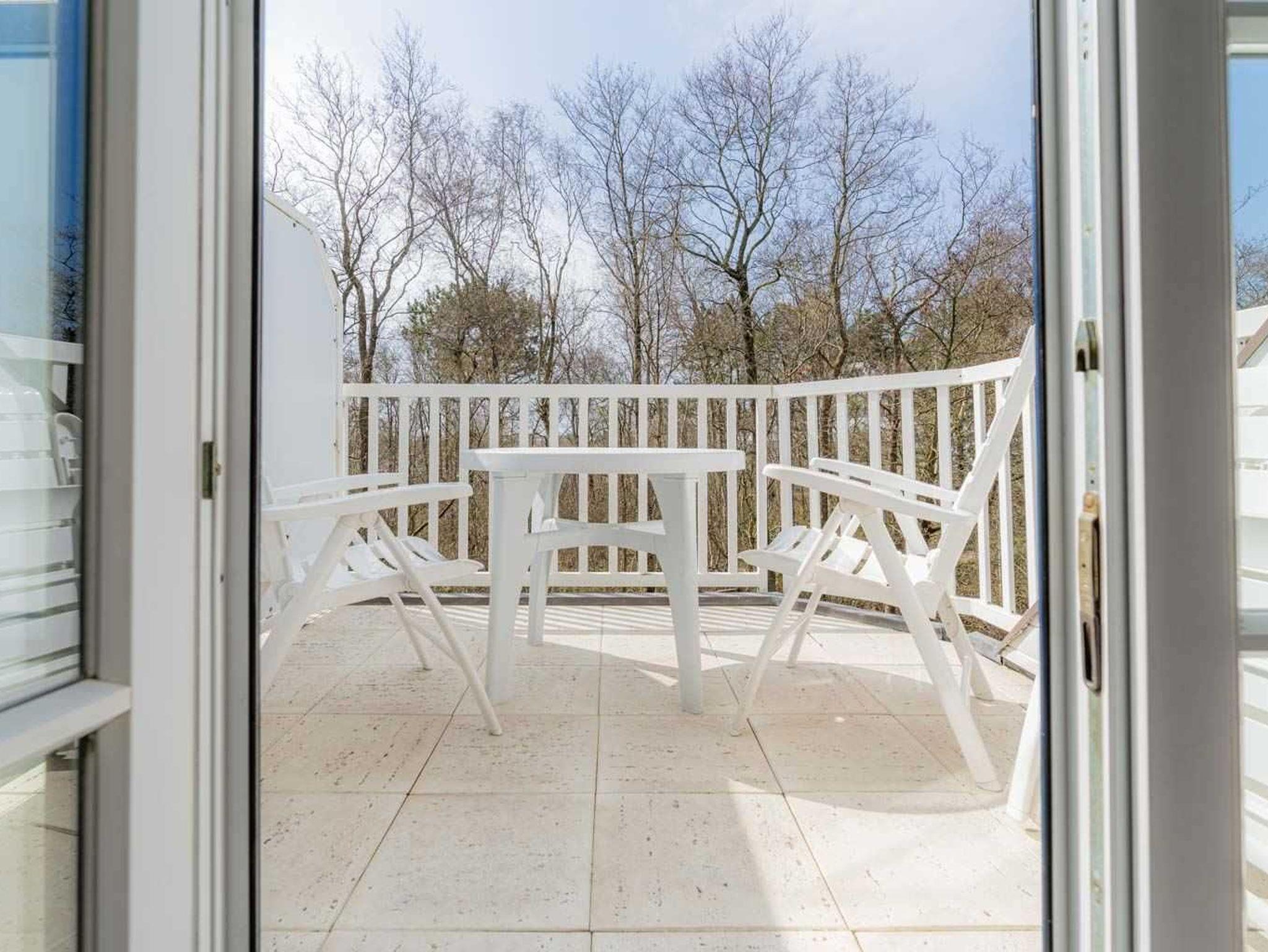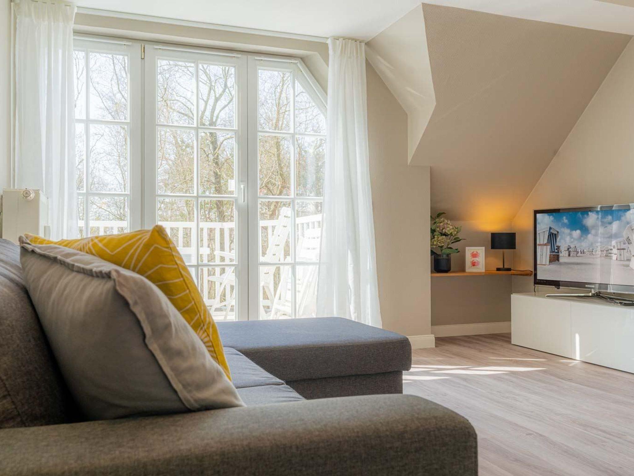 Helles Wohnzimmer mit Sofa mit Ottomane, SMART-TV (Kabel) und Esstisch mit 2 Stühlen und Sitzbank für 2 Personen. Direkter Zugang zum möblierten Balkon nach Südwesten mit Waldblick und Meeresrauschen. Offene Küche mit Backofen, Geschirrspüler, Kühlschrank mit Gefrierfach und Tchibo Cafissimo Kapsel-Kaffeemaschine.