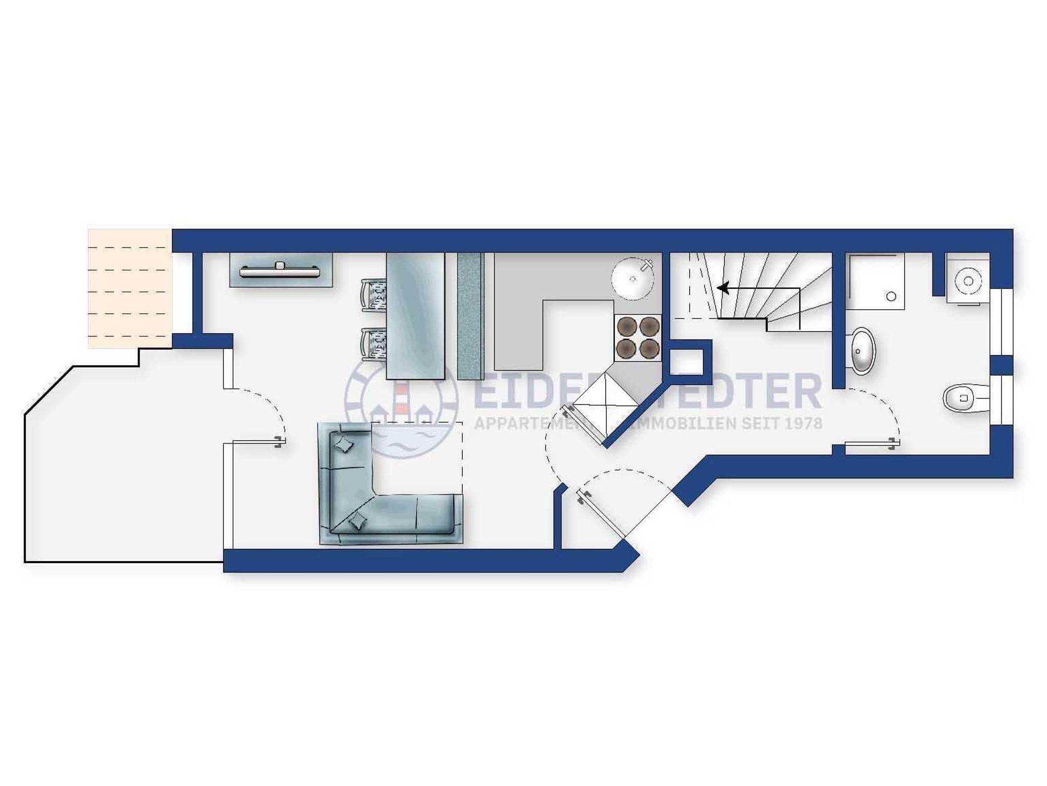 Exklusive 3-Zimmer-Ferienwohnung Strandkind im Haus Dünen un Diek mit ca. 55 m² auf 2 Ebenen (OG, DG) für bis zu 4 Personen. Strand- und zentrumsnahe Lage im Ortsteil Bad in St. Peter-Ording. Den Strand sowie das Kurzentrum mit vielen Restaurants, Cafés und Geschäften erreichen Sie in wenigen Gehminuten.