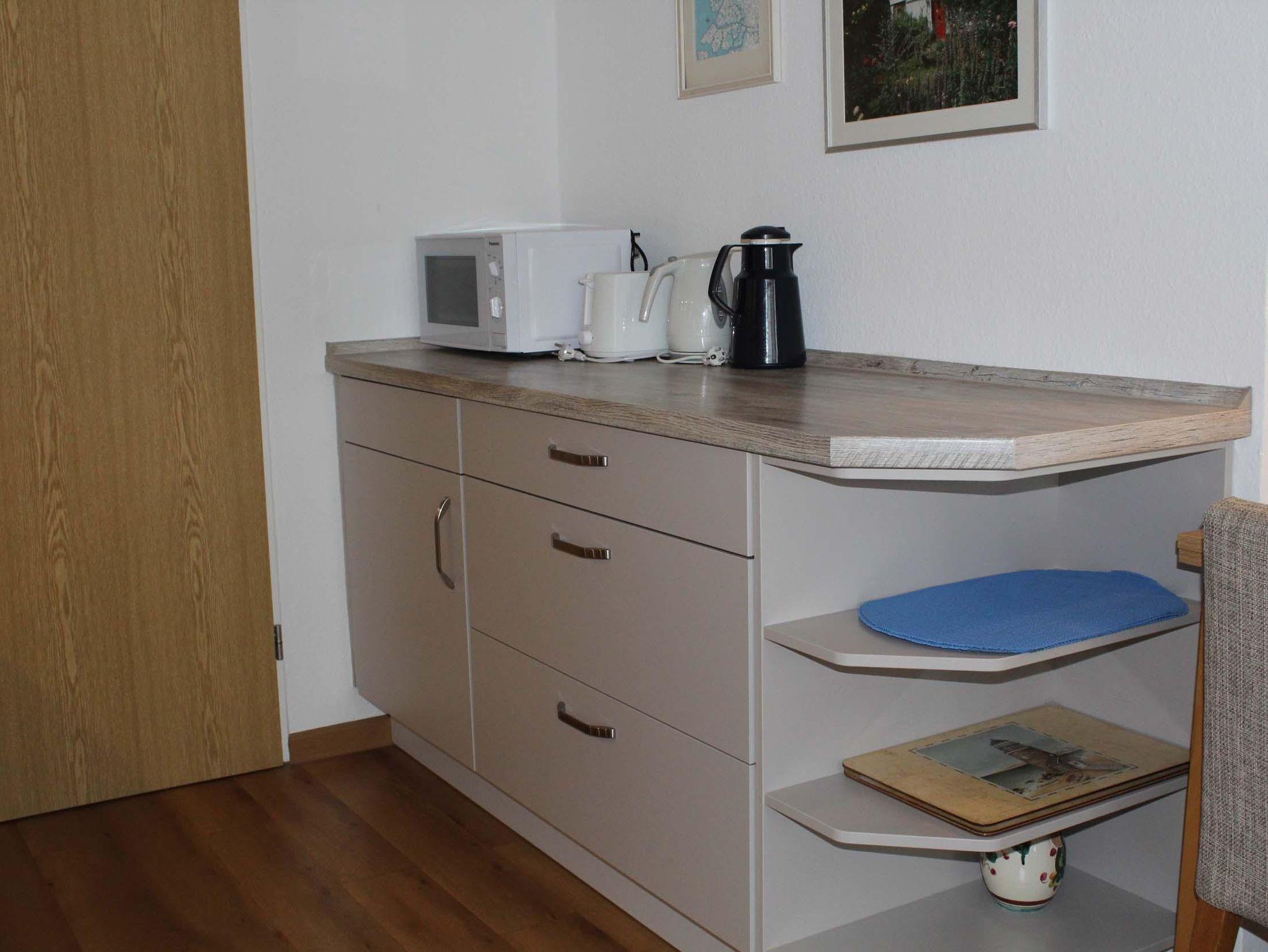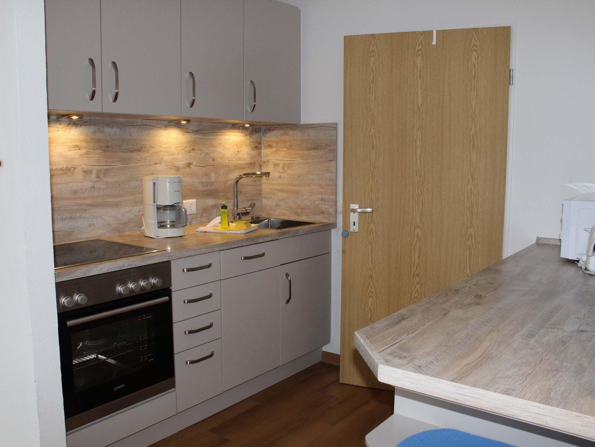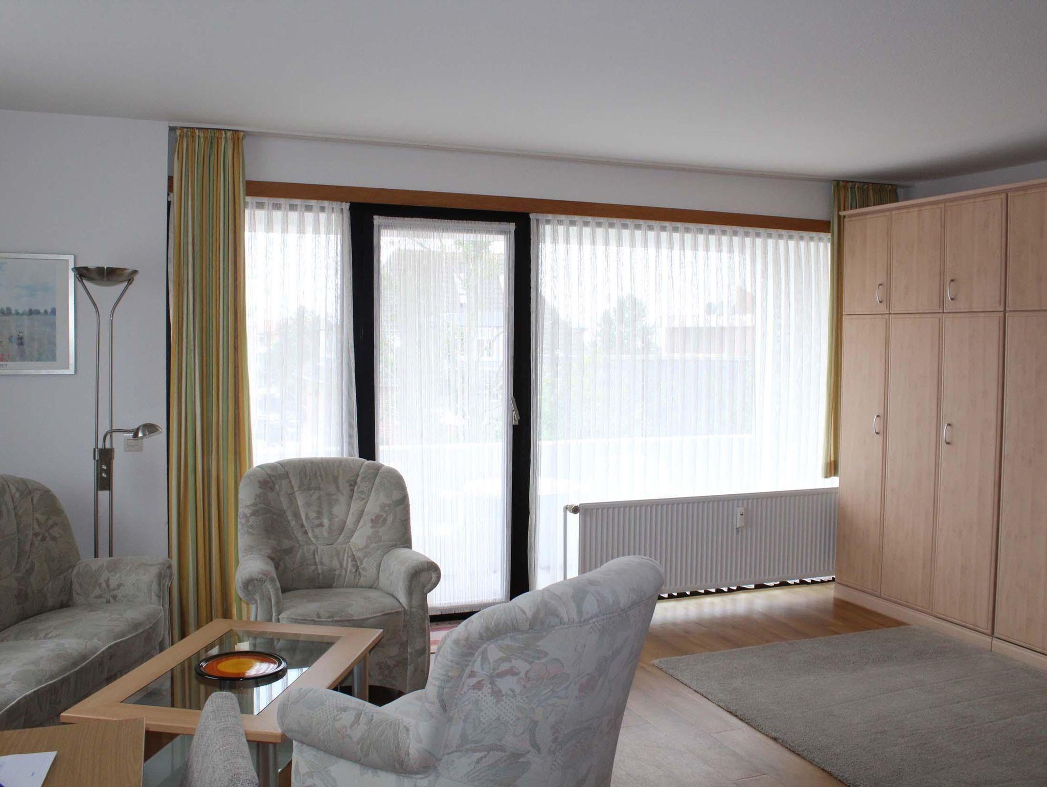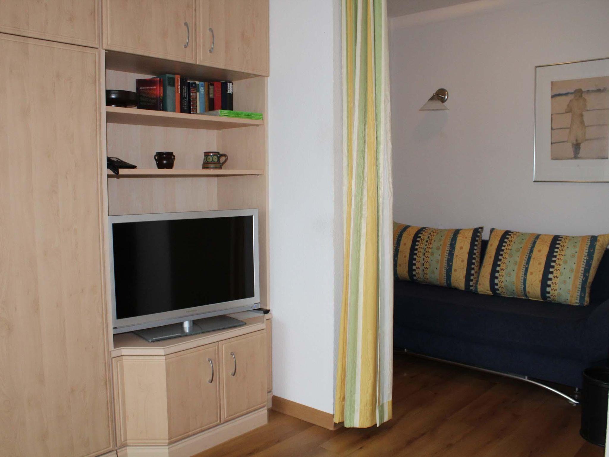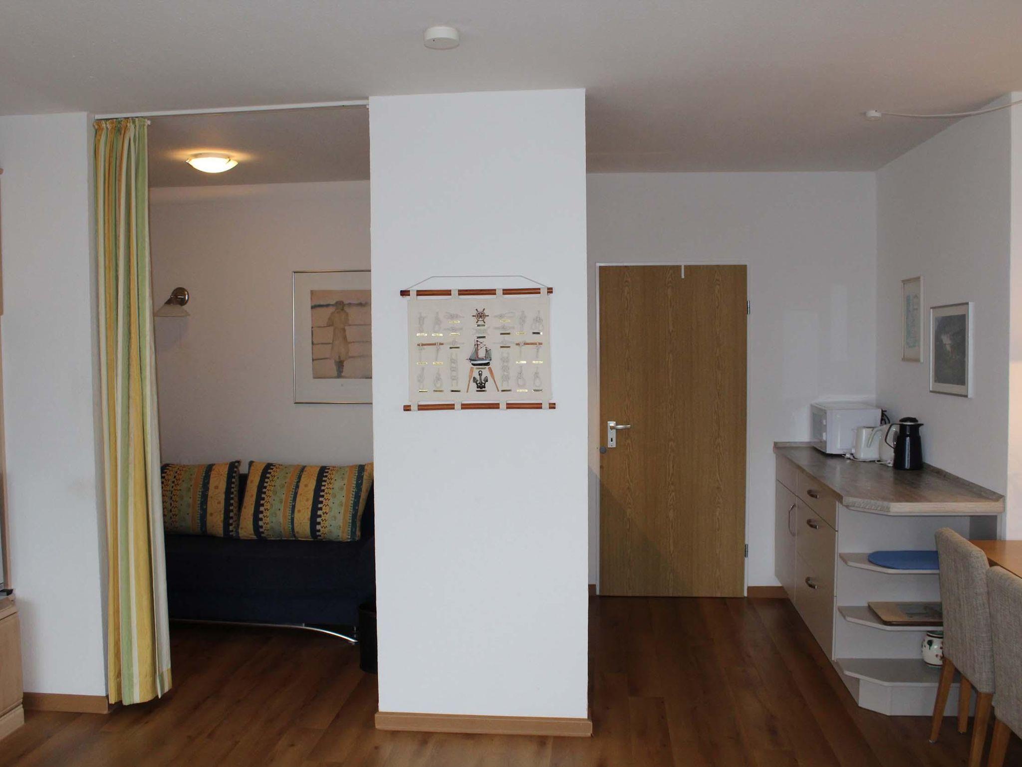 Wohn-Schlafraum mit 2 Wandschrankbetten und Schlafcouch (1,40 m breit), Holzfußboden, Sitzecke, Essecke, Küchenzeile 2017 neu mit Geschirrspüler und Mikrowelle, Dusche/WC, Durchwahltelefon, Kabel-TV, Balkon, PKW-Platz-Nr. 43, Aufzug und Fahrradkeller vorhanden, Rezeption, Brötchenservice, Schwimmbad, Sauna kostenpflichtig, kostenfreier Internetzugang (LAN1-Germania).
