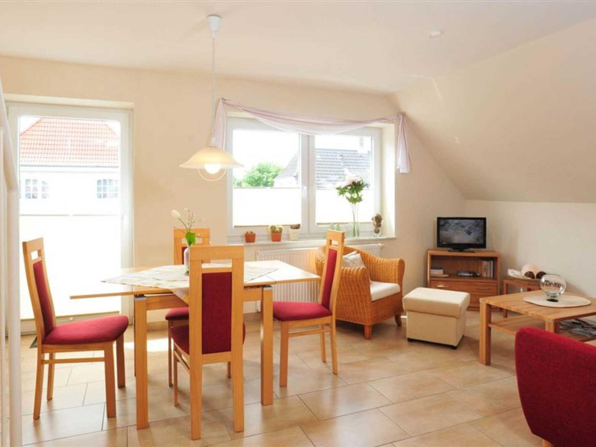 Wohnzimmer mit Sofa (2er), Sessel, TV (Sat), Radio und Esstisch mit 4 Stühlen. Direkter Zugang zum möblierten Südbalkon. Offene Küche mit Backofen, Kühlschrank mit Gefrierfach und Geschirrspüler.