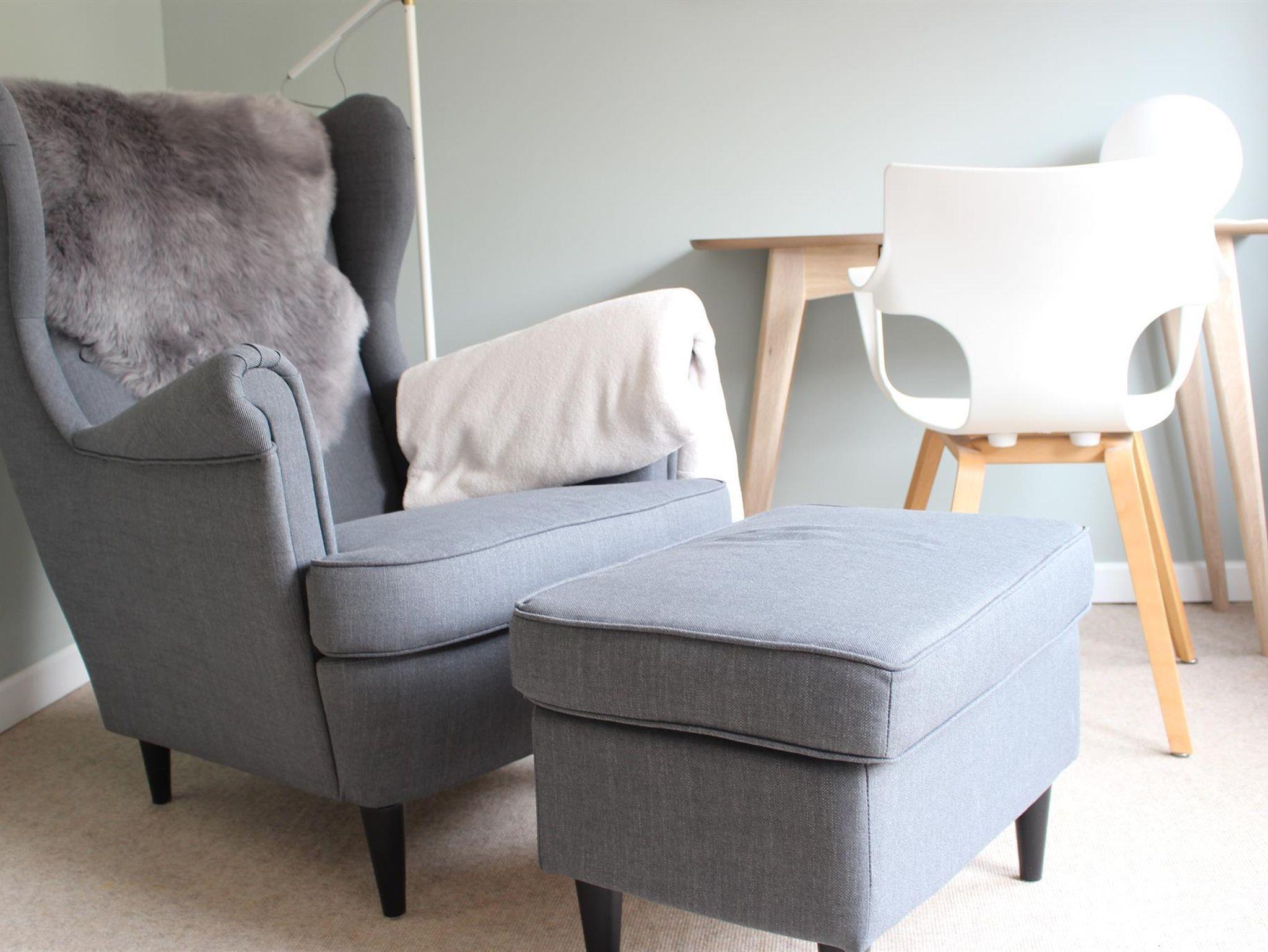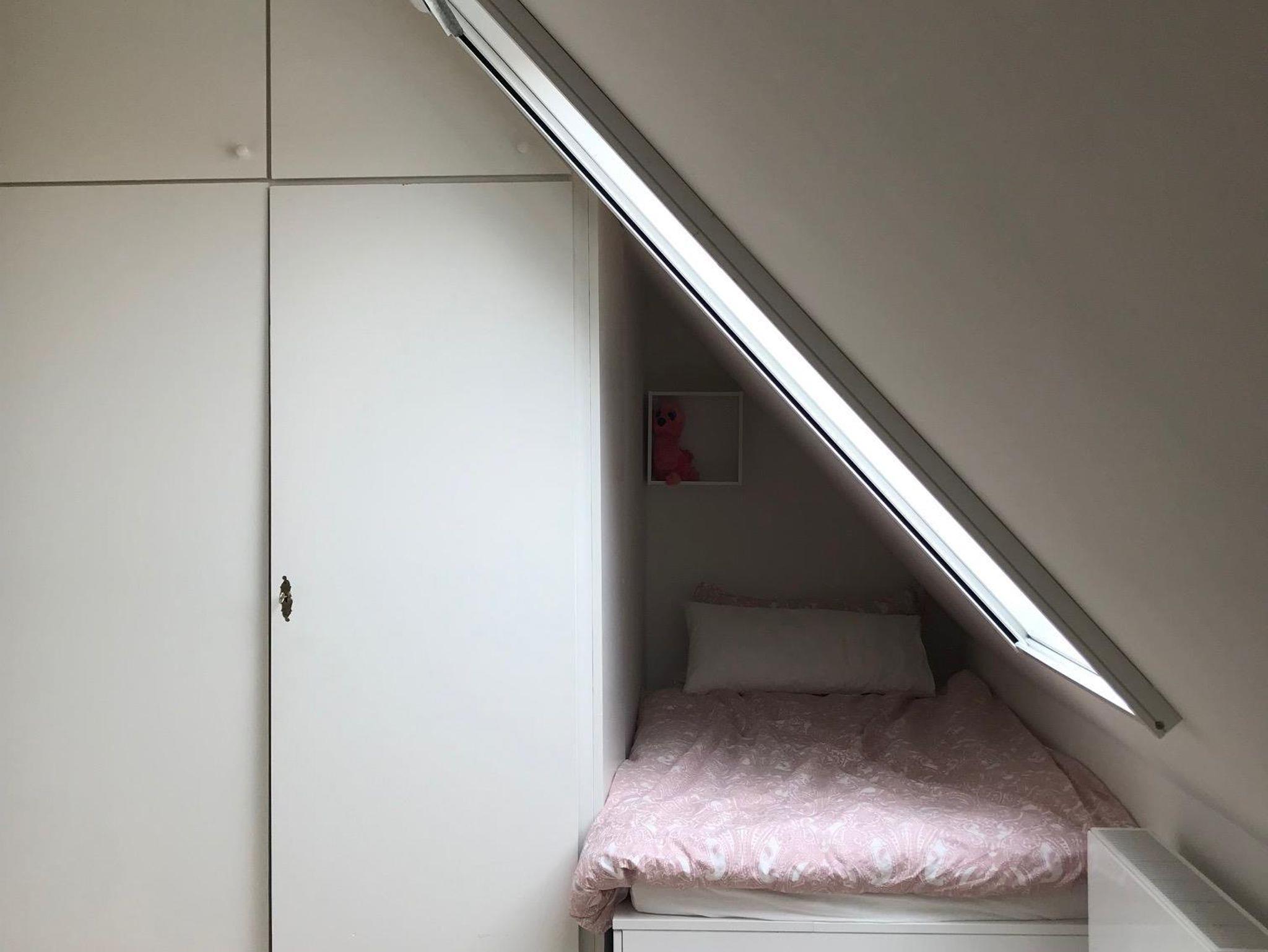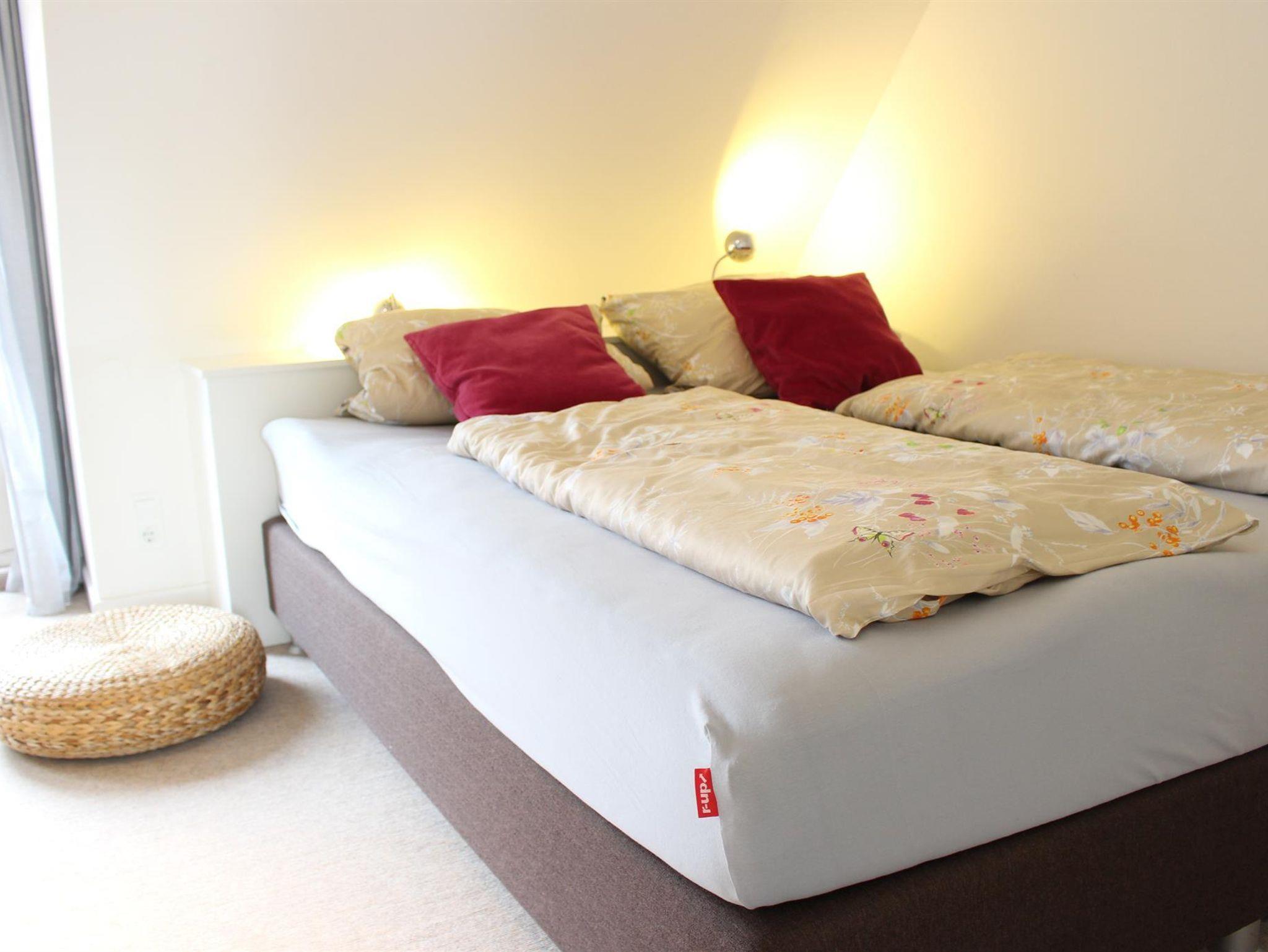 Im 1. Stock trennt das Badezimmer die beiden Schlafzimmer. Das grosszügige Elternschlafzimmer hat einen Balkon, ein Boxspringbett 180x210cm und verfügt über eine bequeme Leseecke mit Ohrensessel und Schreibtisch. Das Kinderschlafzimmer ist mit einem Einzelbett in der Niesche sowie einem ausziehbaren Hemnesbett (80/160x200cm) ausgestattet.