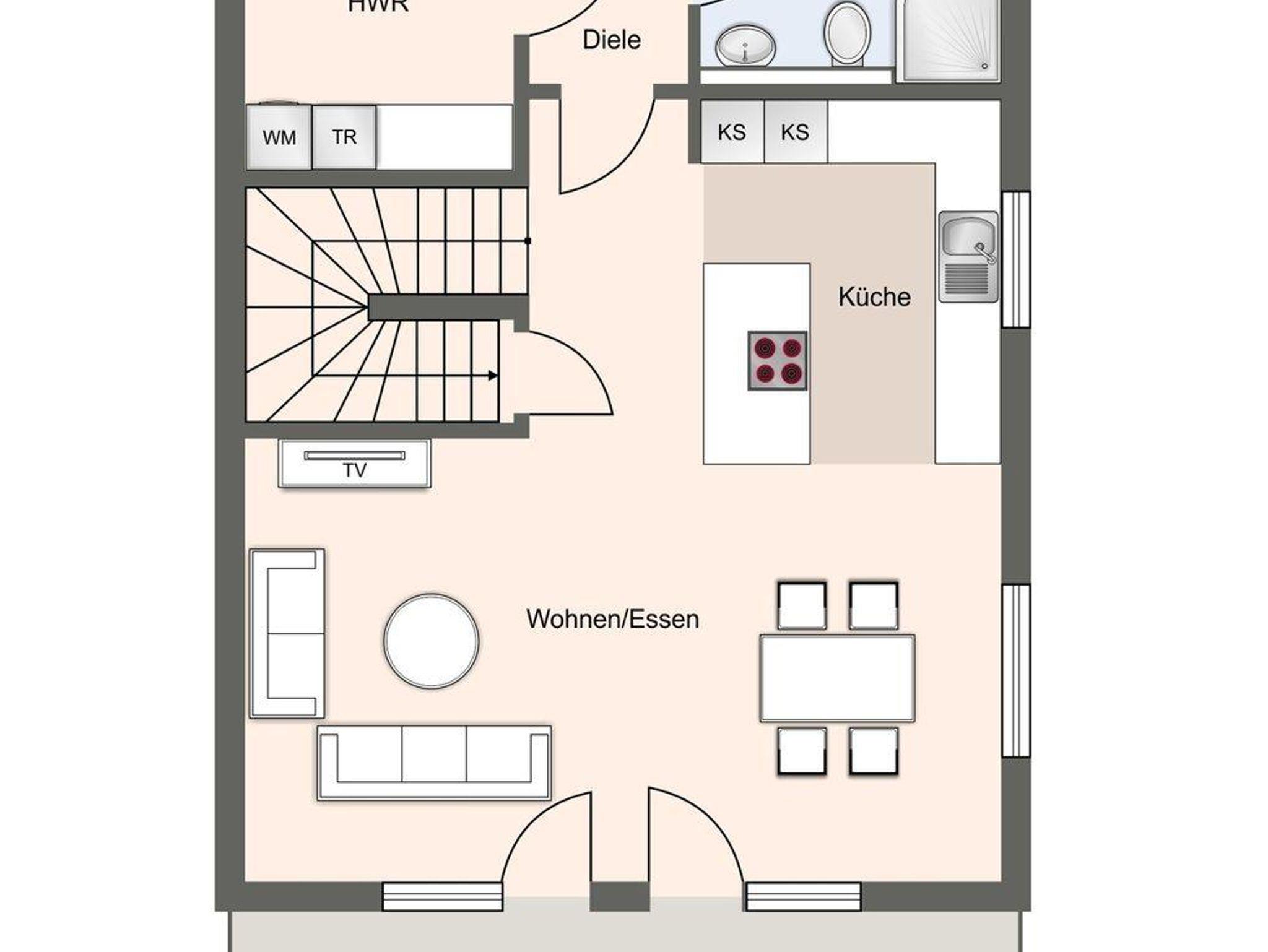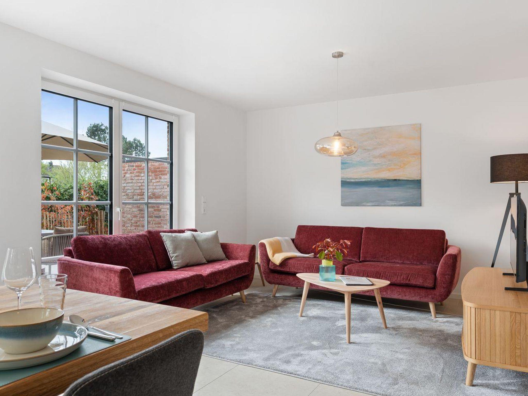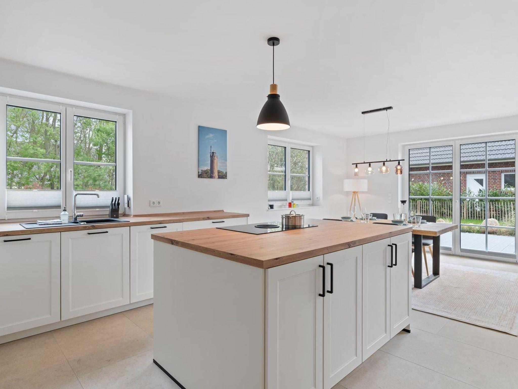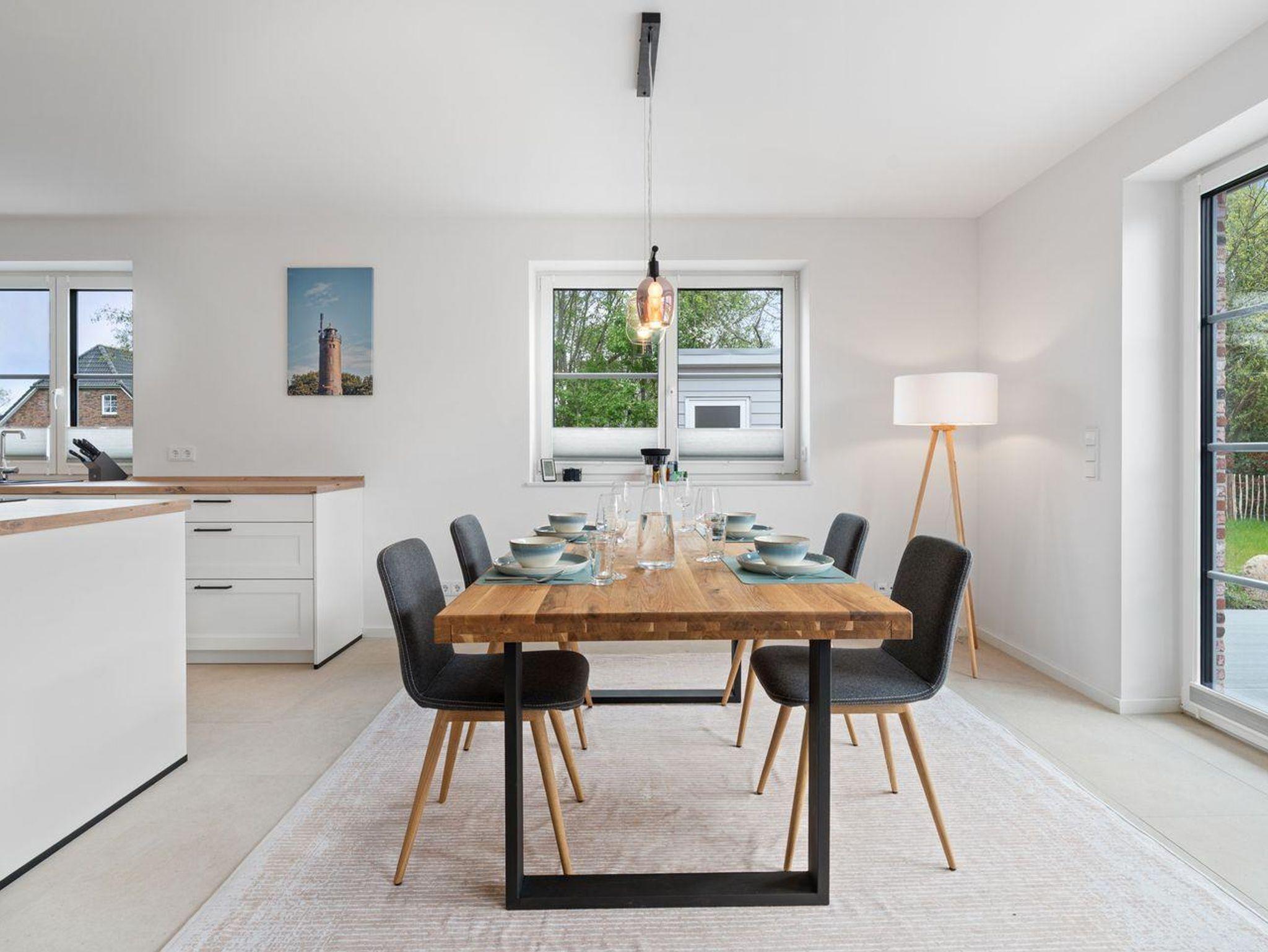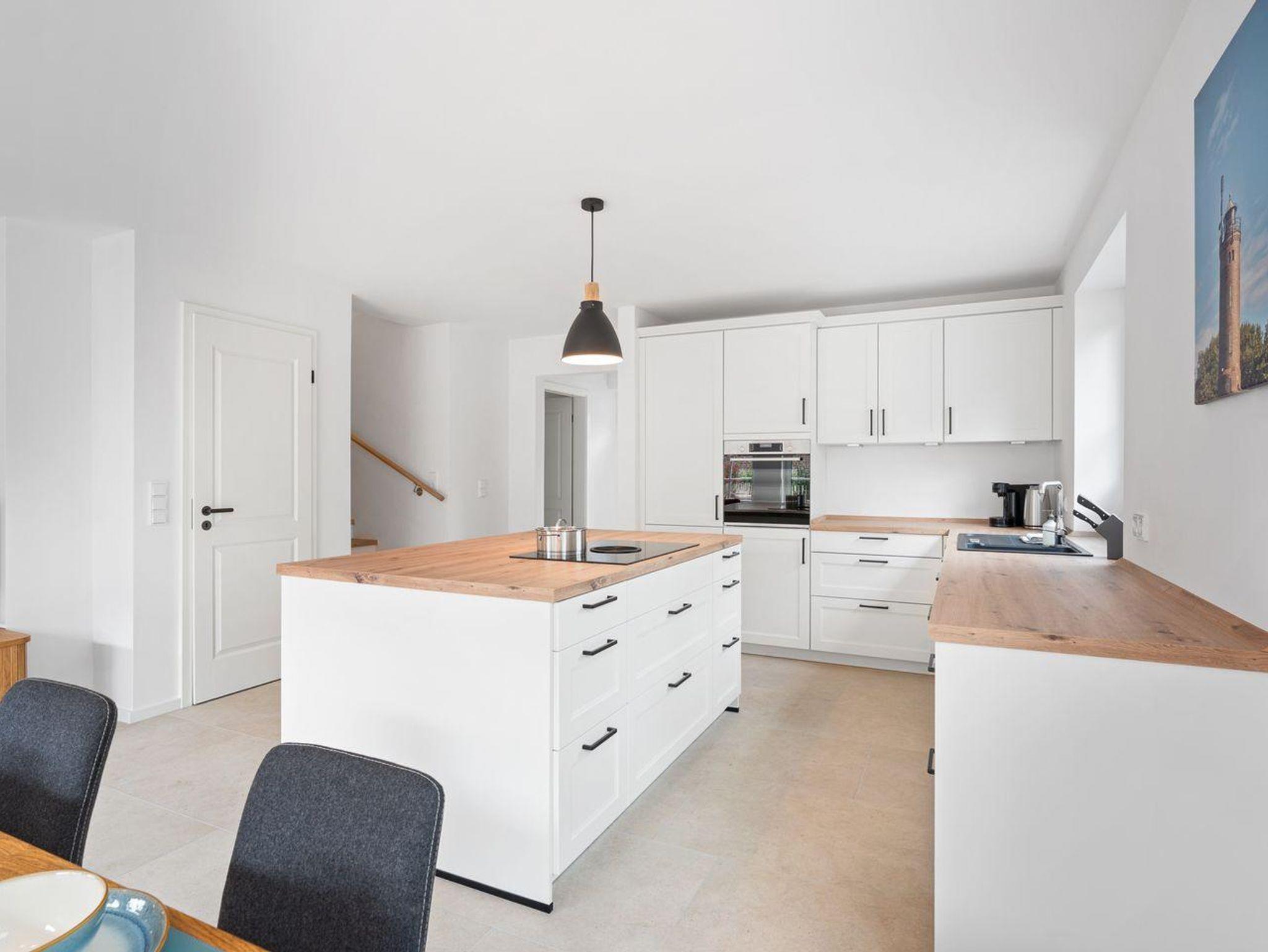 Das Herzstück der Unterkunft ist die offene Küche, die harmonisch mit dem Wohnzimmer verbunden ist und zum gemeinsamen Kochen und Entspannen einlädt. Die moderne Küche ist mit einem Induktionsherd, Backofen, Kühlschrank mit Gefrierfach und Geschirrspüler ausgestattet. Ein Wasserkocher und eine Kaffeemaschine sorgen für den perfekten Start in den Tag