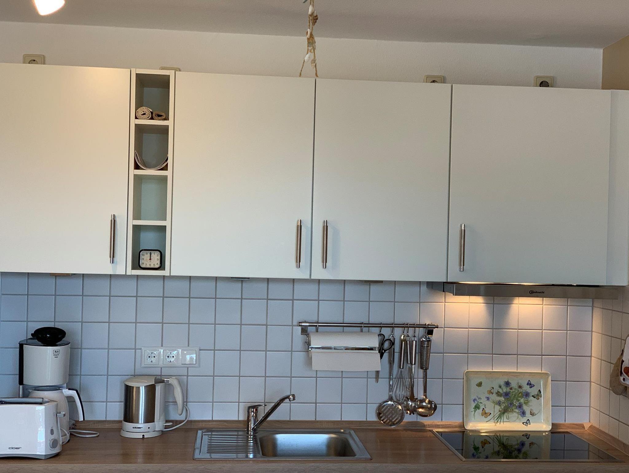 Wohnzimmer: Schlafcouch (160 x 200 cm) mit einer Tonnentaschenfederkernmatrtze, Couchtisch, Sessel, Stehlampe, neue Direktheizung, Rolltisch, Tischlampe, TV-Tisch, Kabel-TV, Stereoanlage mit CD-Player, Schrank, Vitrine, Esstisch, 3 Stühle, neue Küche mit Ceranfeld, Backofen, Dunstabzugshaube, Kühlschrank mit zwei Gefrierfächern, Spülmaschine, Mikrowelle, Kaffeemaschine, Wasserkocher, Toaster, Handmixer, Geschirr, Kochtöpfe
