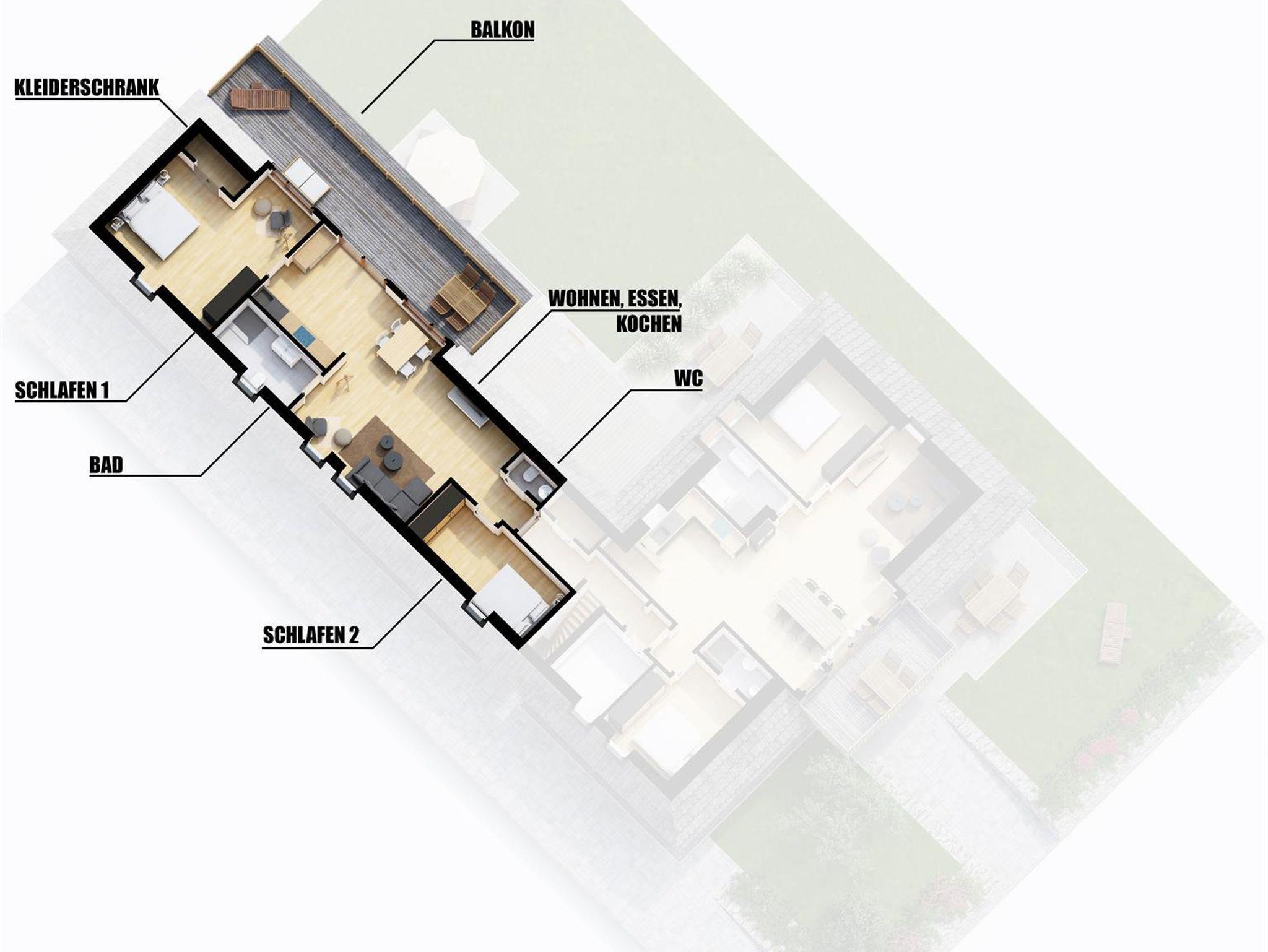 Sie verfügt über 2 Schlafzimmer mit Doppelbetten (180cm x 200cm) sowie einem ausziehbaren Schlafsofa für 2 Personen (140cm x 200cm). 1 Bad mit Dusche und WC, ein separates Gäste-WC, einer großen, modernen und vollausgestatteten Küche.