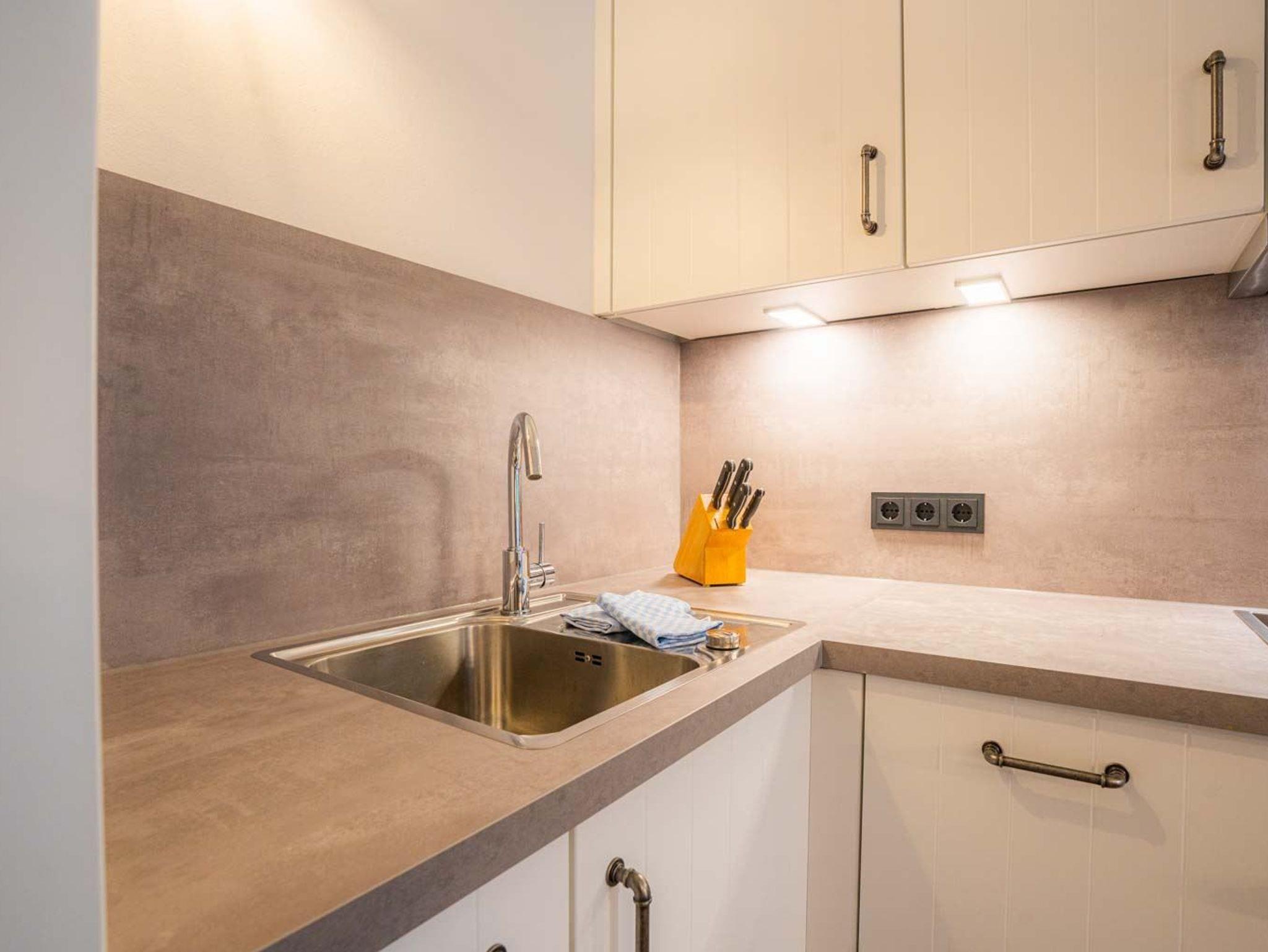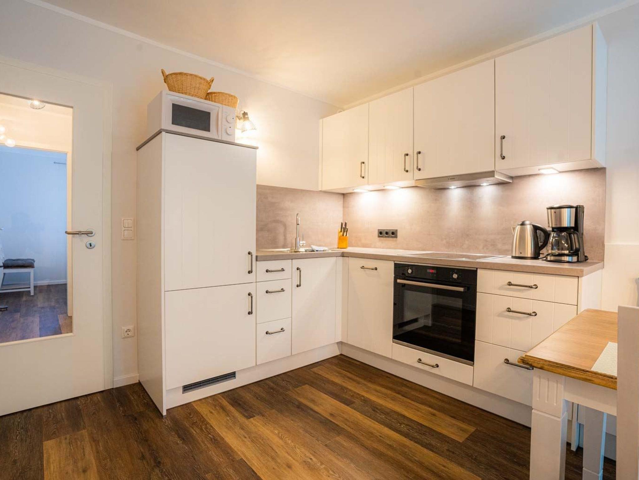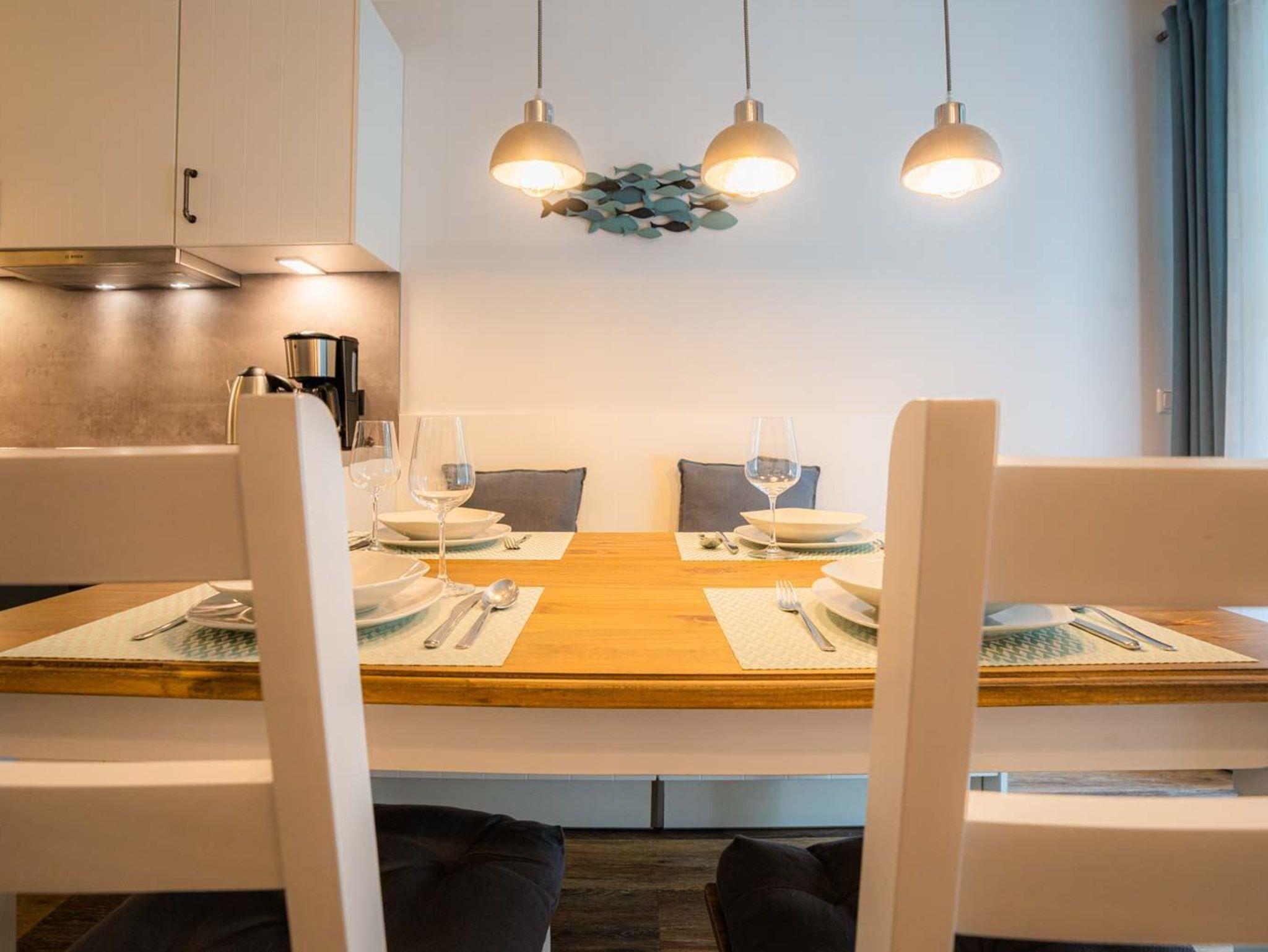 Wohnzimmer mit Ecksofa, großem 4K-Smart-TV (Sat), Esstisch mit 2 Stühlen und gemütlicher Sitzbank für 2 Personen sowie direktem Zugang zum möblierten Balkon nach Süden. Offene Küche mit Backofen, Mikrowelle, Kühl-Gefrier-Kombination, Geschirrspüler und elektrischem Grill für den Balkon.