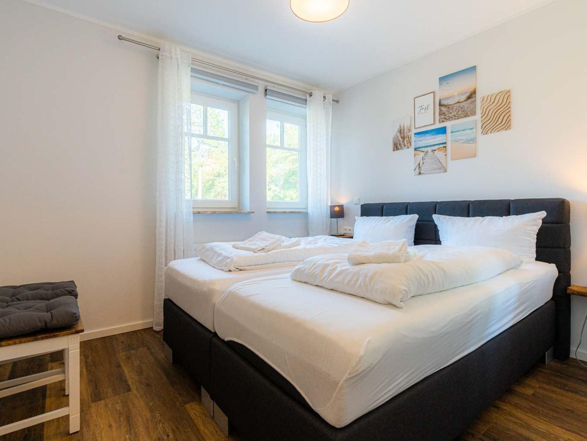 1. Schlafzimmer mit Doppelbett (2x 80x200cm), Kleiderschrank mit Spiegel und Stuhl.