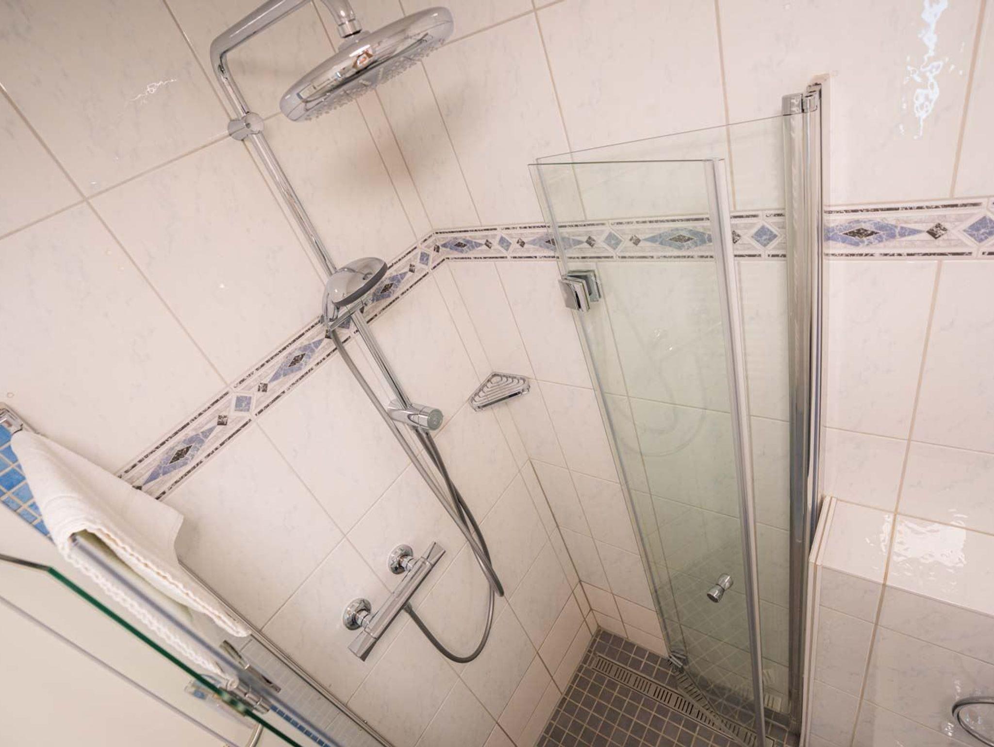 Badezimmer (Duschbad) mit bodengleicher Regen-Dusche, WC, Bidet, Handtuchwärmer und Föhn.