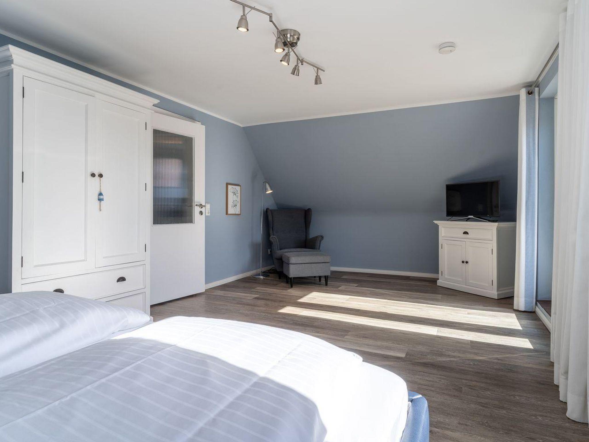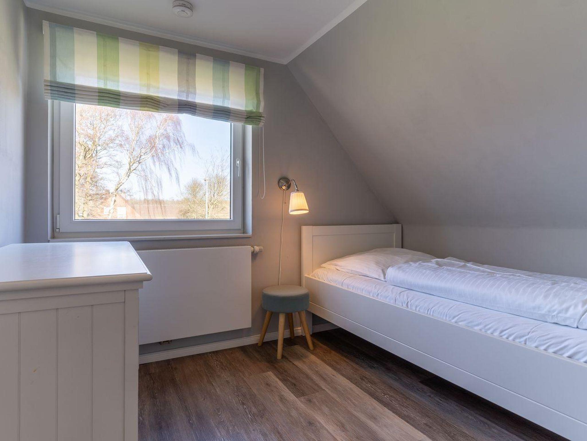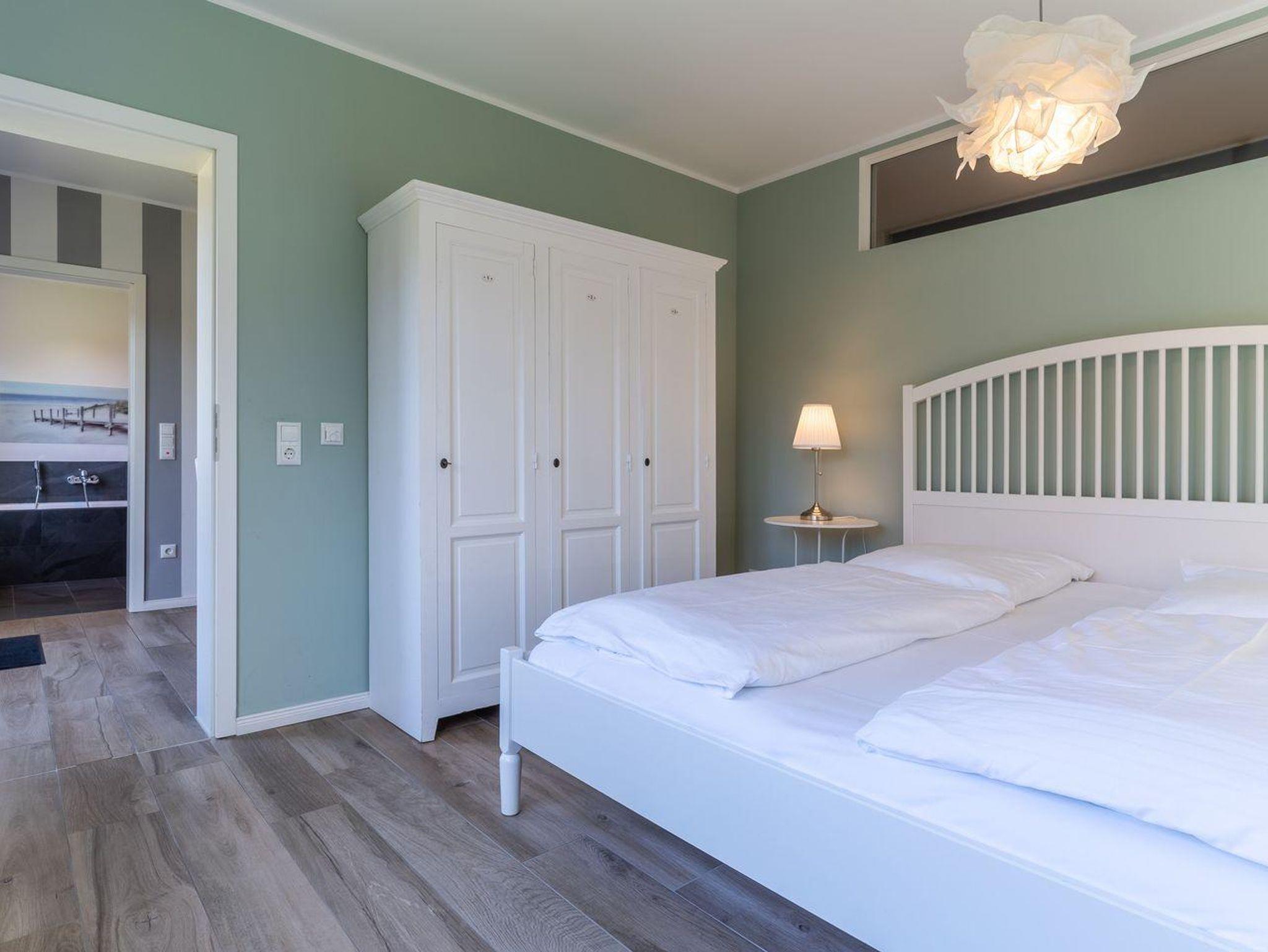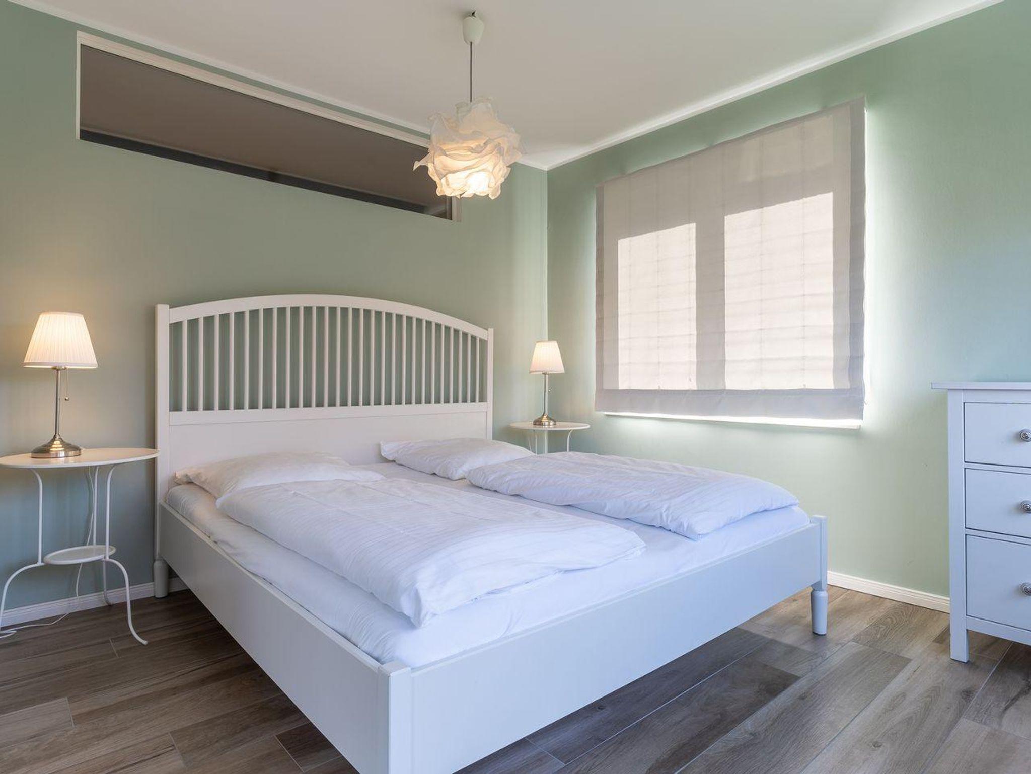 Über eine Holztreppe gelangt man in das Obergeschoss. Die drei Schlafzimmer, zwei mit je einem Doppelbett und eines mit einem Einzelbett sorgen für ruhmvolle Erholung. Darüber hinaus befindet sich im Obergeschoss ein weiteres Duschbad. Von einem der geräumigen Doppelschlafzimmer gelangt man auf eine sonnige Dachterrasse und kann den Tag mit vollem Lichteinfluss starten.
