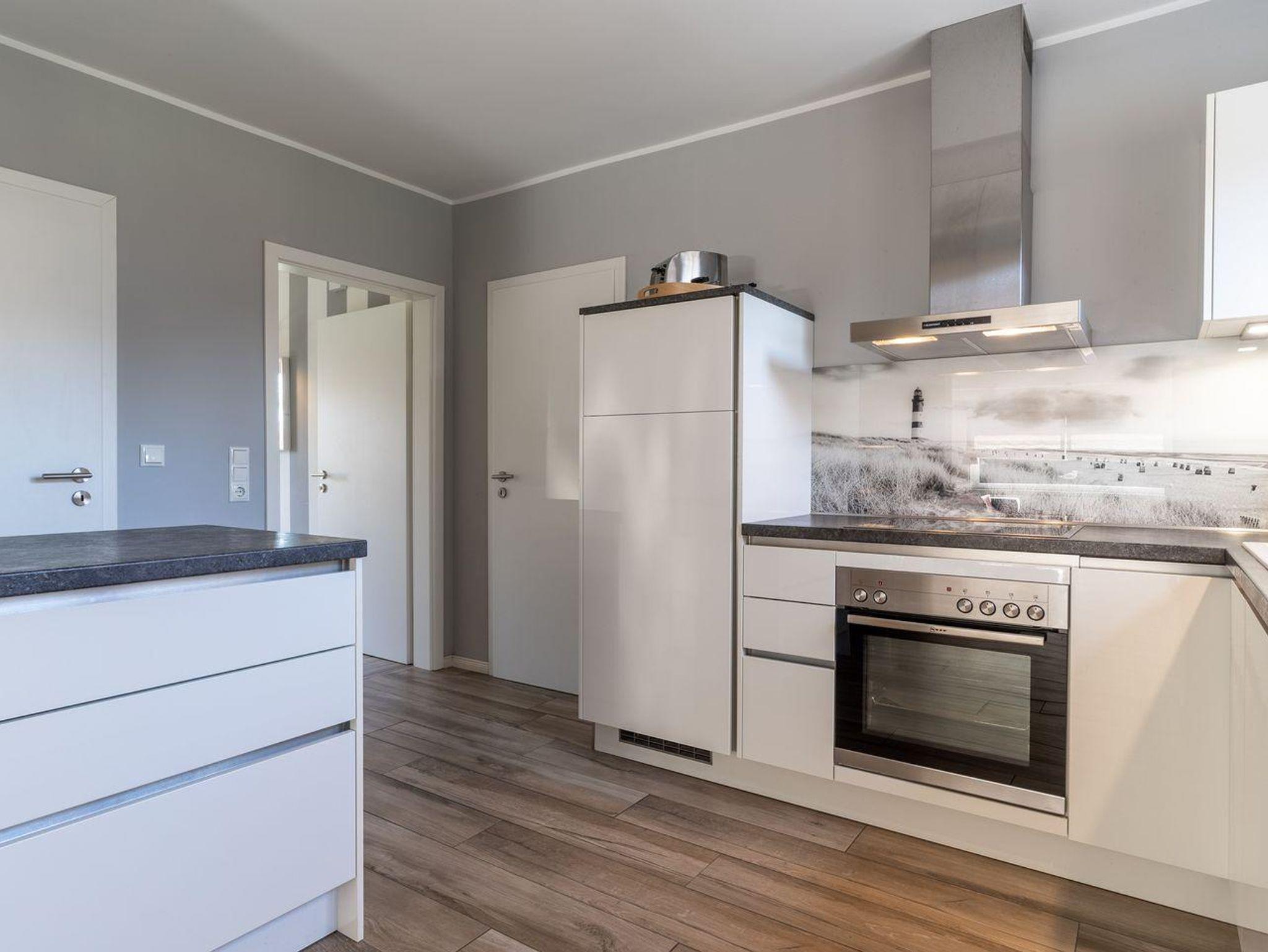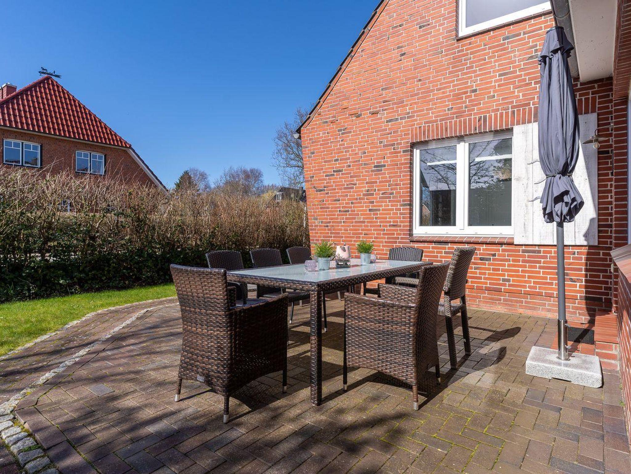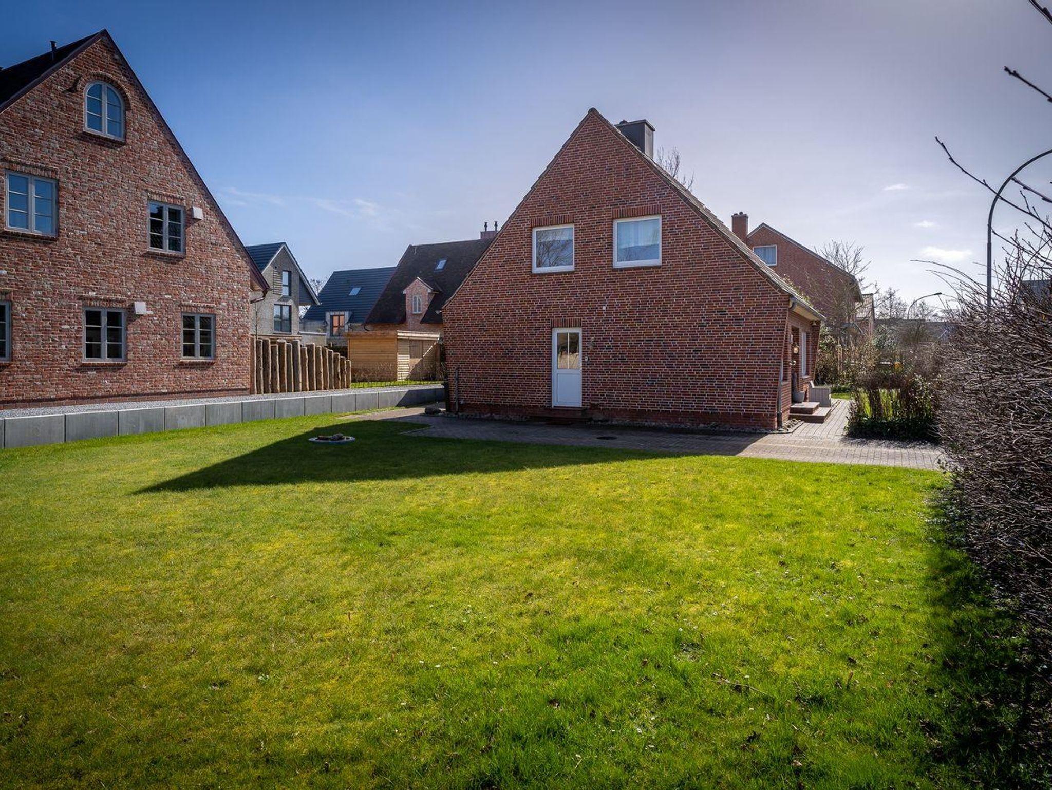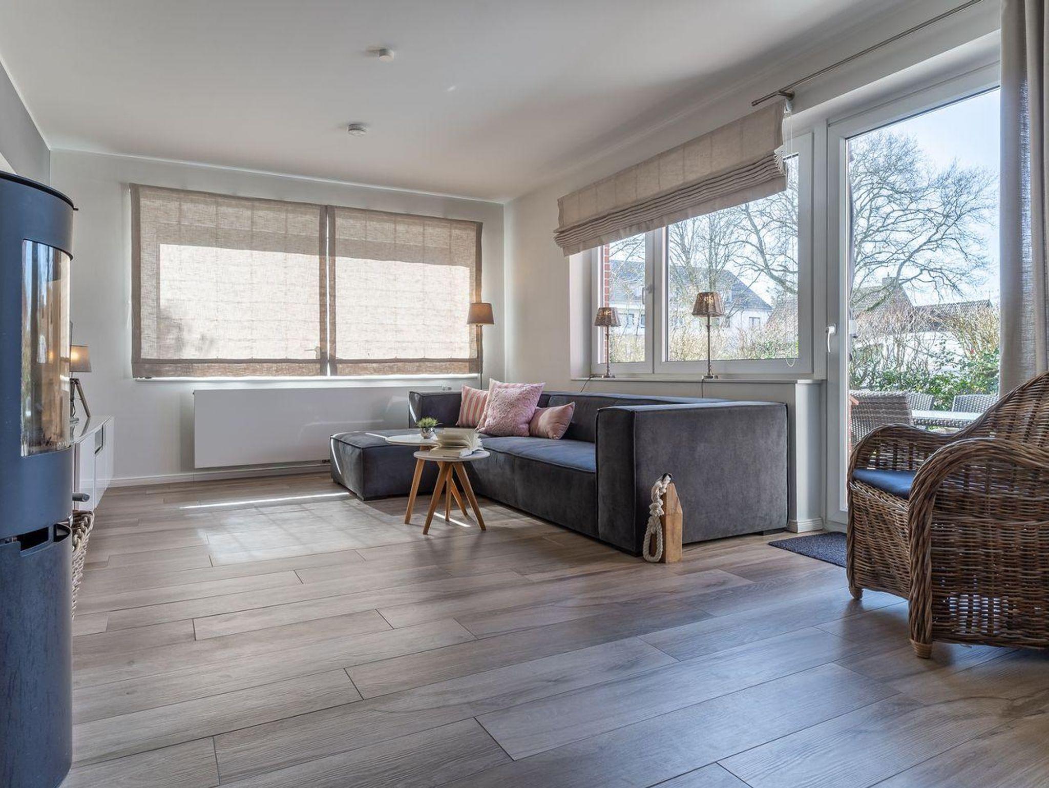 Modernes Strandhaus in St. Peter-Ording mit Kamin und sonniger Dachterrasse, ideal für entspannte Urlaubstage.