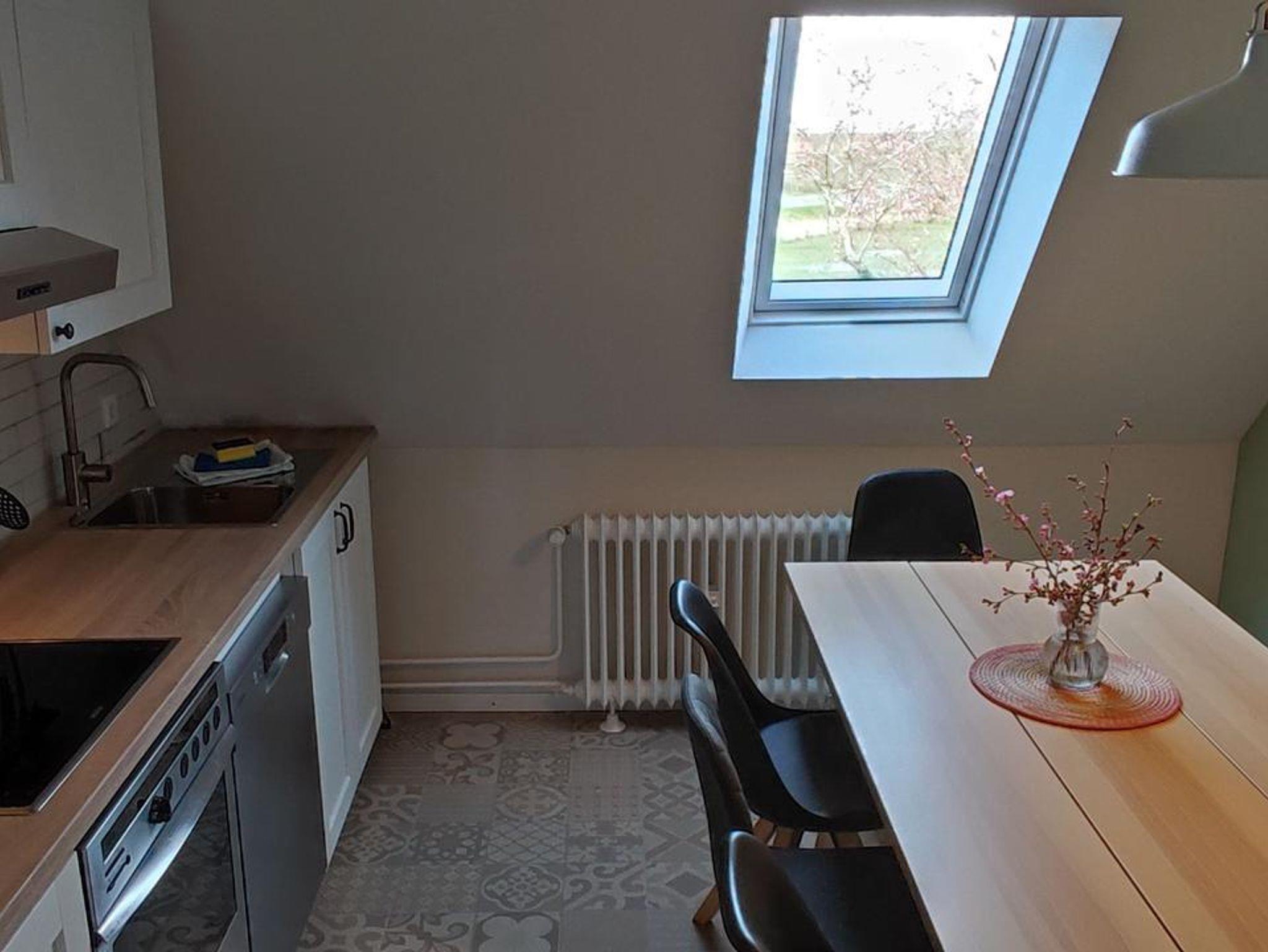 • Landhausküche mit großem Esstisch und 5 Stühlen, Ceranfeld, Geschirrspüler, Backofen, Kühlschrank, separatem Gefrierfach, Kaffeemaschine, Wasserkocher, Toaster...