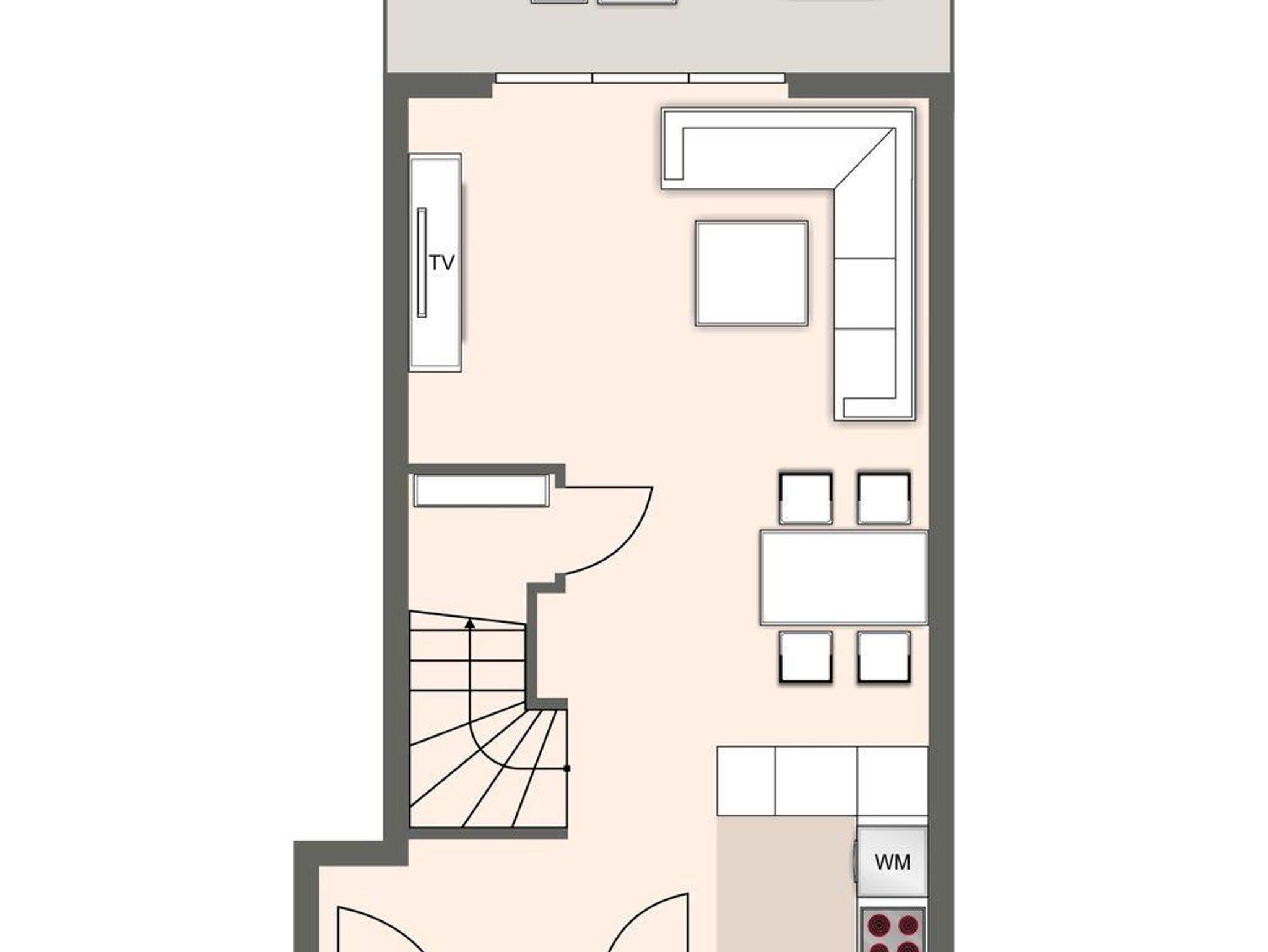 Erdgeschoss: Wohnzimmer mit Küche, Duschbad, Abstellraum.