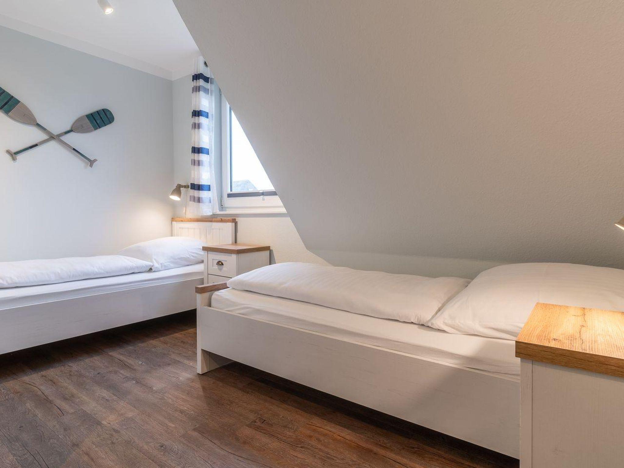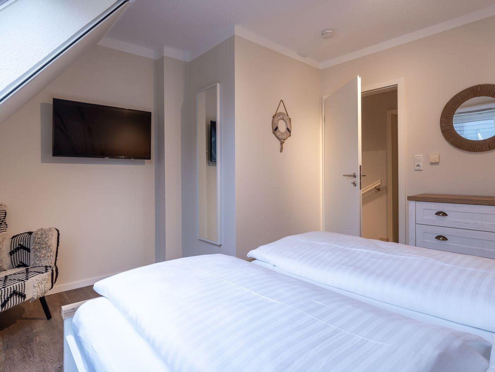 Obergeschoss: 2 Schlafräume (1 Doppelbett + TV, 2 Einzelbetten).