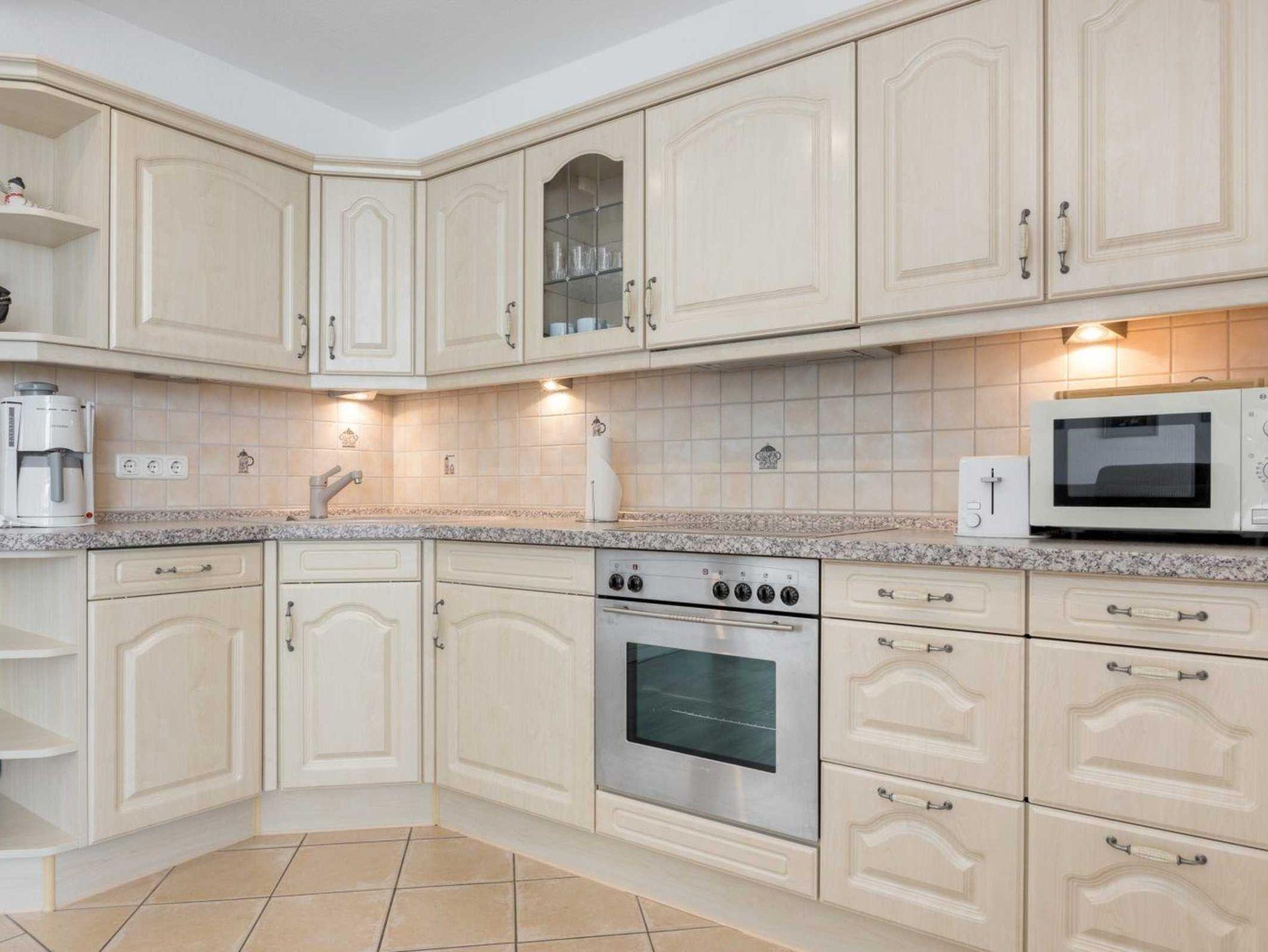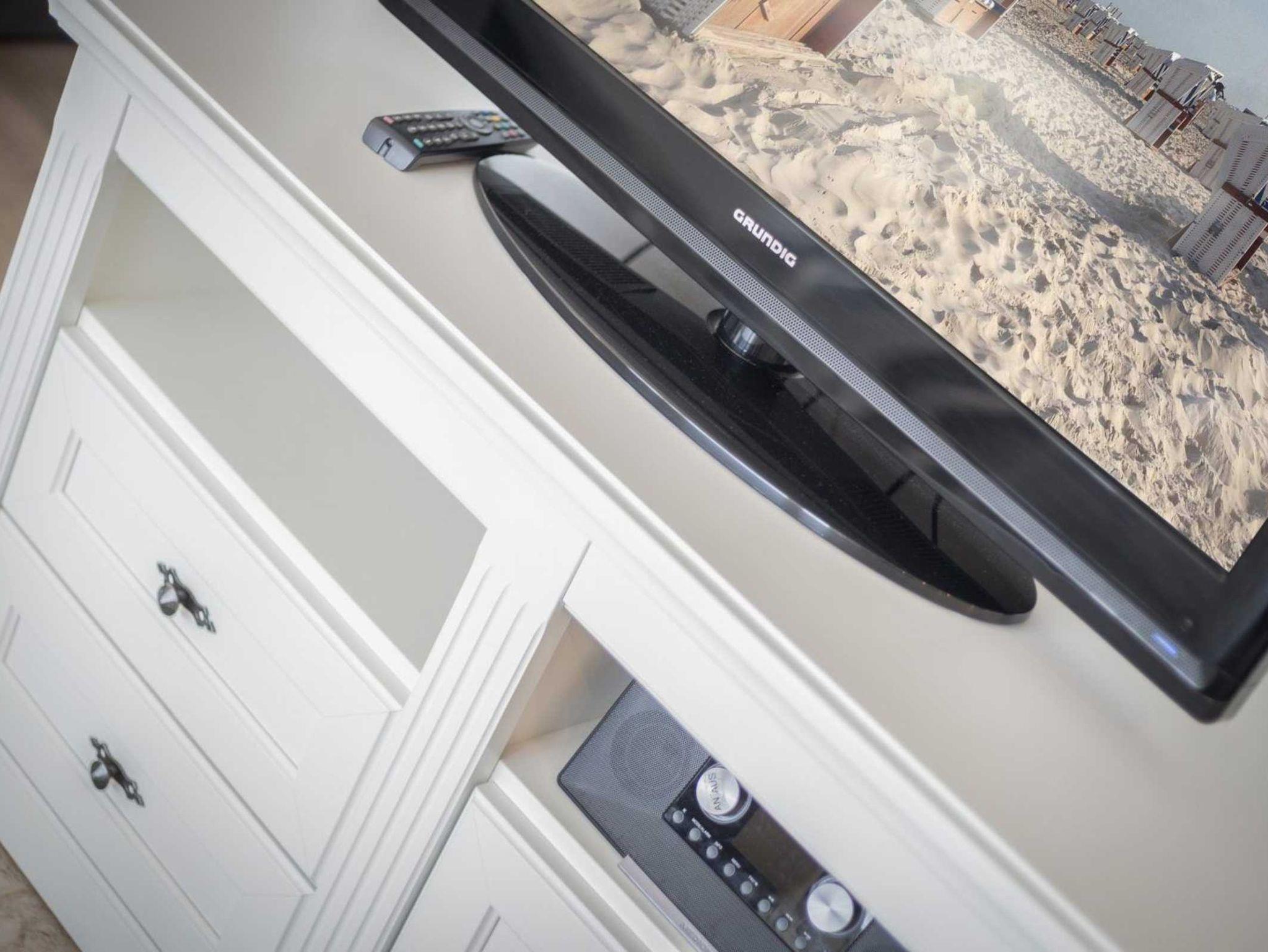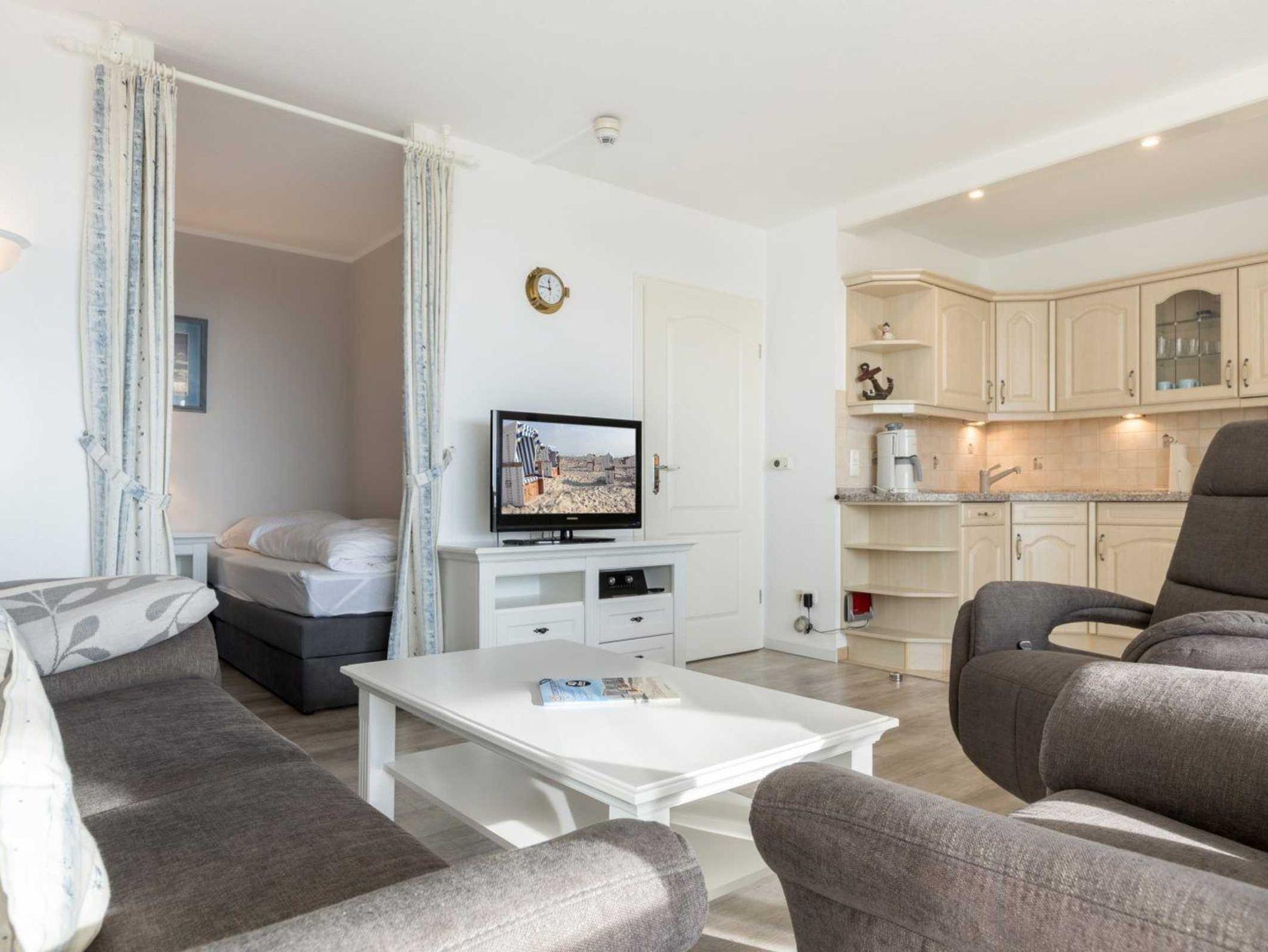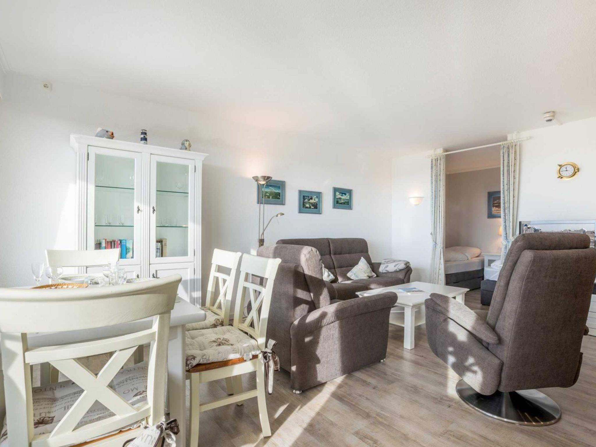 Wohnzimmer mit Sofa (3er), 2 Sesseln, Esstisch mit 4 Stühlen, TV (Sat) und Radio. Direkter Zugang zum möblierten Balkon nach Südwesten. Bei guter Sicht haben Sie einen tollen Ausblick auf den Westerhever Leuchtturm. Offene Küche mit Backofen, Mikrowelle, Geschirrsprüler und Kühlschrank ohne Gefrierfach.