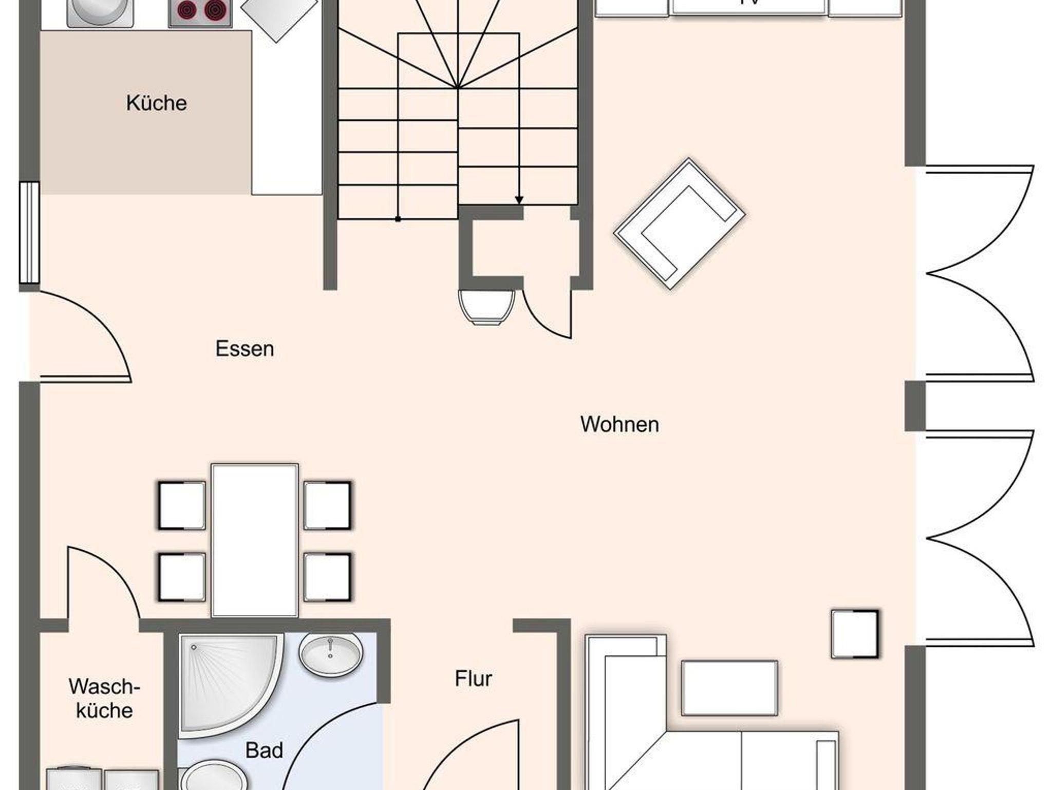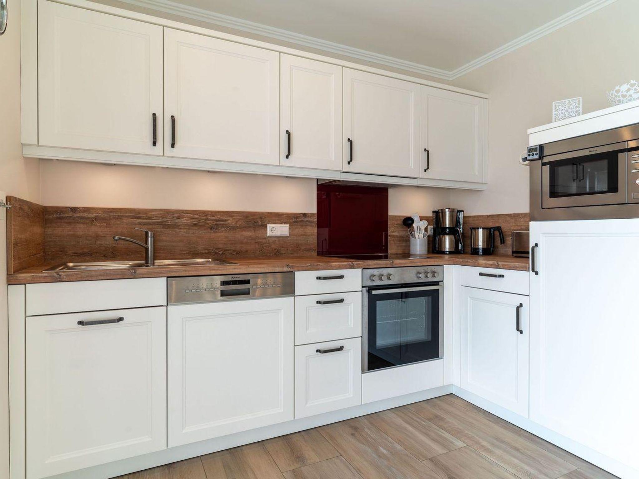 Die Küche ist voll ausgestattet mit hochwertigen Geräten. An den Wohnbereich schließen sich Flur, Hauswirtschaftsraum und ein Duschbad an.