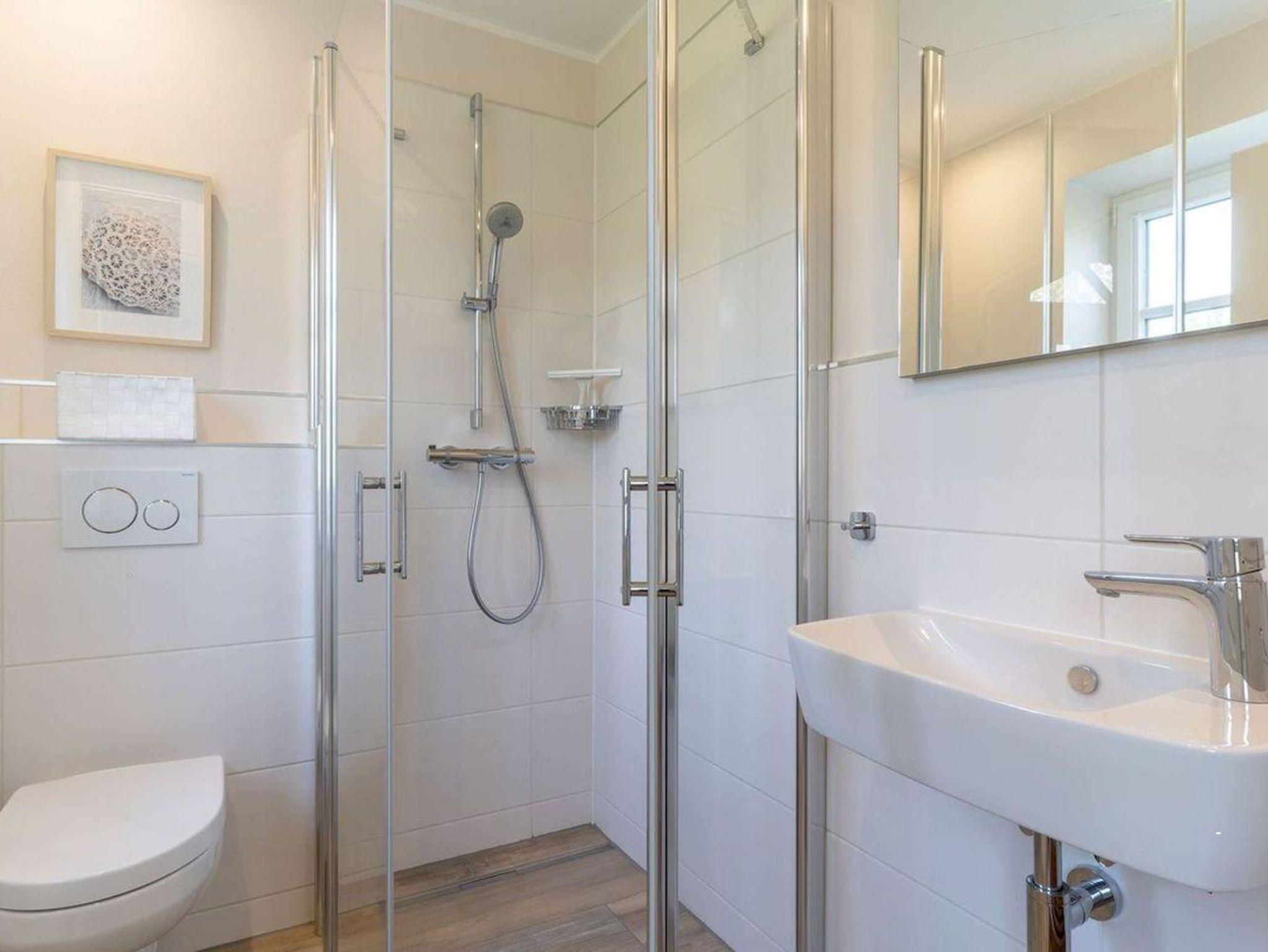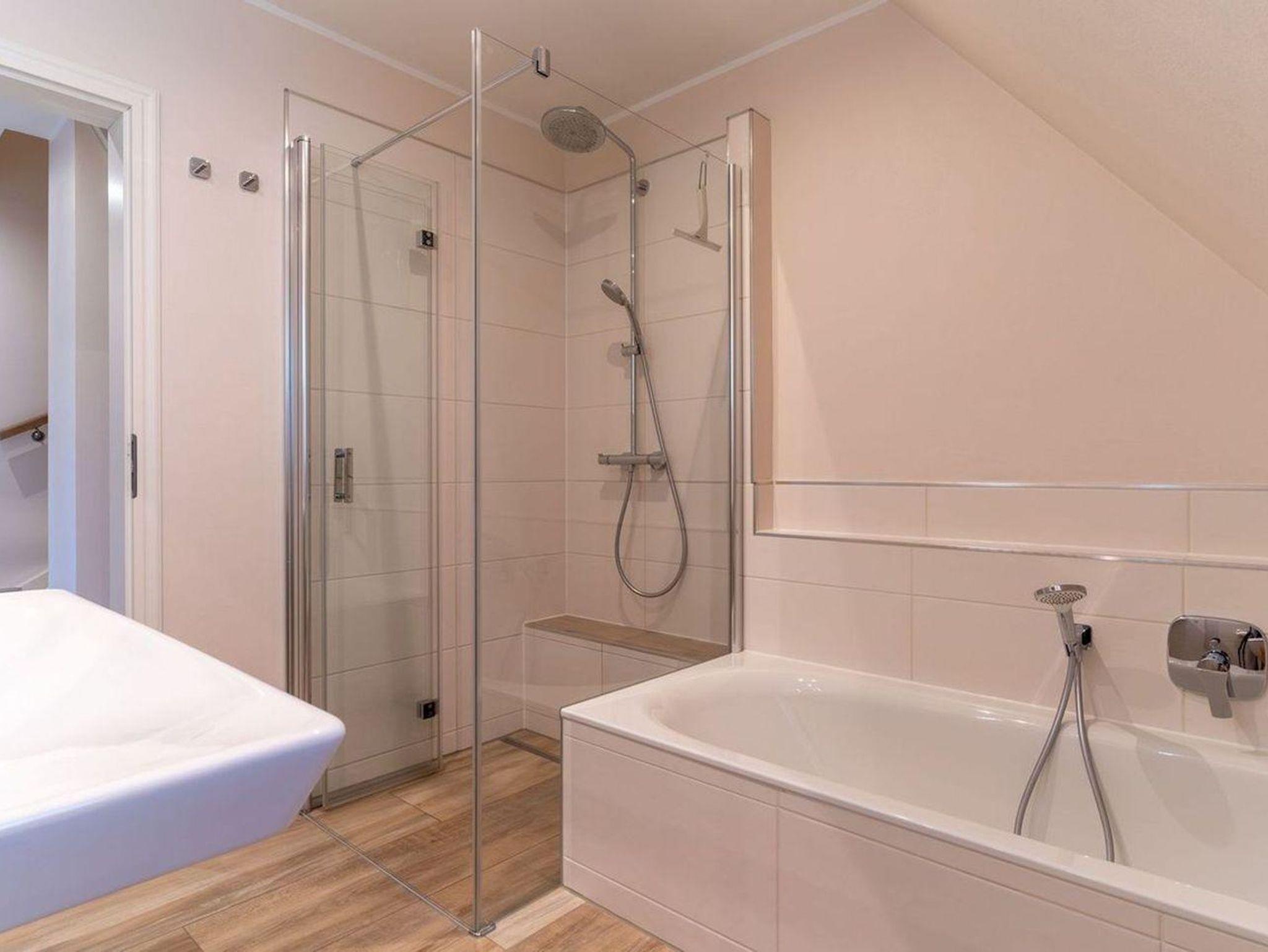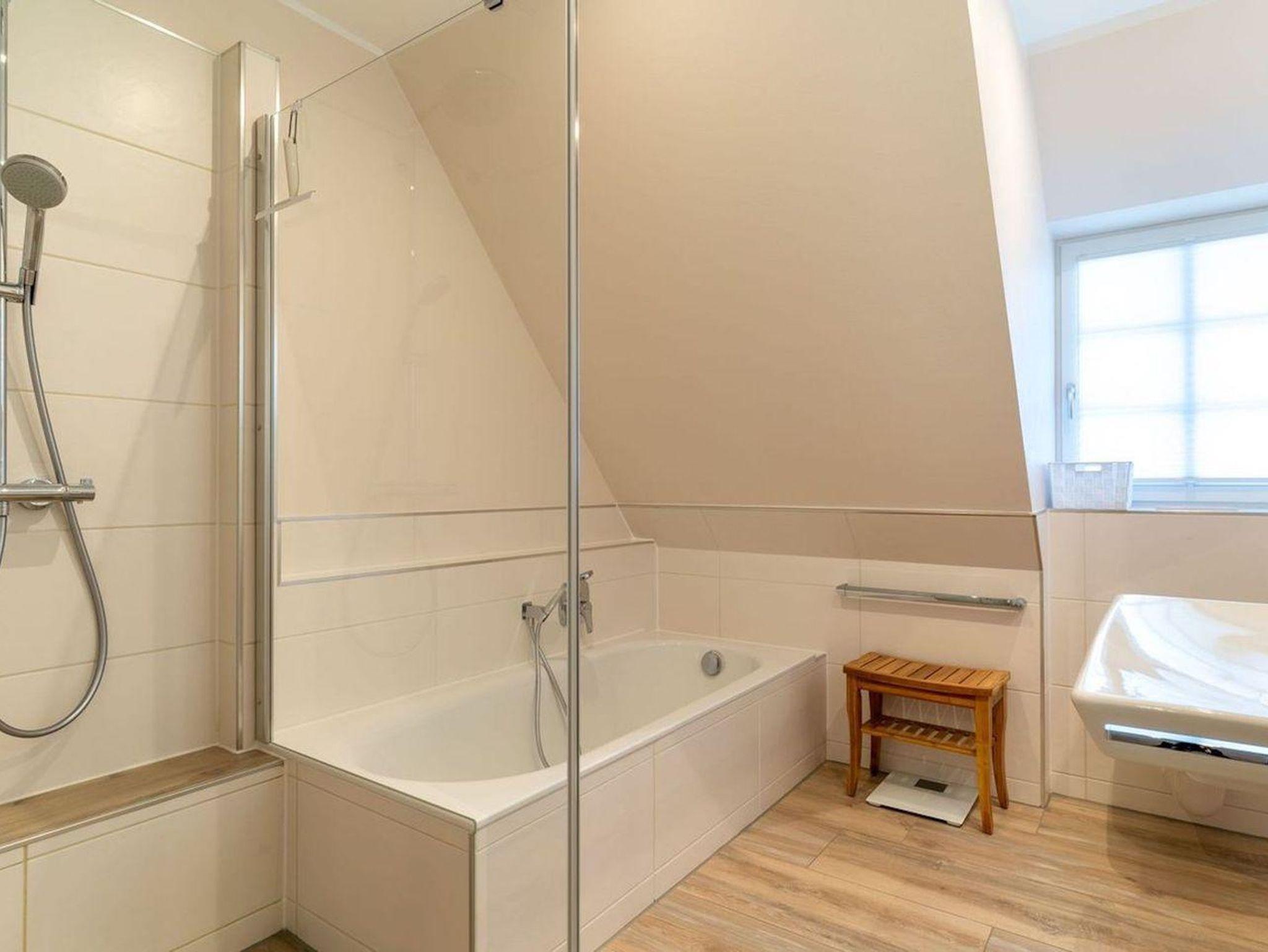 Darüber hinaus befindet sich im Obergeschoss ein weiteres, geräumiges Bad mit Dusche und Badewanne.