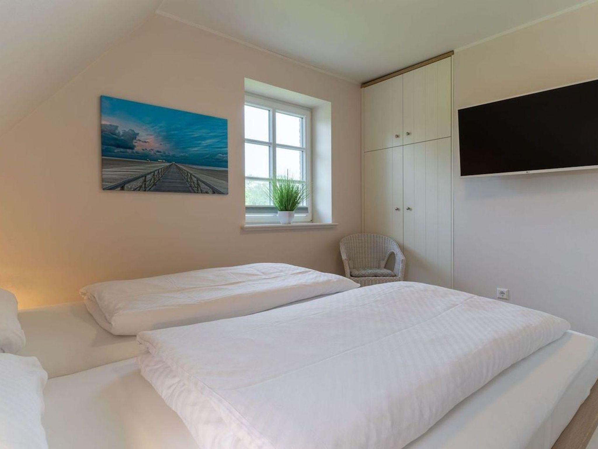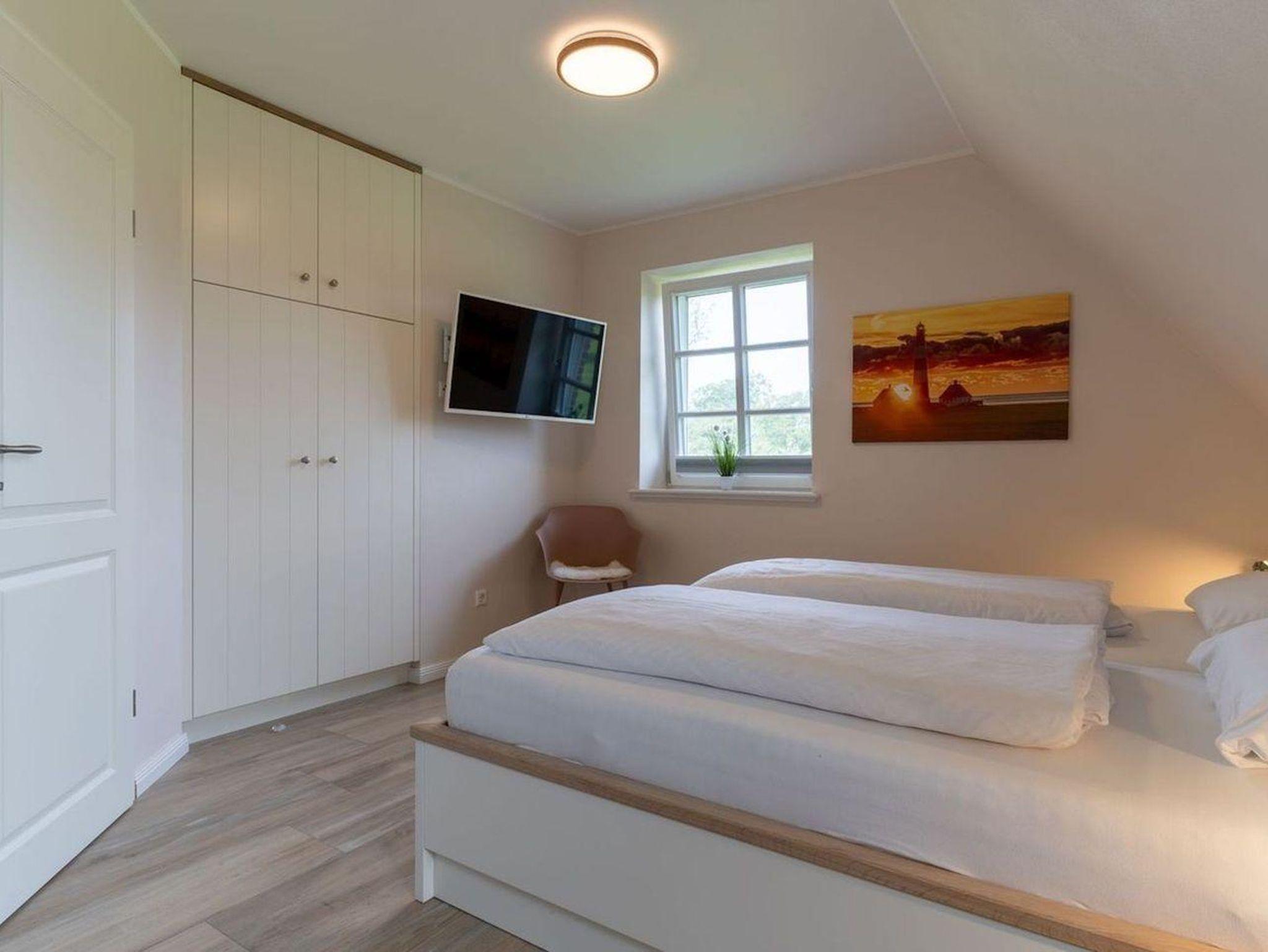 Über eine Holztreppe gelangt man in das Obergeschoss. Die beiden Schlafzimmer, jeweils mit einem Doppelbett sorgen für ruhevolle Erholung. Einbauschränke gewähren Ihnen hinreichend Ablageflächen.