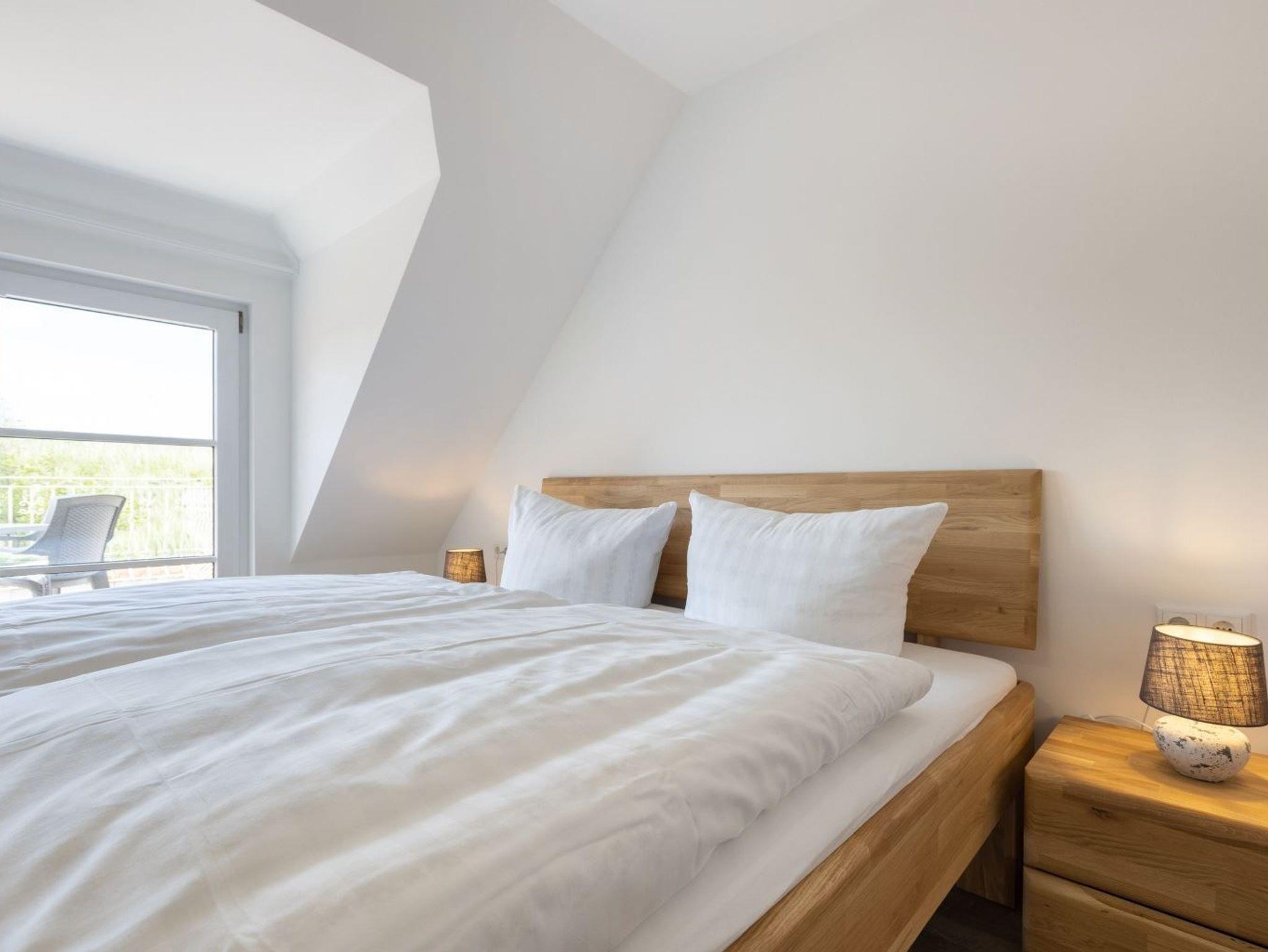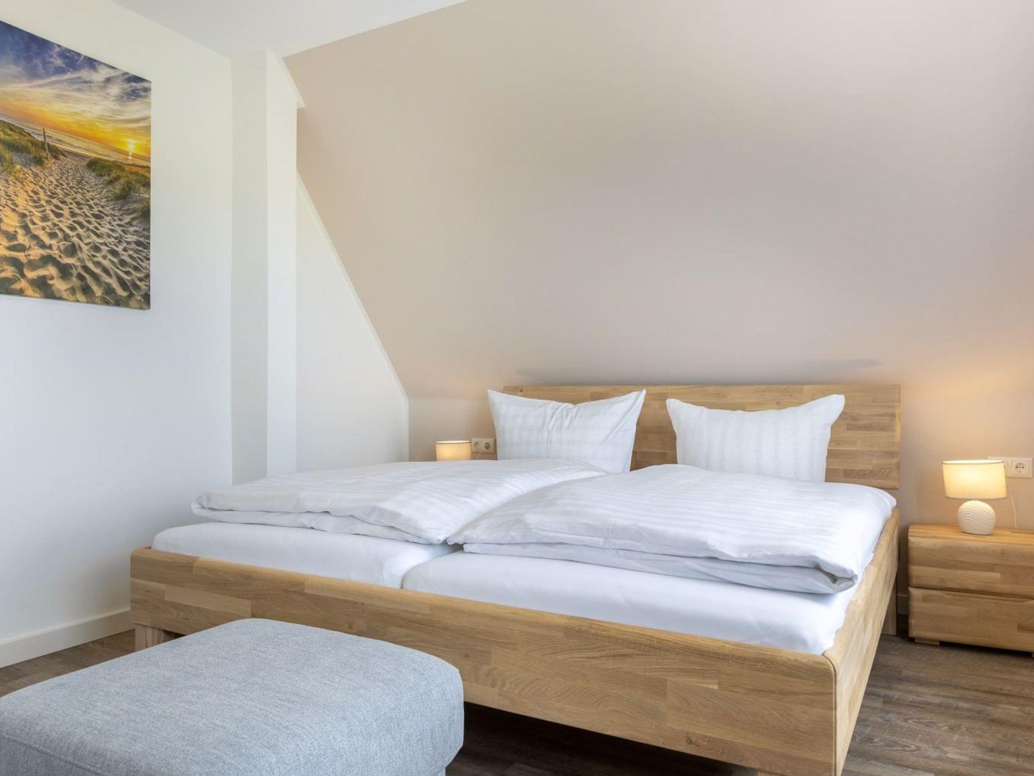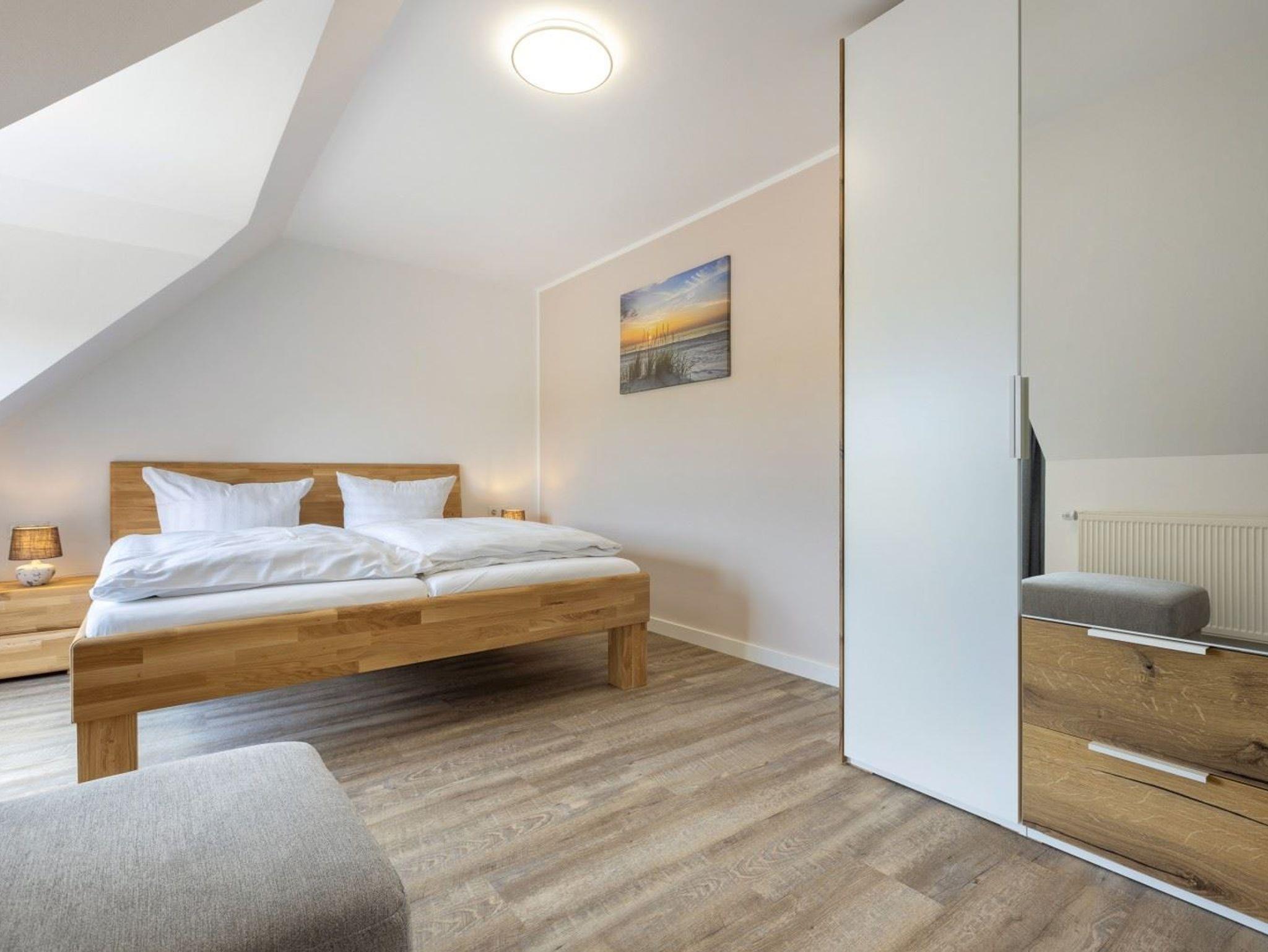 2. Schlafzimmer mit Doppelbett (2x 90x200cm), Kleiderschrank, Hocker und direktem Zugang zur möblierten Dachterrasse nach Westen mit Blick auf den Deich.