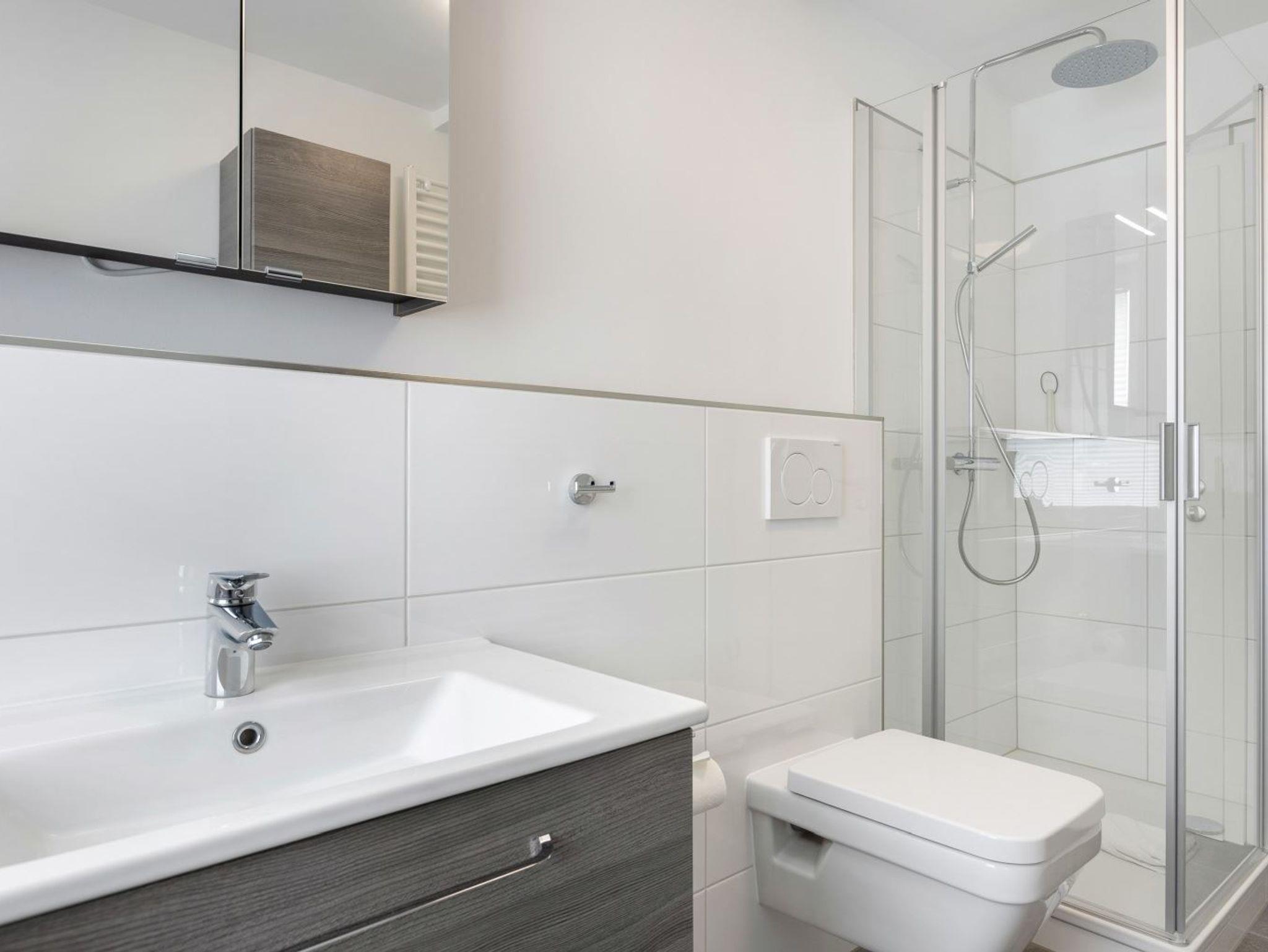 Badezimmer (Duschbad) mit Regen-Dusche, WC, Handtuchwärmer, Tageslicht und Föhn.