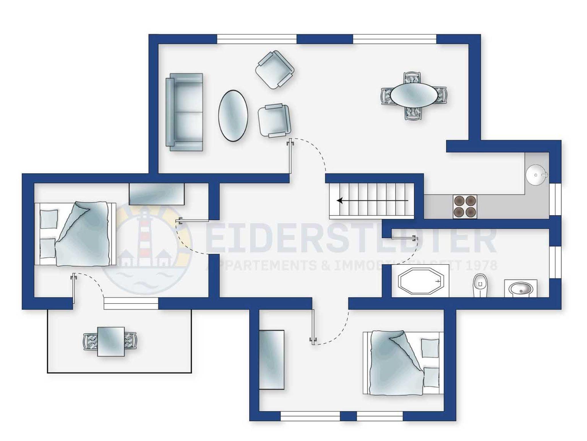 Gemütliche 3-Zimmer-Wohnung im Haus Everschop mit ca. 72 m² auf 2 Ebenen (EG, OG) für bis zu 4 Personen. In einmalig schöner Lage direkt am Deich im Ortsteil Ording in St. Peter-Ording. Das Meeresrauschen unmittelbar vor der Haustür, ideal für Ihren nächsten perfekten Nordsee-Urlaub.