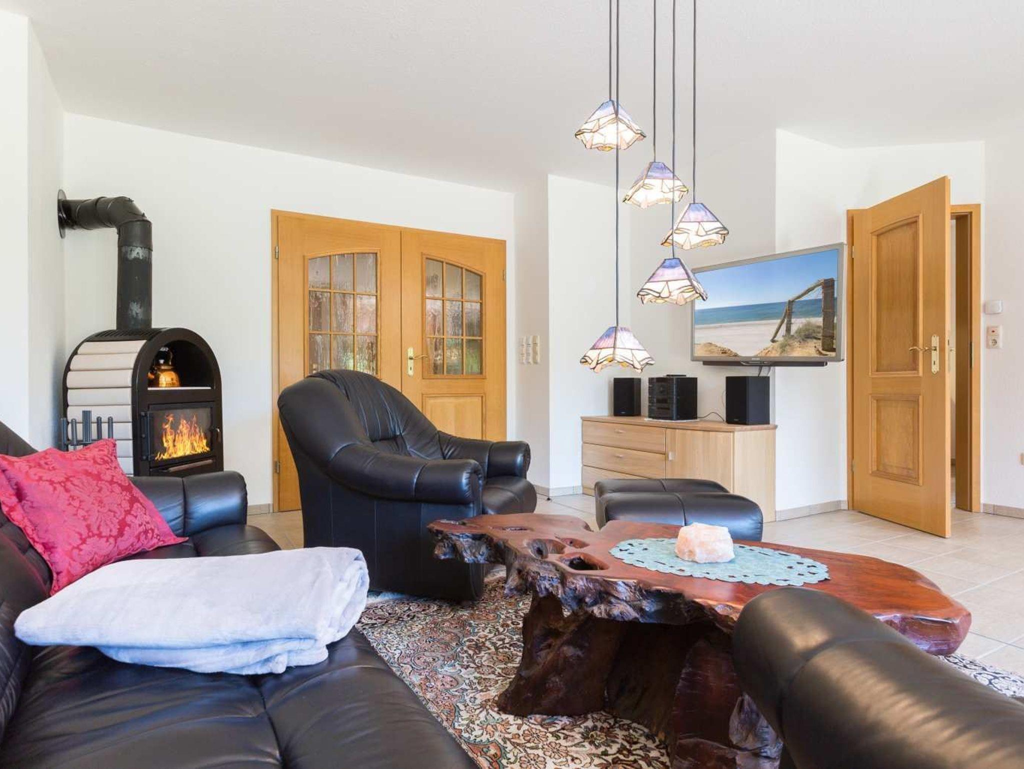 Gemütliches Wohnzimmer mit Kaminofen, Sofa, Sesseln, großem TV, Stereoanlage und Esstisch. Halboffene Küche, Schlafzimmer mit Doppelbett, Tageslichtbad mit Badewanne, WC und Bidet. Südterrasse mit Strandkorb.