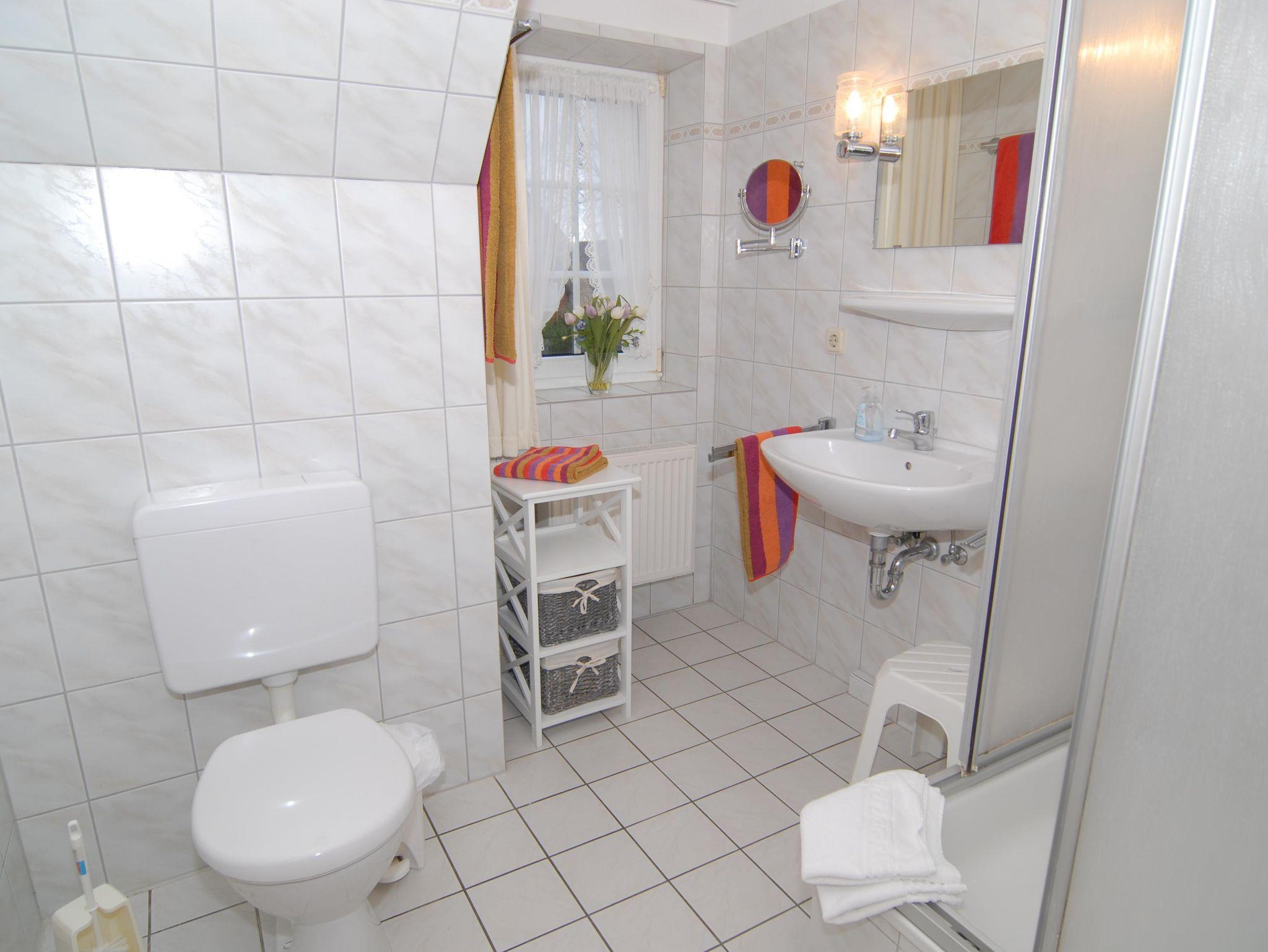 Bad: Dusche, Waschbecken, WC, Regal, Hocker, Duschkabine, Kosmetikspiegel