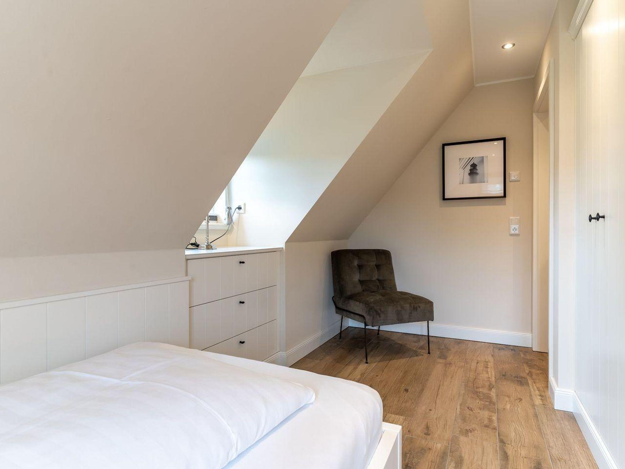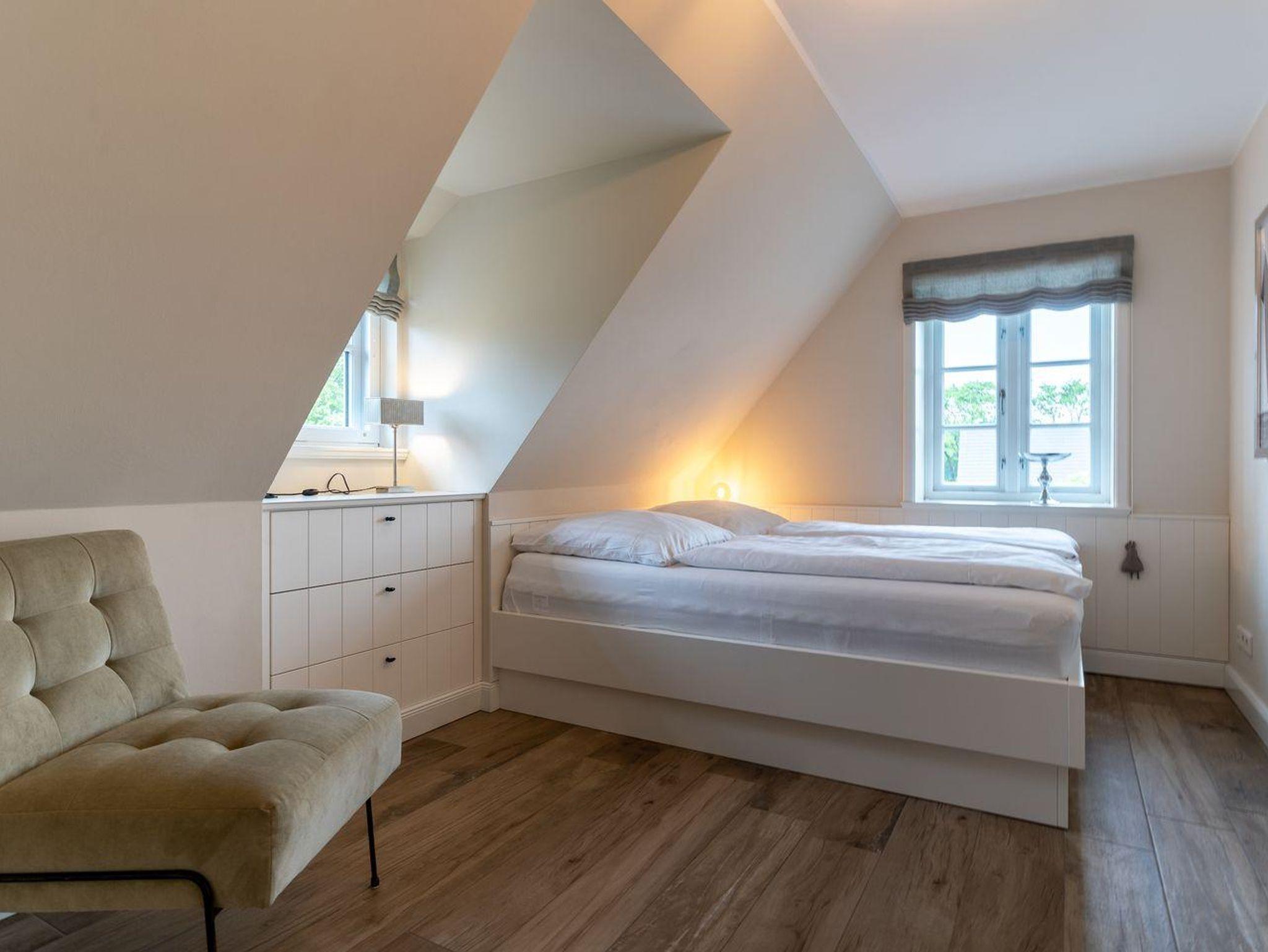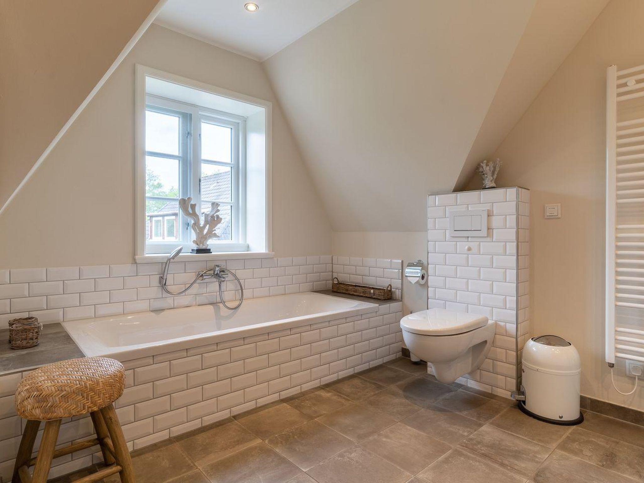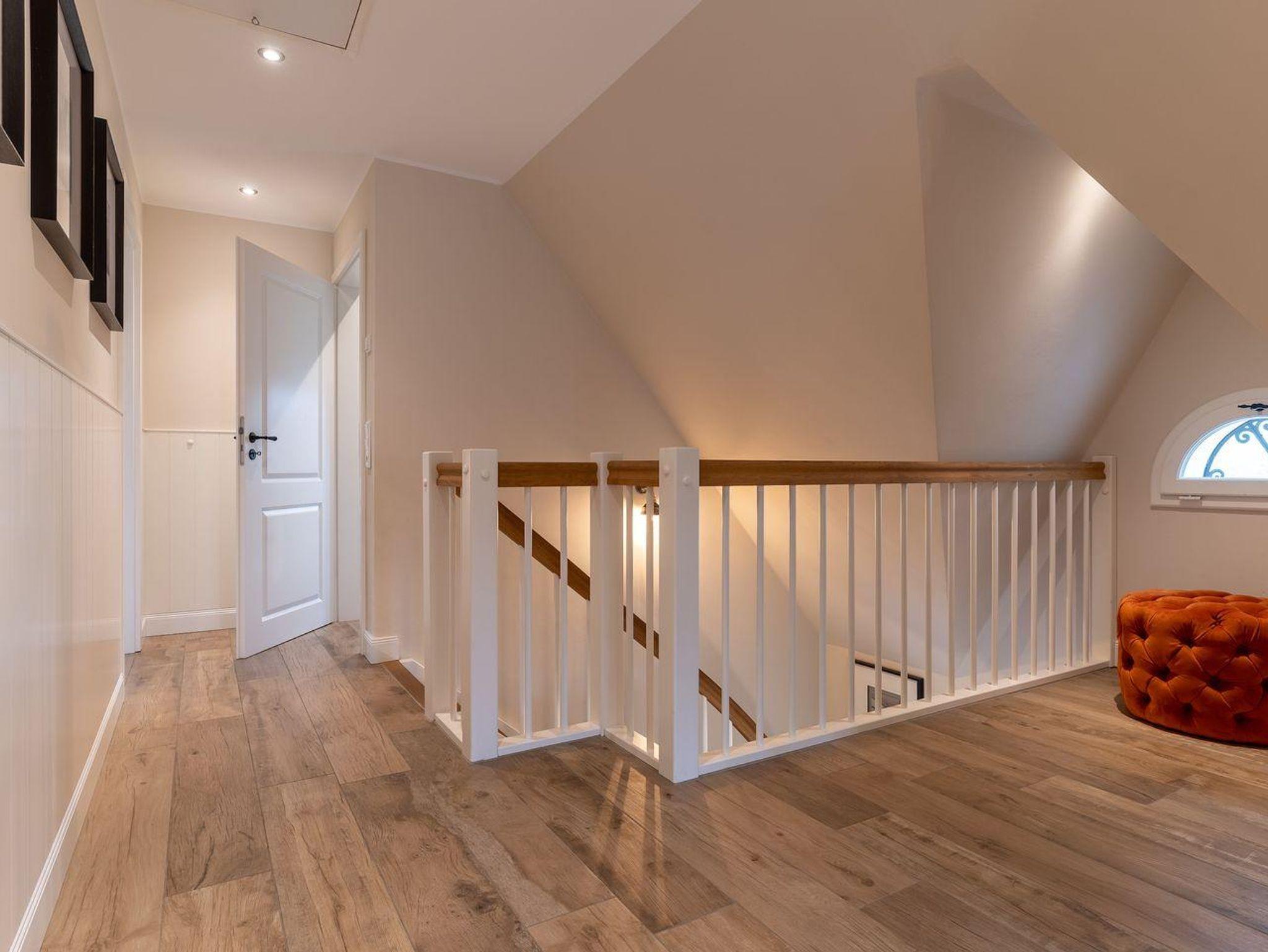 Eine Holztreppe führt Sie ins Obergeschoss, wo zwei weitere stilvoll eingerichtete Schlafzimmer mit komfortablen Doppelbetten (1x 200 x 210 cm + TV und 1x 160 x 200 cm) und ein weiteres Schlafzimmer mit einem Einzelbett (1x 100 x 200 cm) auf Sie warten. Ein geräumiges Badezimmer mit Dusche und Badewanne sorgt für zusätzlichen Komfort.