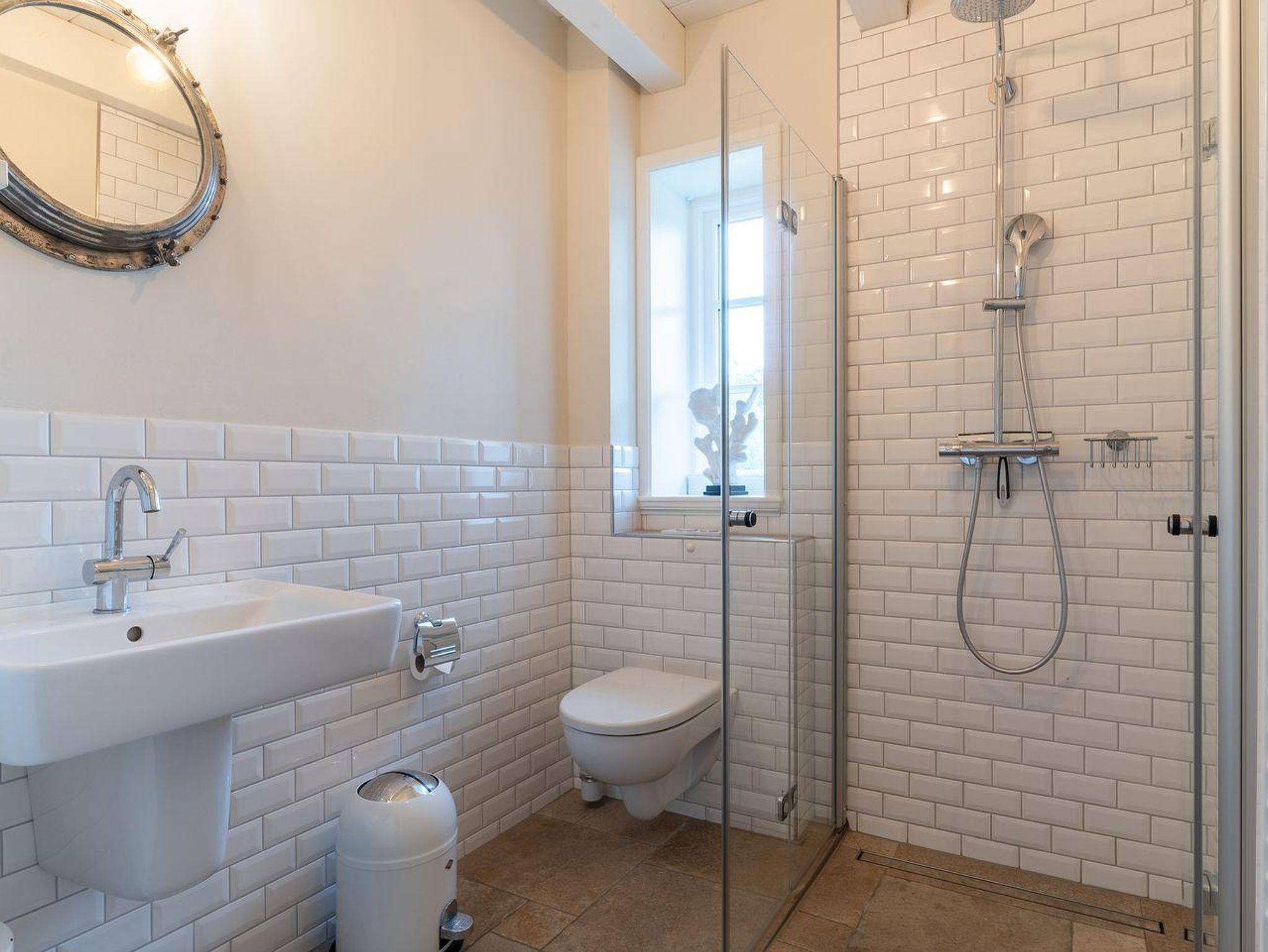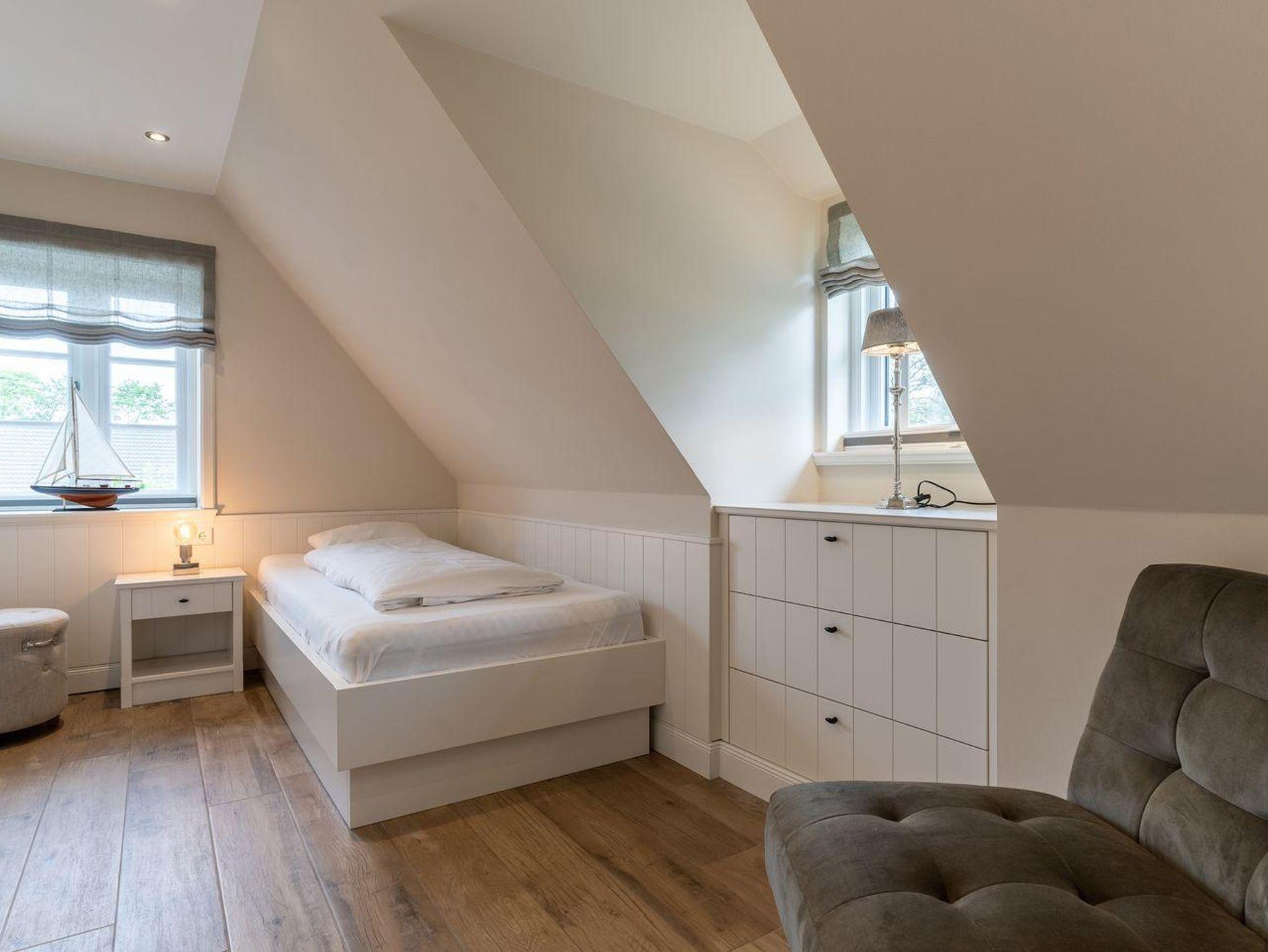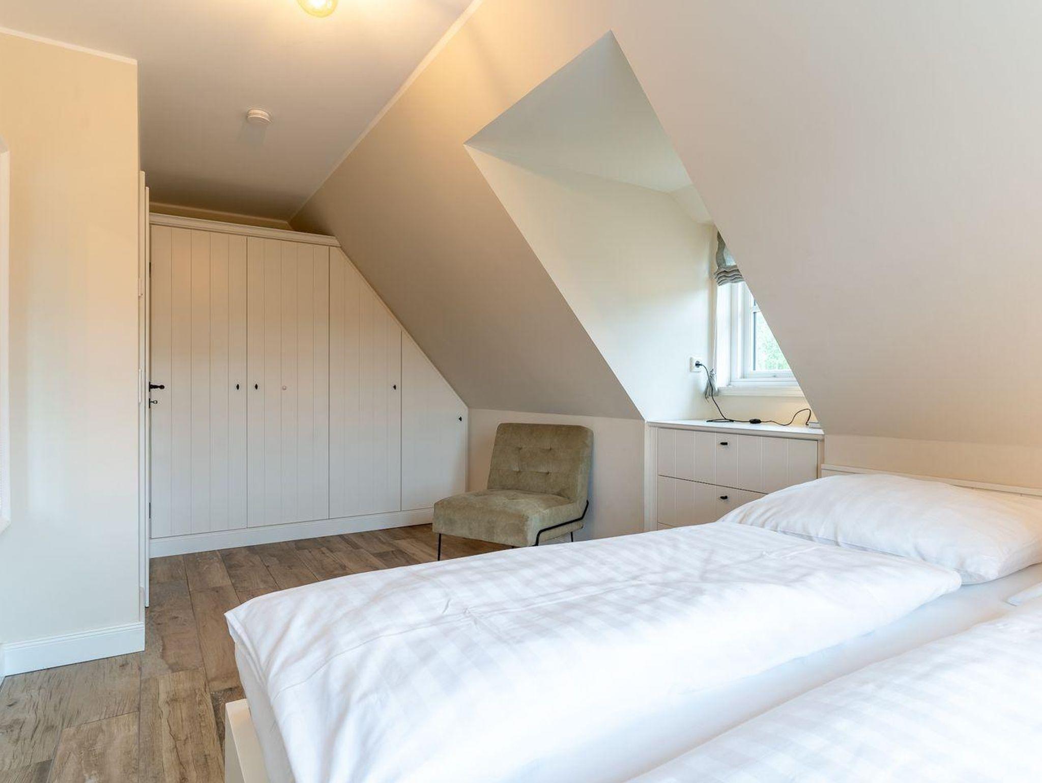 Eine Holztreppe führt Sie ins Obergeschoss, wo zwei weitere stilvoll eingerichtete Schlafzimmer mit komfortablen Doppelbetten (1x 200 x 210 cm + TV und 1x 160 x 200 cm) und ein weiteres Schlafzimmer mit einem Einzelbett (1x 100 x 200 cm) auf Sie warten. Ein geräumiges Badezimmer mit Dusche und Badewanne sorgt für zusätzlichen Komfort.