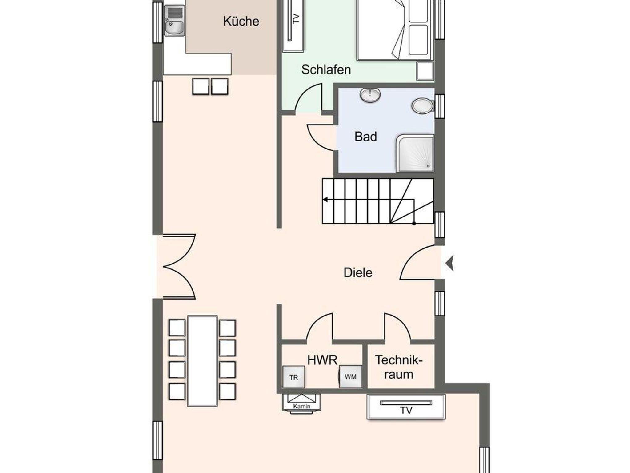 Das Ferienhaus besticht durch hochwertige Möbel und ein harmonisches Ambiente. Im lichtdurchfluteten Wohnzimmer mit Schwedenofen und TV können Sie entspannen und die offene Küche mit hochwertigen Elektrogeräten lädt zum gemeinsamen Kochen ein. Im Erdgeschoss finden Sie außerdem ein gemütliches Esszimmer, ein Doppelschlafzimmer (160 x 200 cm + TV) und ein modernes Duschbad.