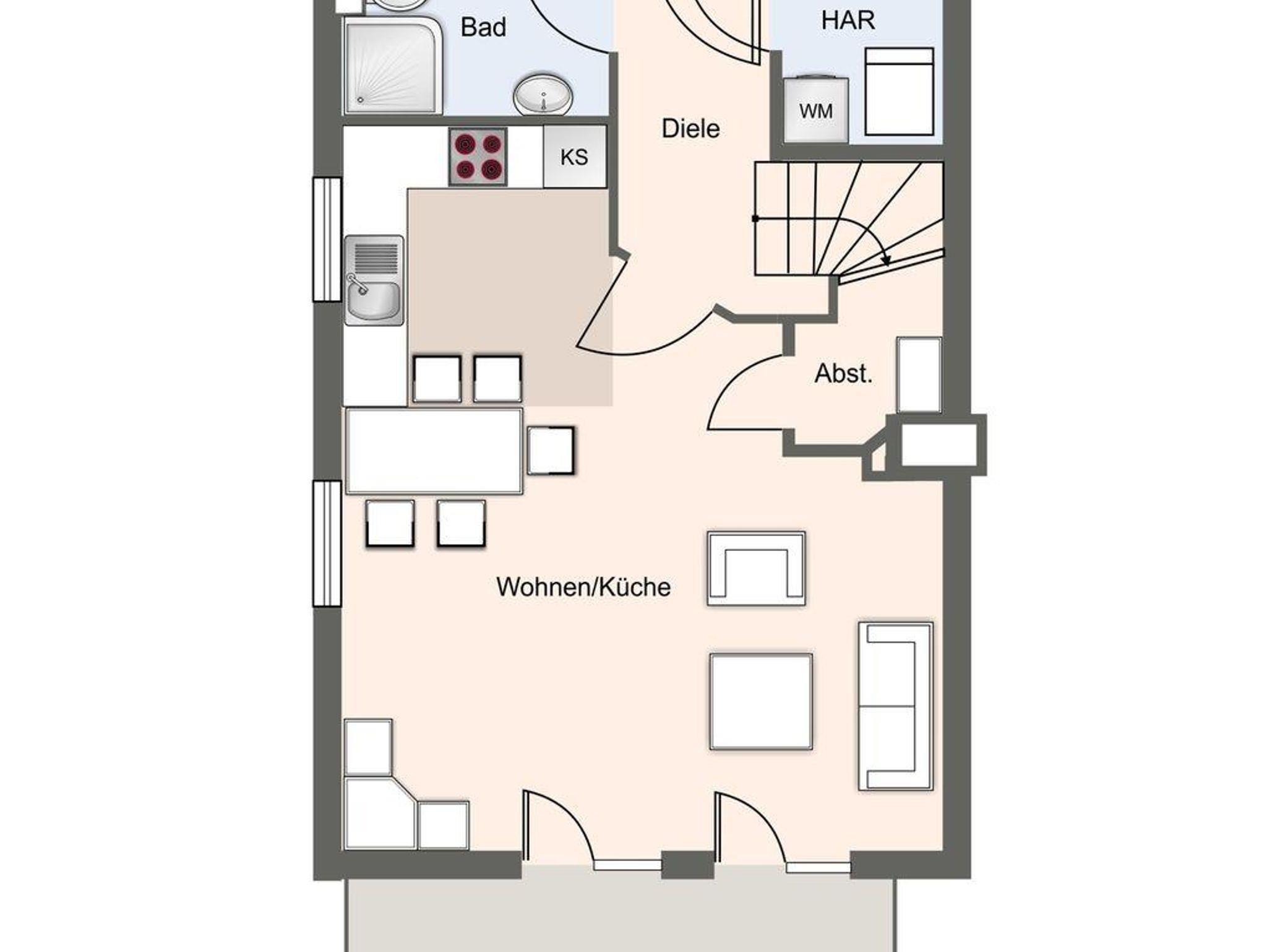 Im Erdgeschoss erwartet Sie ein Wohn- und Essbereich mit einem einladenden Specksteinofen und einer modernen offenen Küche. Zusätzlich verfügt das Erdgeschoss über ein Gästebad mit einer ebenerdigen Dusche. Von hier aus können Sie direkt auf die sonnige Süd-Terrasse treten, die mit edlen Gartenmöbeln aus Teak-Holz ausgestattet ist – der perfekte Ort, um die Sonne zu genießen.