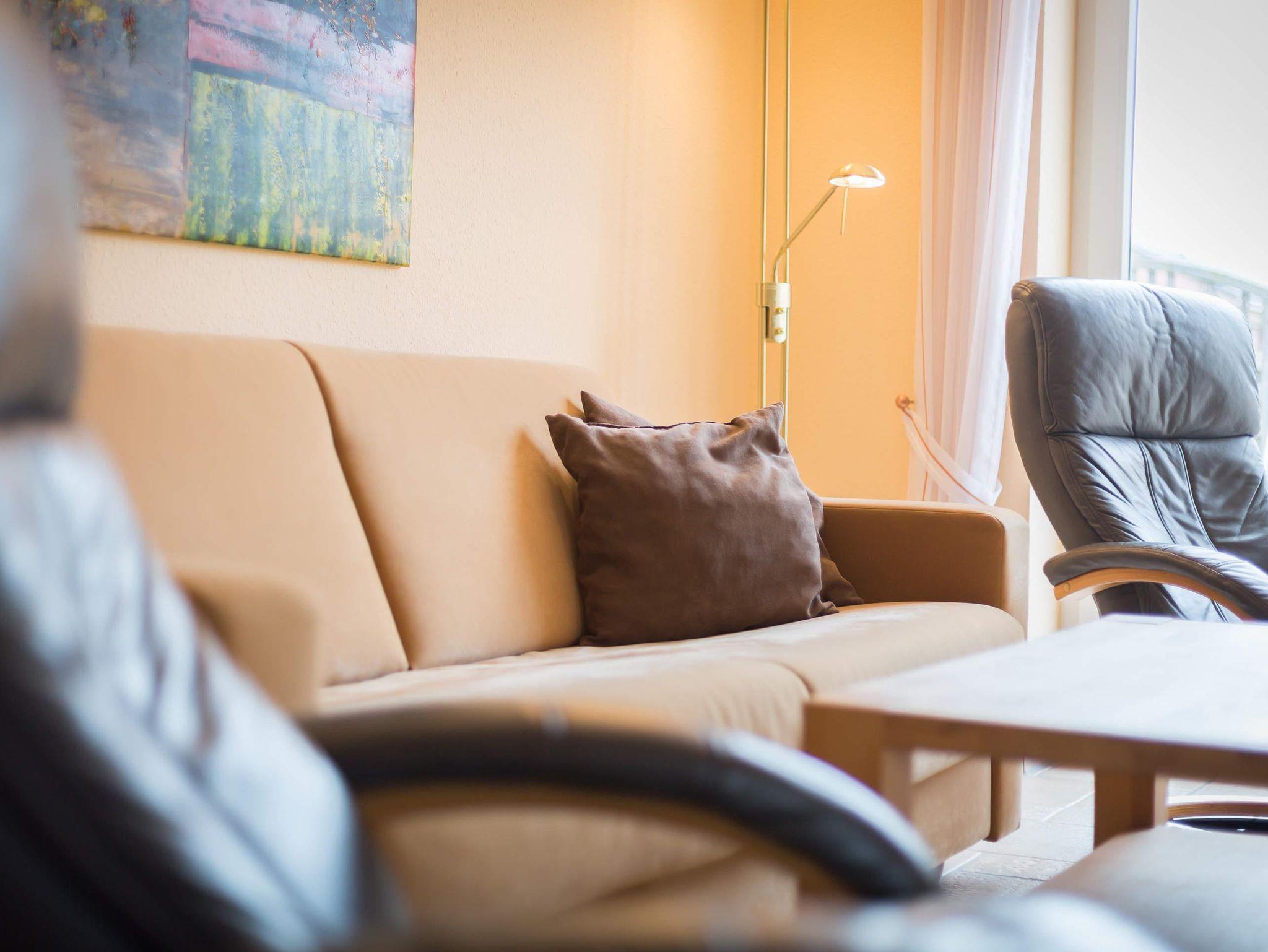 • Wohnzimmer mit Ledersofa, 2 Ruhesesseln, großem TV(Sat), gemütlicher Kaminofen.