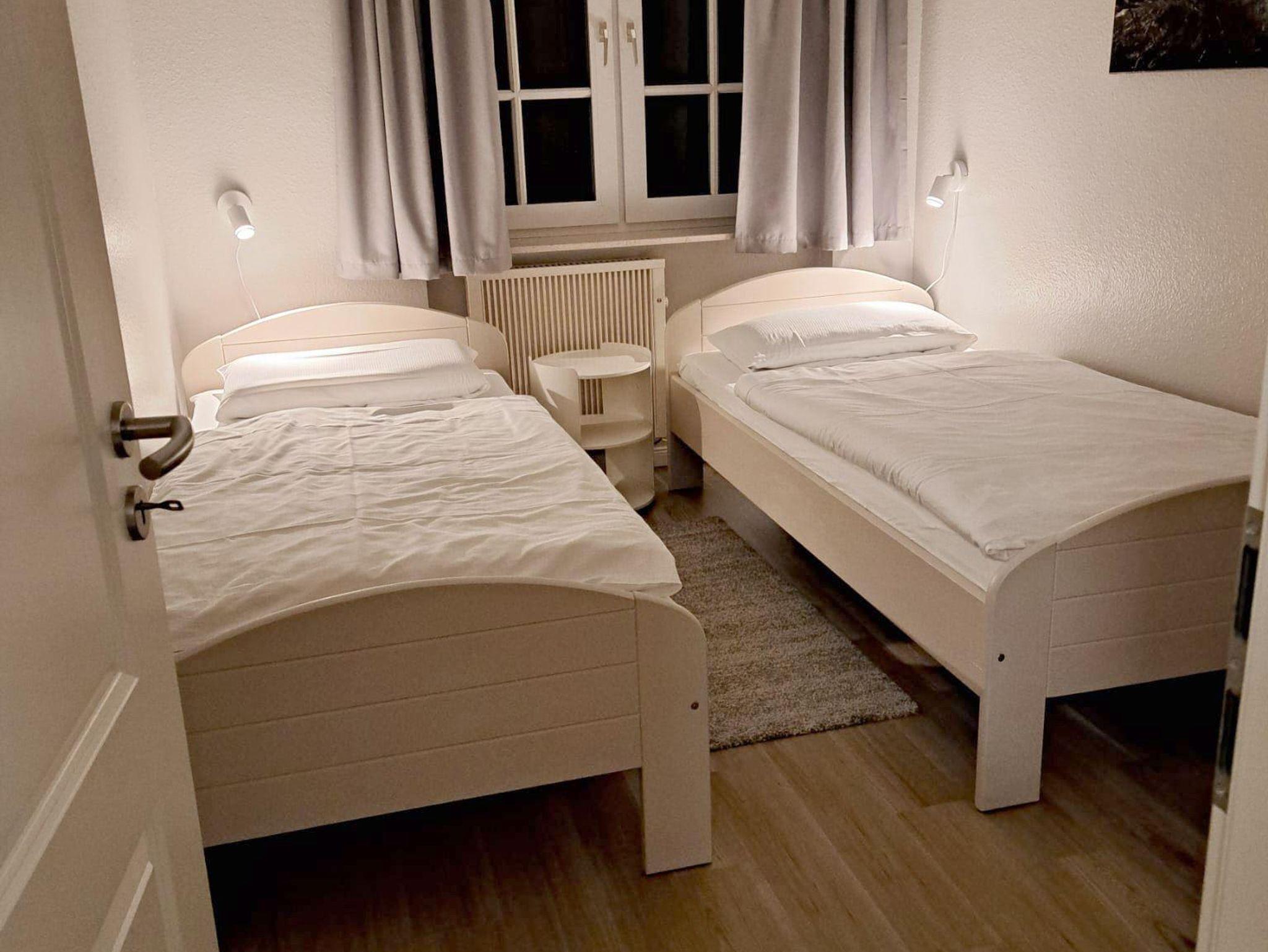 Schlafzimmer: 2 Einzelbetten, Nachttisch, 1 Elkatherm Flächenheizkörper, Kleiderschrank, Stuhl