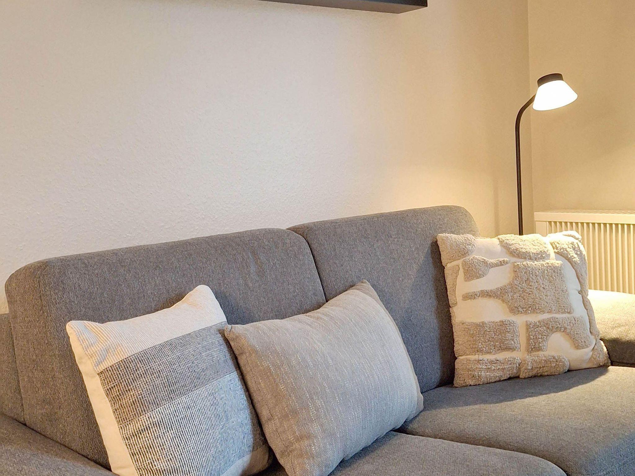 Wohnzimmer: Schlafcouch, Couchtisch, Sessel, Hocker, Stehlampe, 2 Elkatherm Flächenheizkörper, moderne Wohnwand, Kabel-TV, Telefon, Stereoanlage mit CD-Player, Esstisch, 4 Stühle, Küchenzeile, 4 Plattenherd mit Ceranfeld, Spülmaschine, Dunstabzugshaube, Mikrowelle, Kühlschrank, Kaffeemaschine, Wasserkocher, Toaster, Geschirr, Kochtöpfe