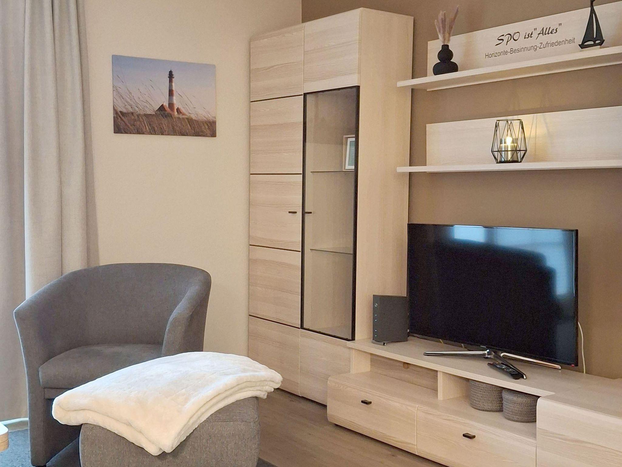 Die modern eingerichtete 2-Zimmer-Ferienwohnung Wattläufer Nr. 04 für 2-4 Personen liegt im EG. Vom gemütlich eingerichteten Wohnbereich treten Sie auf die schön abgetrennte Terrasse in Südlage, die halb überdacht ist. Hier können Sie Ihre Seele baumeln lassen. Die offene Küchenzeile lädt mit dem Cerankochfeld zum Kochen ein. Schlafplatz gibt es im Wohnzimmer und in den 2 Einzelbetten im separaten Schlafzimmer.