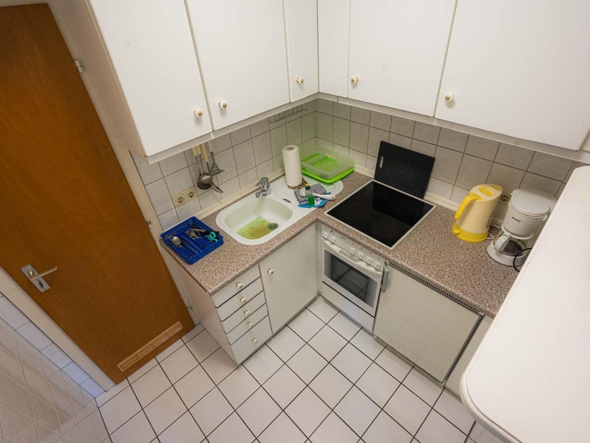 Wohnzimmer mit großem, elektrisch verstellbarem Sofa, das zum Schlafsofa (120x200cm) ausklappbar ist, TV und Esstisch mit 3 Stühlen. Kleine, zum Wohnzimmer halboffene Küche mit Backofen und Kühlschrank mit Gefrierfach.