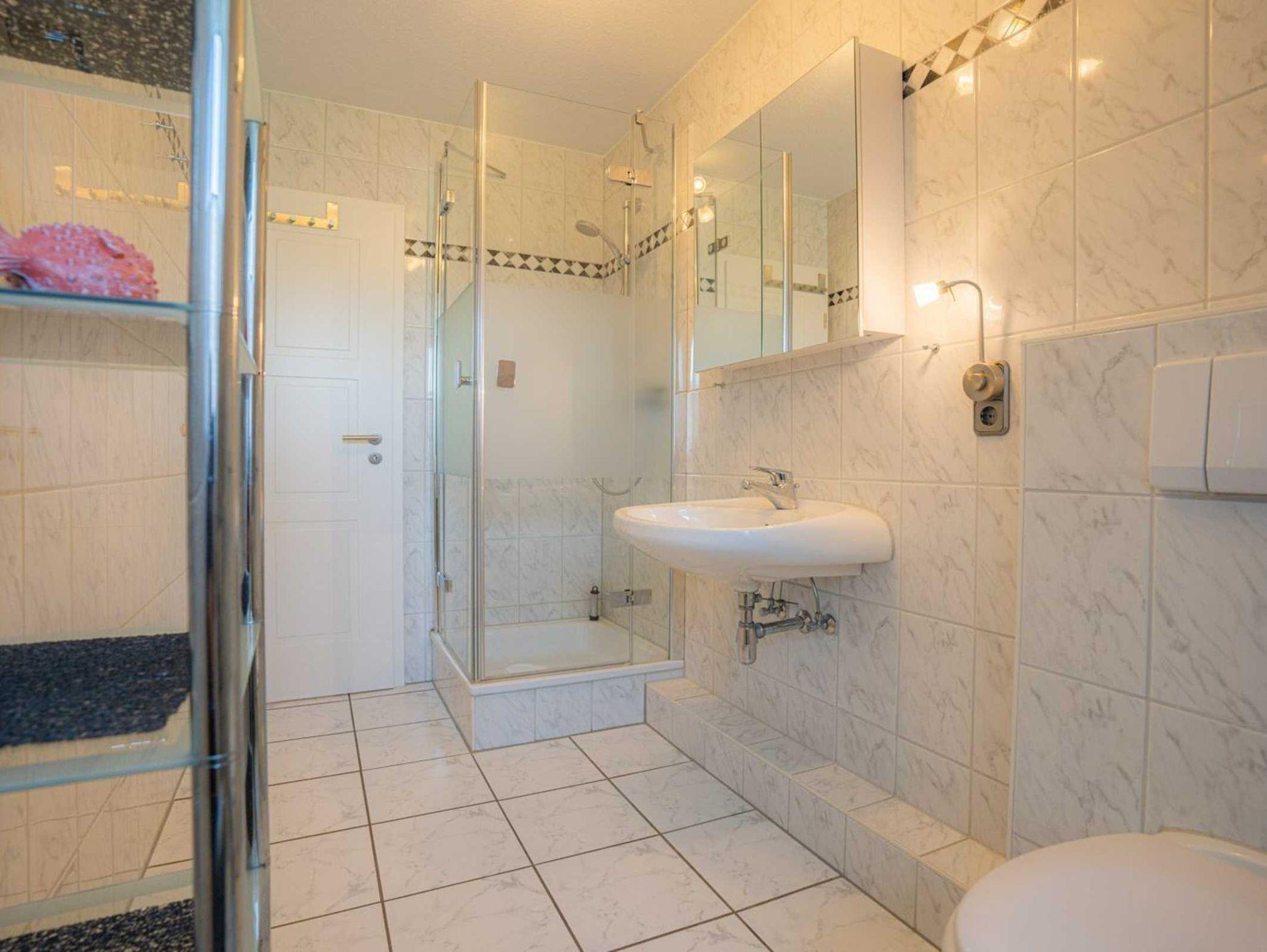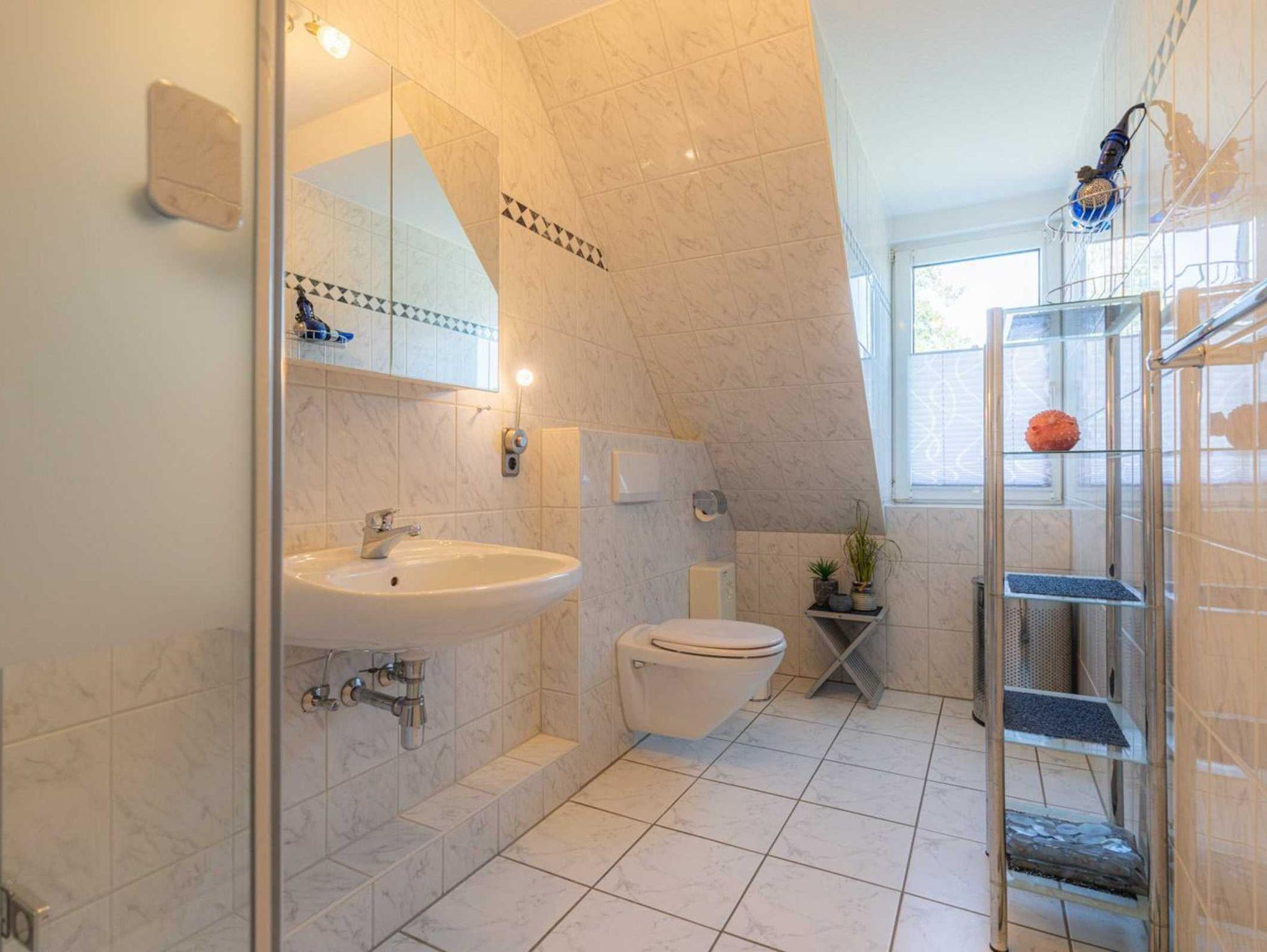 Badezimmer (Duschbad) mit Dusche, WC, Tageslicht und Föhn.