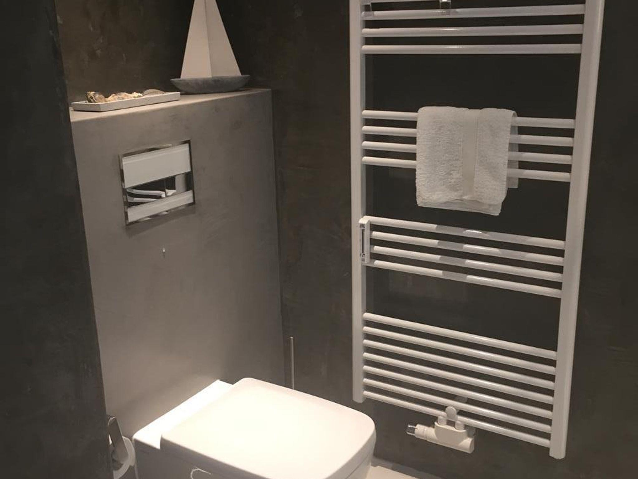 Alles Hand gemacht von Herrn Frank Hoddow , ein Waschtisch aus Ecobeton, ein echter Flussstein als Waschbecken, WC, Spiegel beleuchtet, Schminkspiegel, ebenfalls beleuchtet, Deckenlampe, Föhn, beheizbarer Handtuchhalter, Musik -radio zum Wohlfühlen und Mitsingen, Lüftungsanlage und Waschtrockner