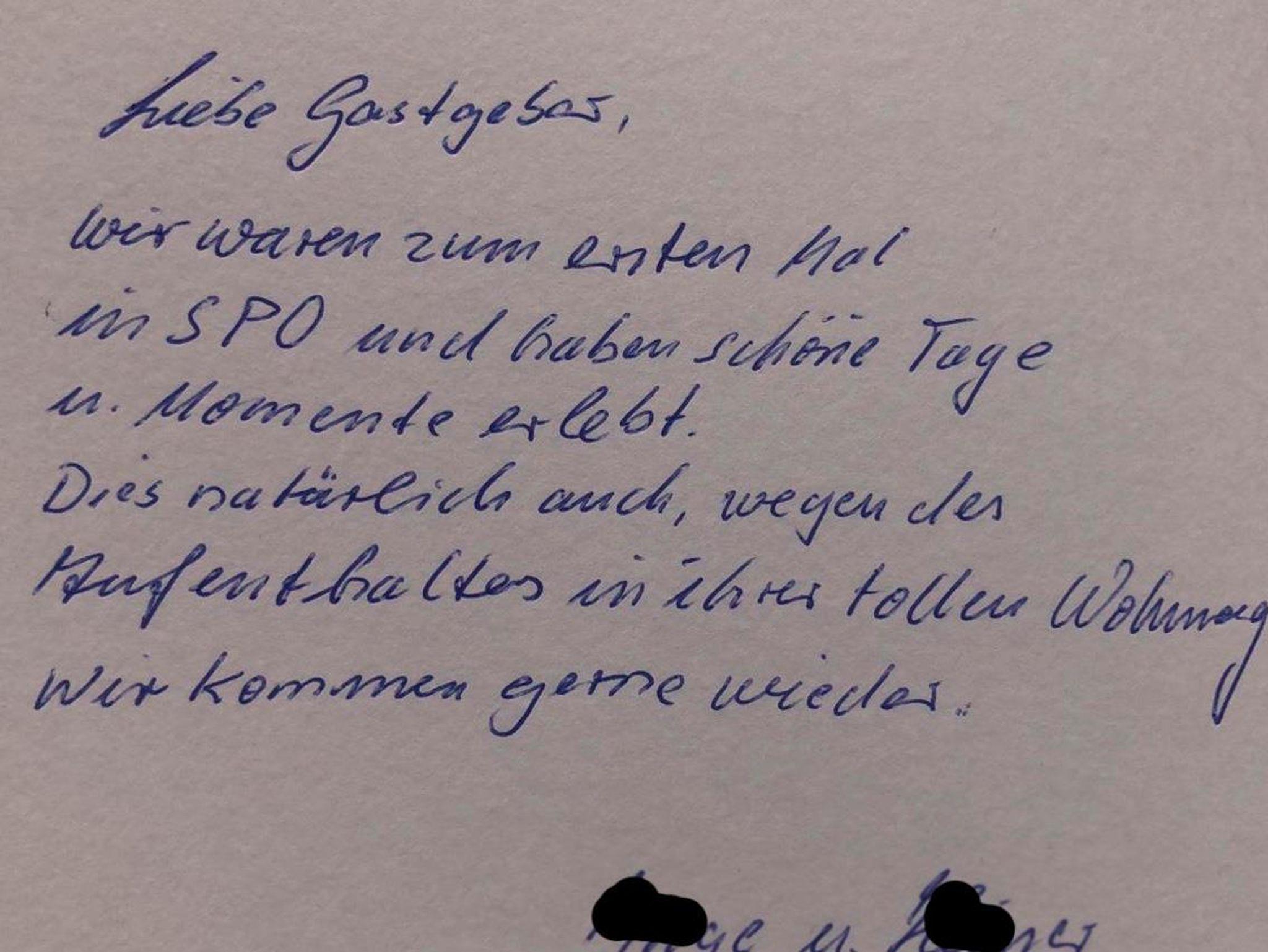 Es war alles zu unserer vollkommenen Zufriedenheit. Die Wohnung ist sehr geschmackvoll und mit sehr viel Liebe zum Detail eingerichtet. Wir waren schon mehrmals in SPO, aber diesmal haben wir die Wohnungstür aufgeschlossen und uns gleich sehr wohl gefühlt.