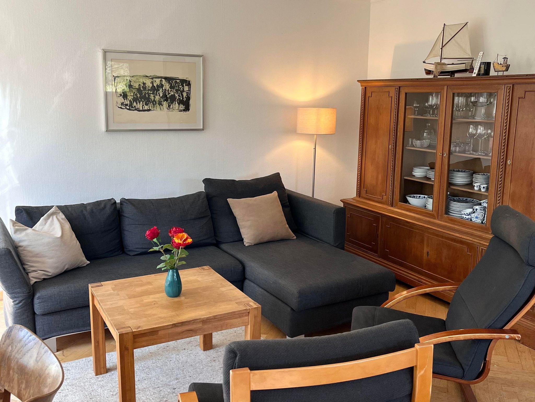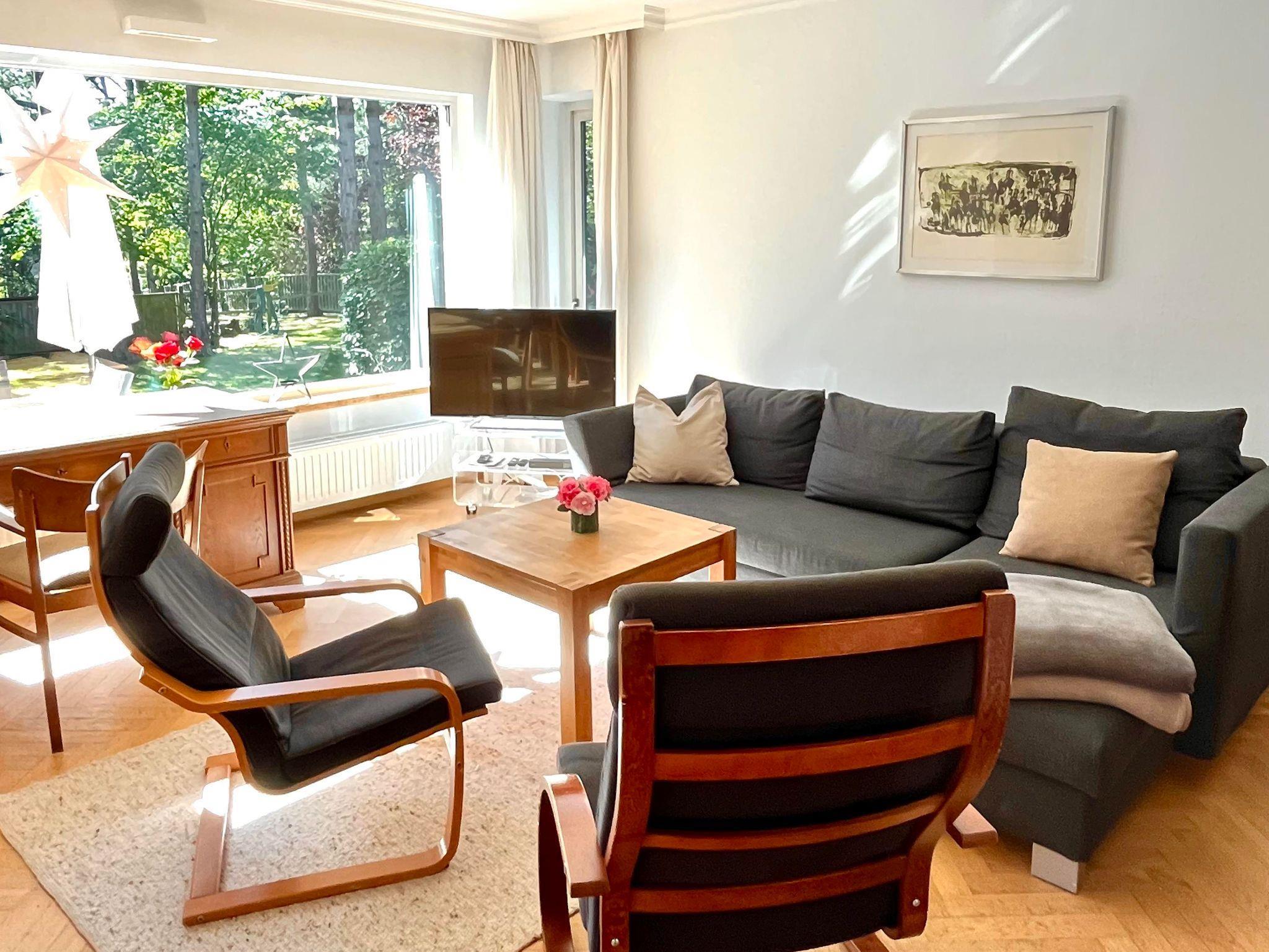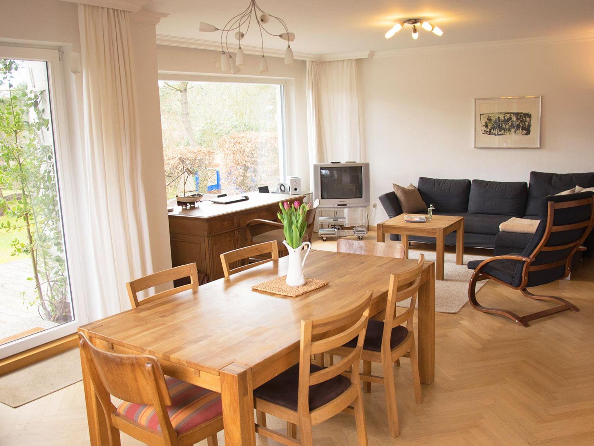 Die Whg. im EG - mit einem großen Wohnzimmer (inklusive Schlafsofa), zwei Schlafzimmern, Küche und Badezimmer - ist über 90 m2 groß. Zur Wohnung gehört eine große Terasse und es kann ein Stück des davor liegenden Gartens genutzt werden. Die Wohnung ist komfortabel ausgestattet: Einbauküche mit Backofen, extra Gefrierschrank, Spülmaschine, Waschmaschine, geräumiges Wannenbad, Föhn und Kosmetikspiegel; Kabel-TV, WLAN-Internetzugang, DVD-Player, Radio mit CD-Player, Terassenmöbel und Strankorb. Kinderbett und Hochstuhl werden auf Wunsch bereit gestellt.