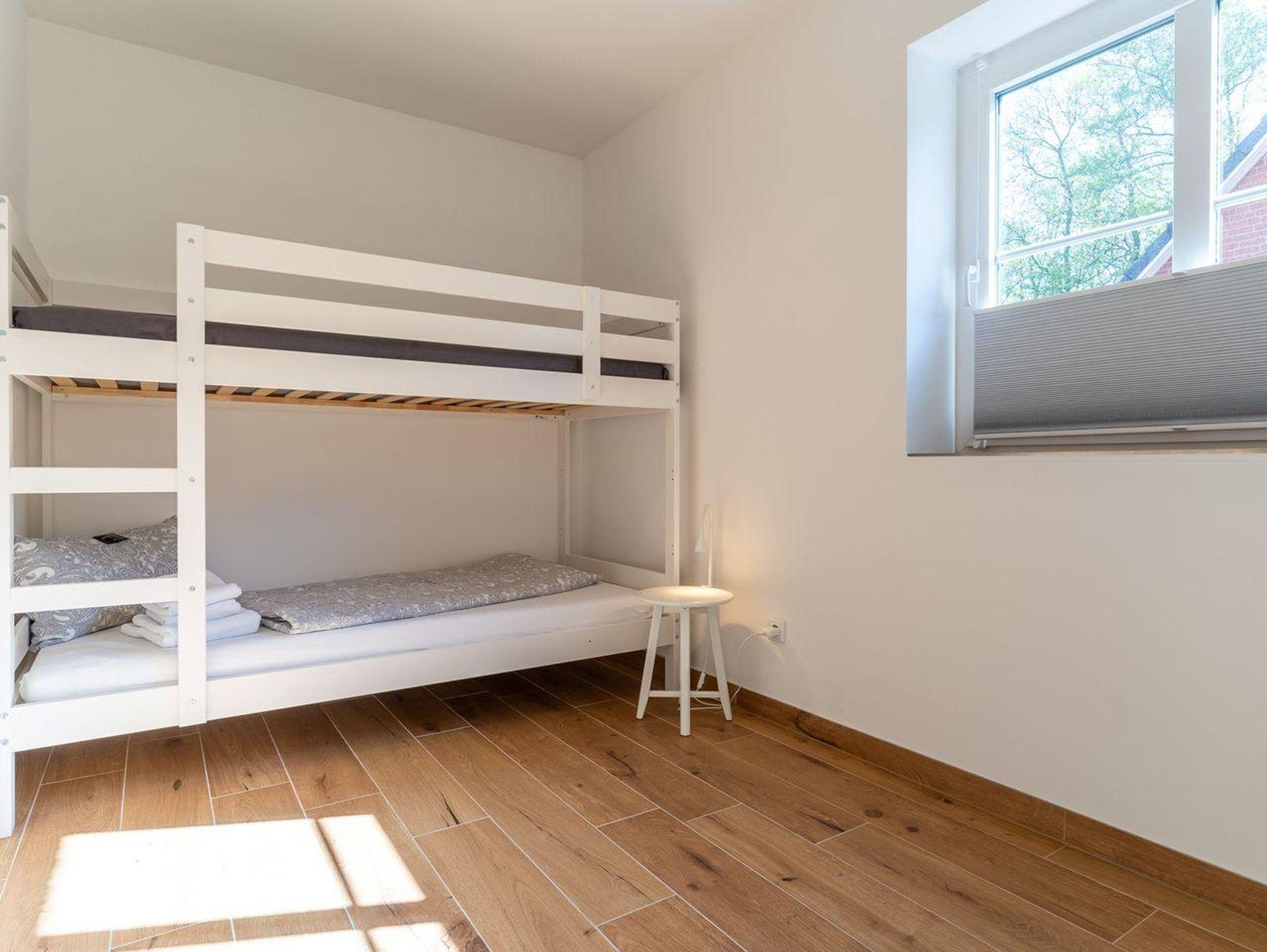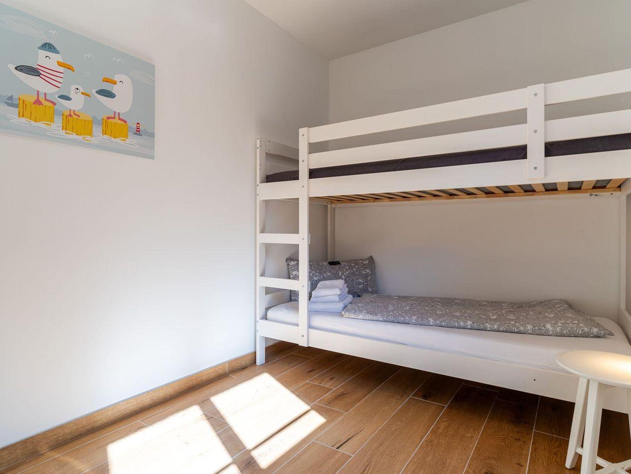 Die Wohnung verfügt über zwei Schlafzimmer: Das erste Schlafzimmer ist mit einem komfortablen Doppelbett ausgestattet, während das zweite Schlafzimmer über ein Etagenbett verfügt, das ideal für Familien mit Kindern oder Gruppen von Freunden ist.