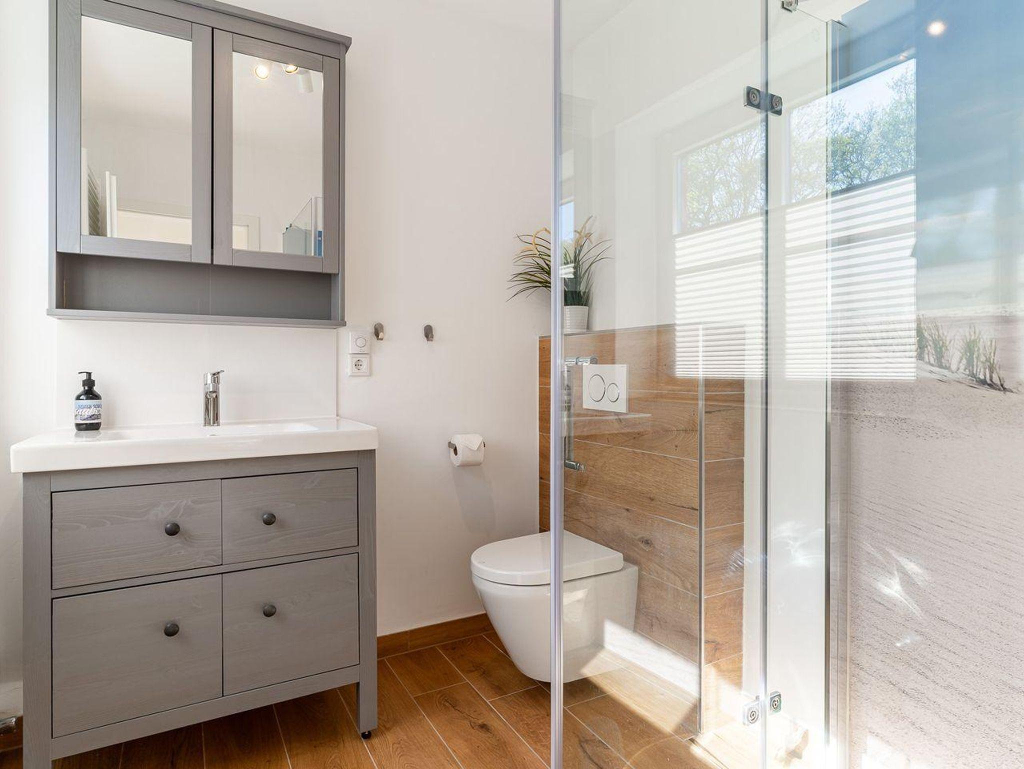 Das moderne Badezimmer bietet eine Dusche, eine Toilette und alle notwendigen Annehmlichkeiten, um sich nach einem erlebnisreichen Tag zu erfrischen.