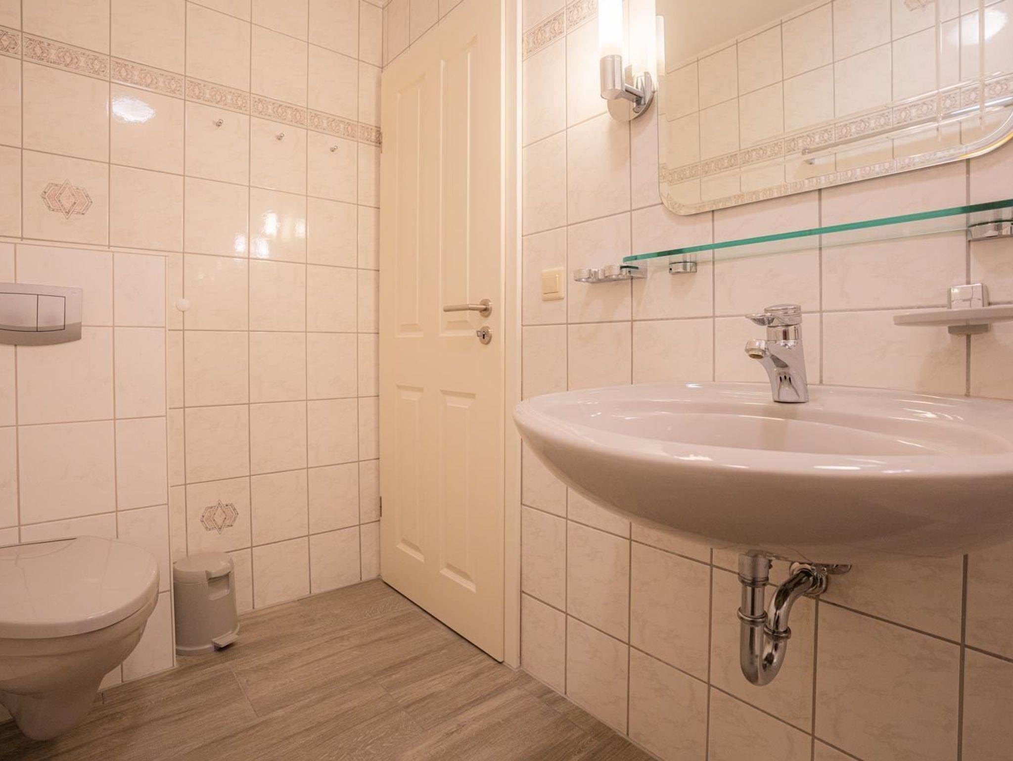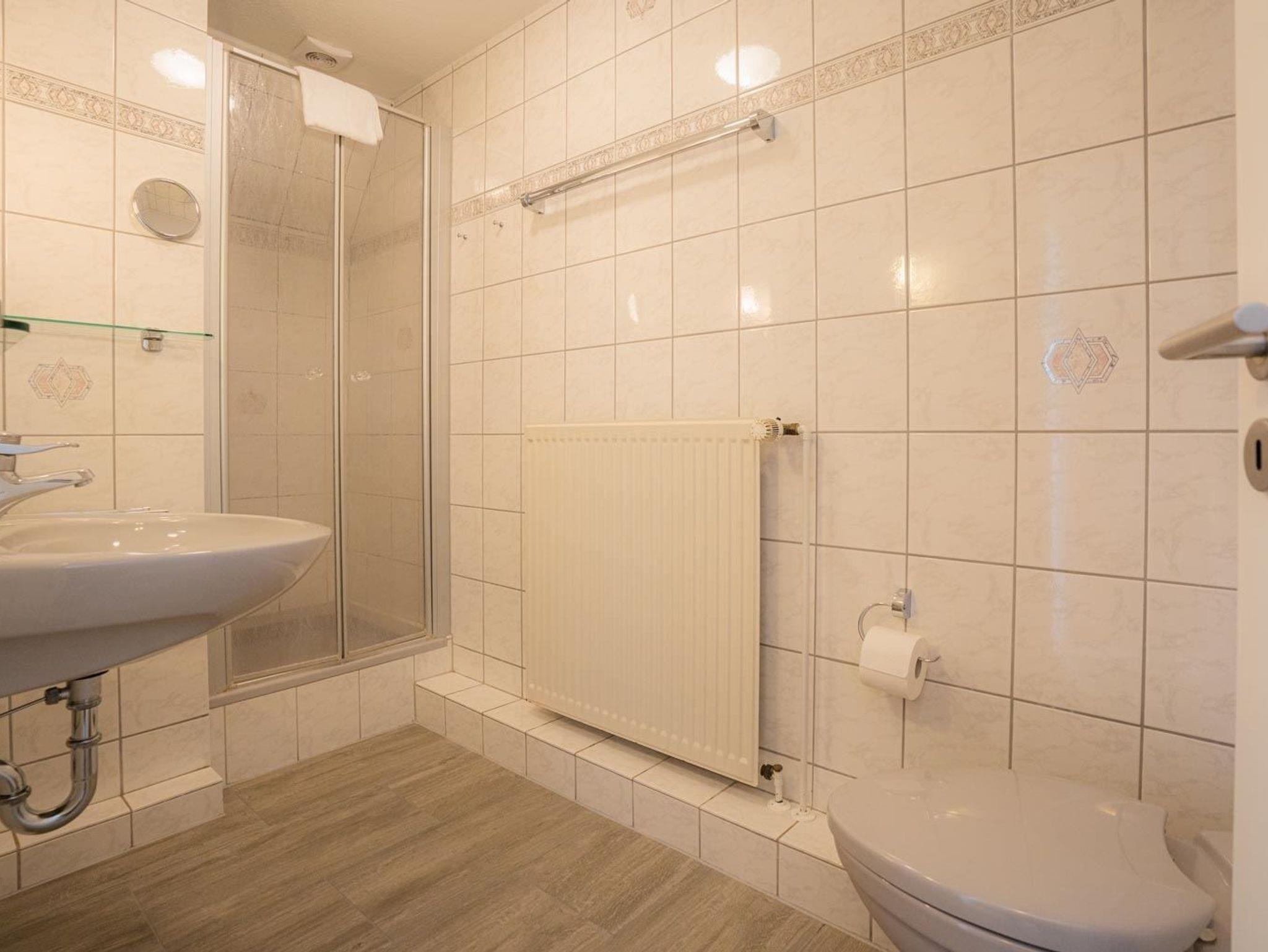 Badezimmer (Duschbad) mit Dusche, WC, Handtuchwärmer und Föhn.