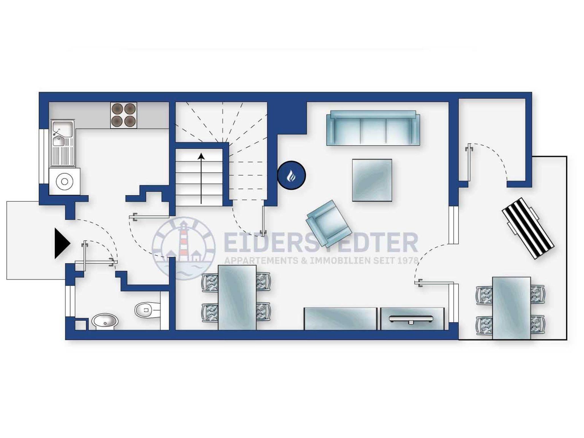 Exklusiver Mittelhausteil 2 Unsere kleine Hütte mit 3 Zimmern und ca. 58 m² auf 2 Ebenen (EG, OG) für bis zu 4 Personen. In absolut ruhiger Wohnlage im Ortsteil Ording in St. Peter-Ording. Zum Strand sind es ca. 1500m zu Fuß.