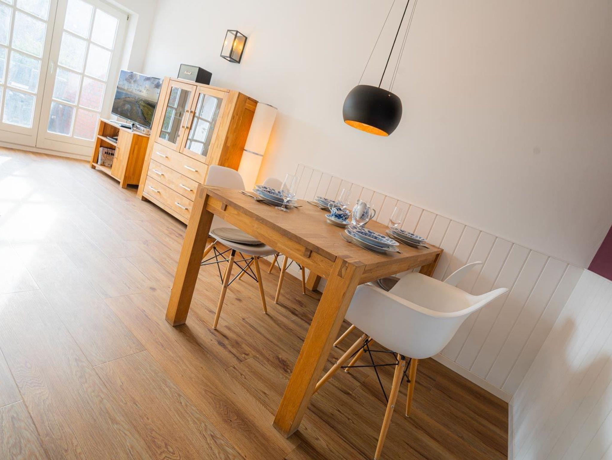 Wohnzimmer mit Sofa und Sessel, SMART-TV (Sat), behaglichem Kaminofen und gemütlichem Essbereich für bis zu 4 Personen. Abstellkammer mit Staubsauger. Direkter Zugang zur möblierten Gartenterrasse nach Südosten.