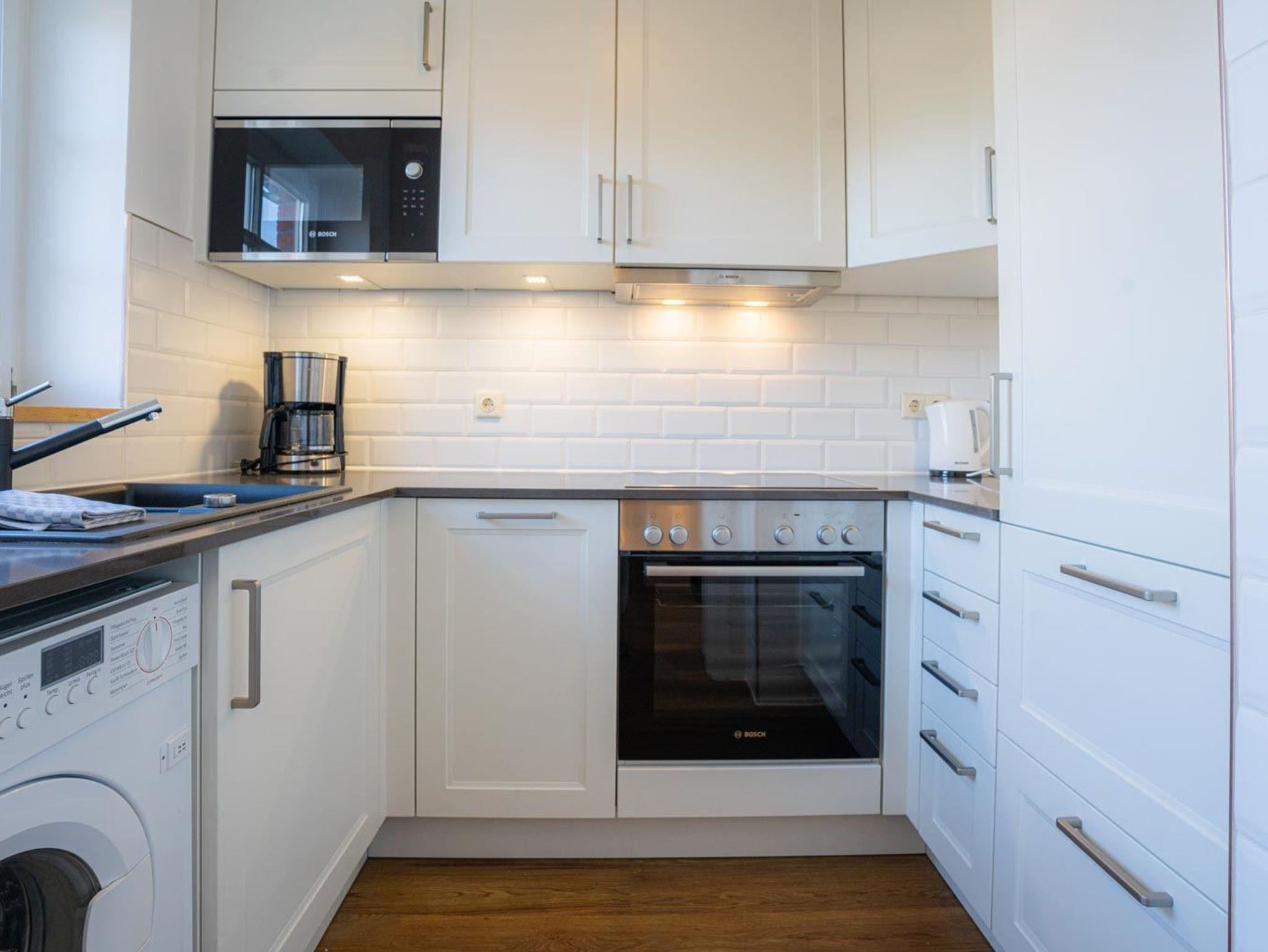 Separate Küche mit Backofen, Mikrowelle, Geschirrspüler und Kühlschrank mit Gefrierfach. In der Küche befindet sich außerdem eine Waschmaschine.