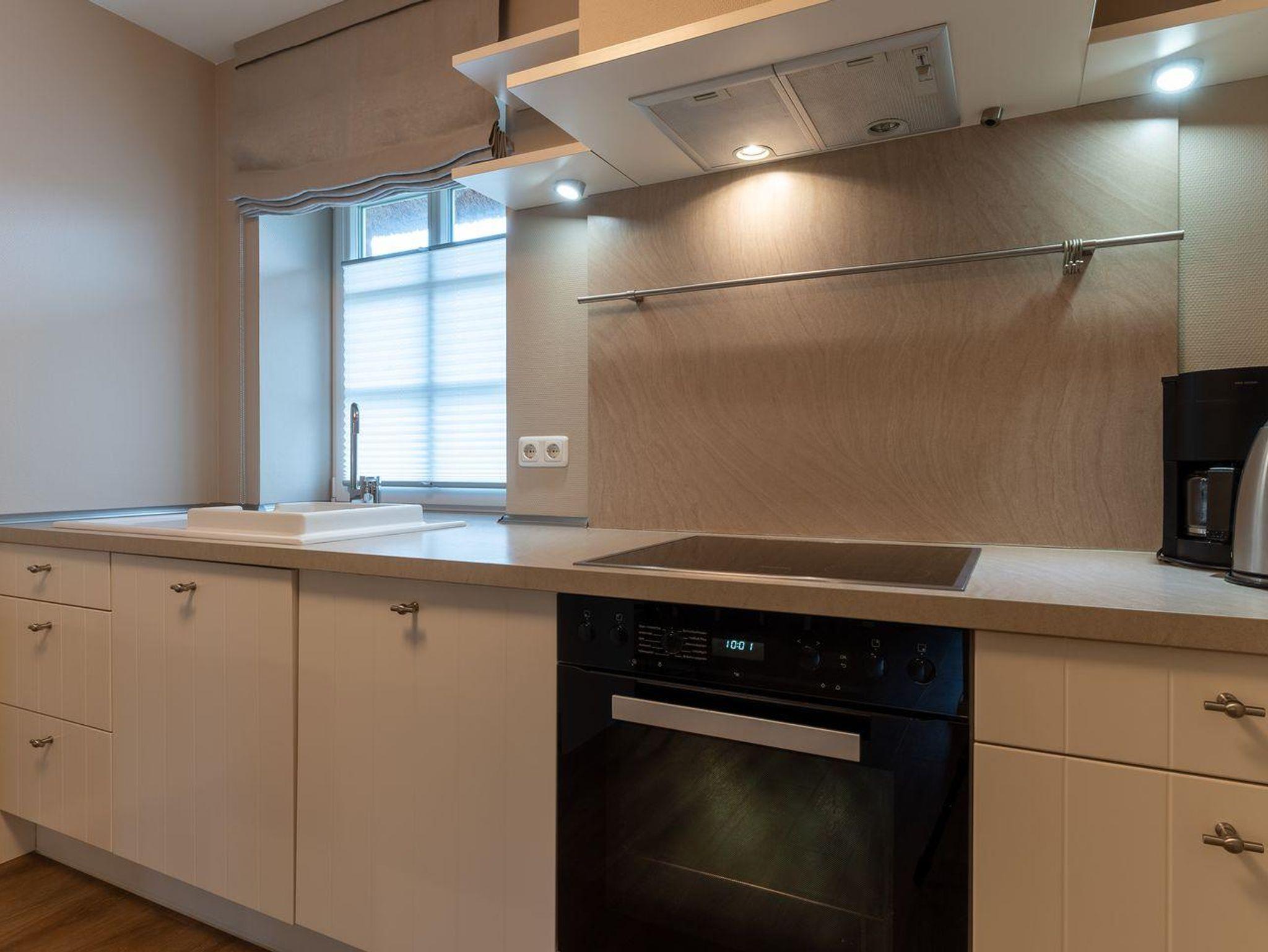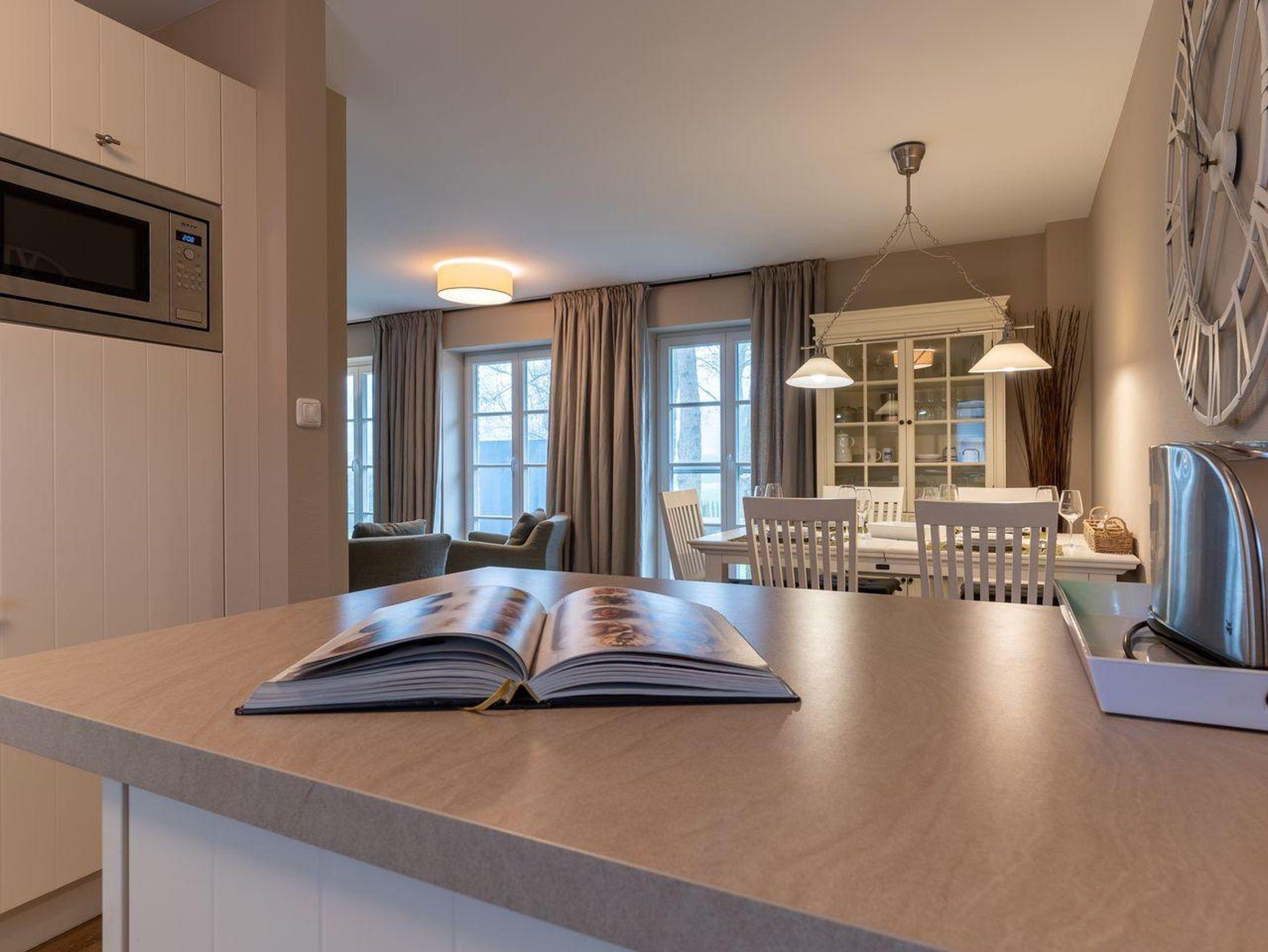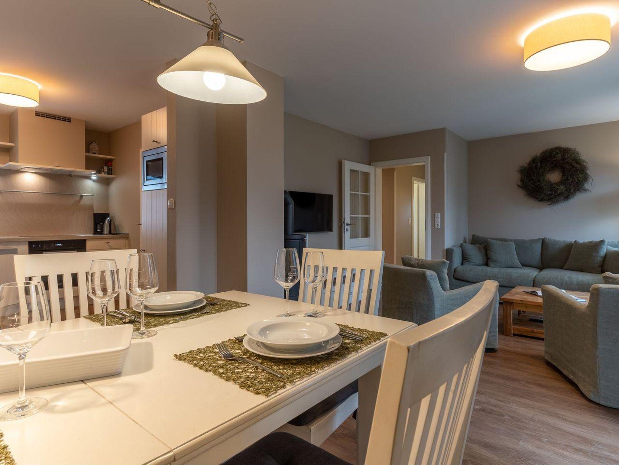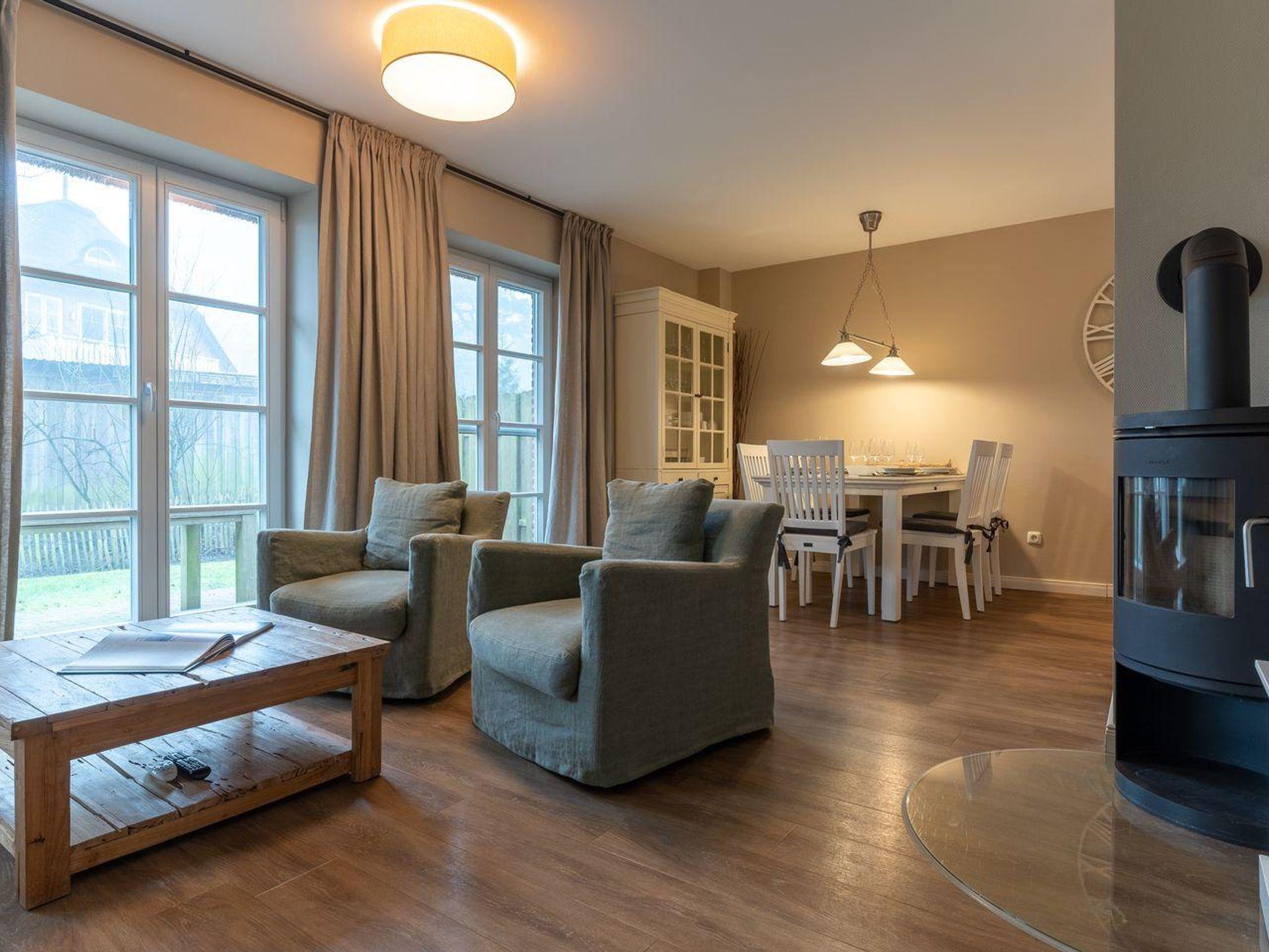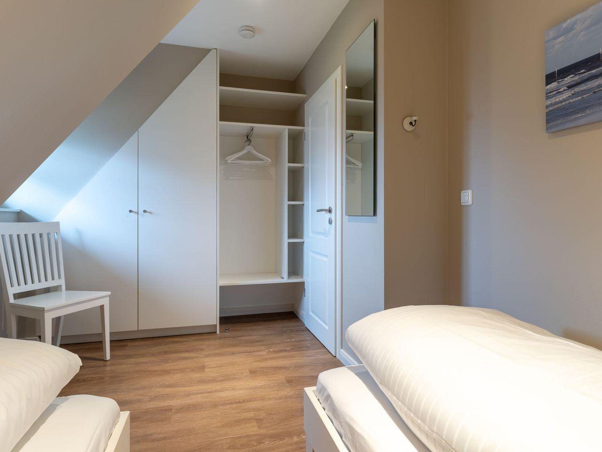 Im Erdgeschoss befindet sich der Wohnraum mit einer offenen Küche und einem gemütlichen Essbereich. Die Küche ist voll ausgestattet mit hochwertigen Geräten. Im Erdgeschoss ist ebenso ein großer Flur mit Garderobe, ein Duschbad und ein Chill-Out-Room mit TV. Wunderbarer Rückzugsort zum Lesen, TV schauen, Spielen oder Chillen. Das Sofa kann zu einem gemütlichen Schlafbett für 2 Personen umgebaut werden. Über eine Holztreppe im Flur gelangt man in das Obergeschoss mit zwei Schlafzimmern. Eines verfügt über ein 180er Bett mit TV und das andere über 2 x 90er Einzelbetten mit hochwertigen Matratzen (diese können auch zusammengeschoben werden). Außerdem ist im Obergeschoss ein Bad mit Badewanne. Beide Bäder verfügen über ein Fenster.