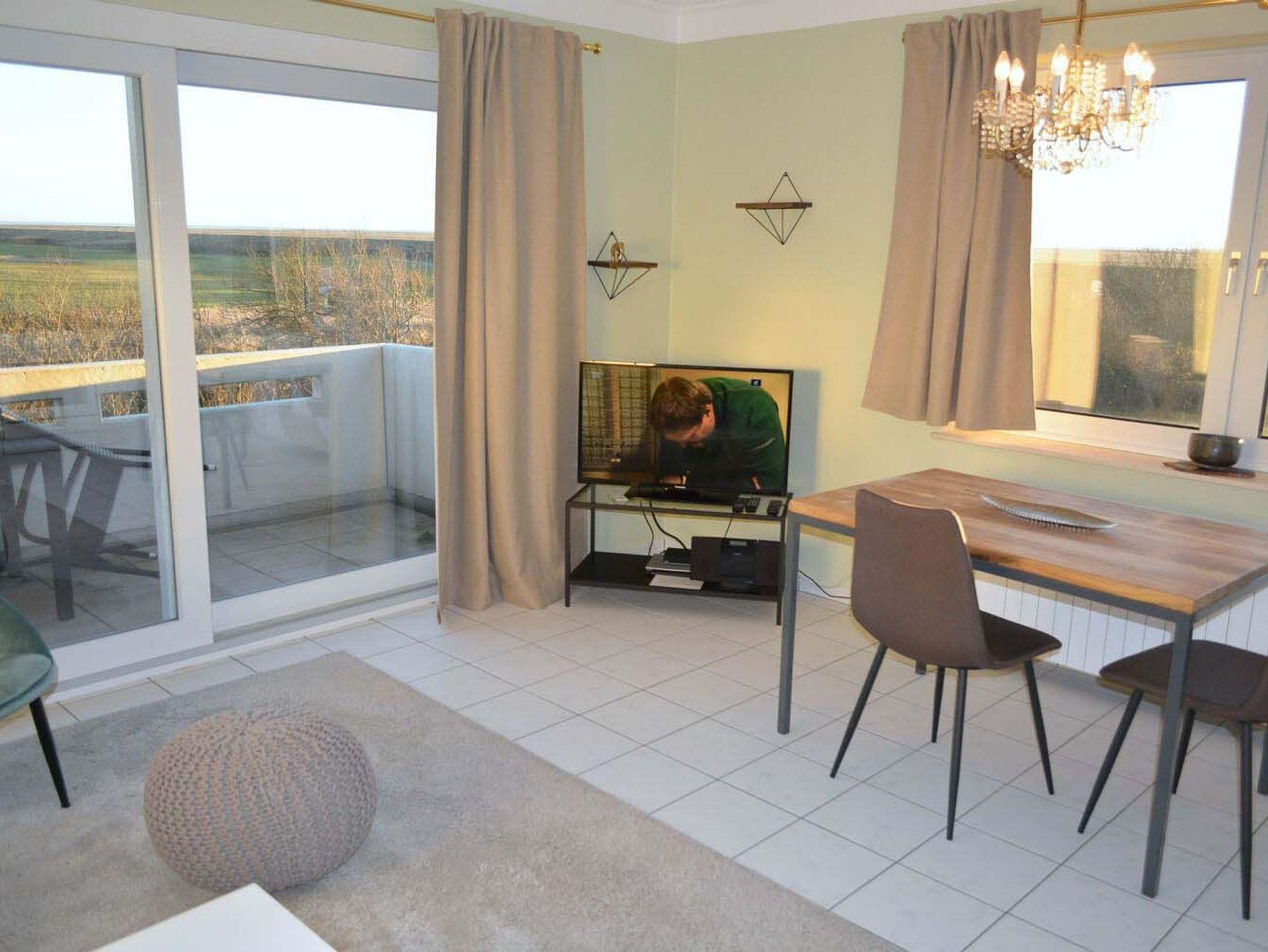 Die Ferienwohnung Strandblick befindet sich im ersten Stock eines ruhig gelegenen Mehrfamilienhauses direkt an der Strandüberfahrt. Der große Balkon in Süd-Ost Lage lässt Sie über das Meer und den angrenzenden Golfplatz blicken. Das Licht durchflutete Wohn- und Esszimmer inkl. Küchenzeile ist geräumig und komfortabel gestaltet. Eine freundliche und moderne Einrichtung lädt ein zum Erholen nach langen Touren auf dem Deich, einem Tag am Meer oder nach dem Golfen. Das gemütliche Schlafzimmer verfügt über zwei bequeme Einzelbetten und zwei Fenster in Süd-West Lage. Nach Bedarf kann auch die ausziehbare Couch im Wohnbereich als Schlafgelegenheit genutzt werden. Das vollgeflieste Bad ist hell und hochwertig ausgestattet und verfügt über eine gepflegte Dusche mit Duschtrennwand. Der zur Wohnung gehörende Parkplatz befindet sich direkt am Haus. Stellmöglichkeiten für Fahrräder sind am Haus oder im Fahrradkeller vorhanden.