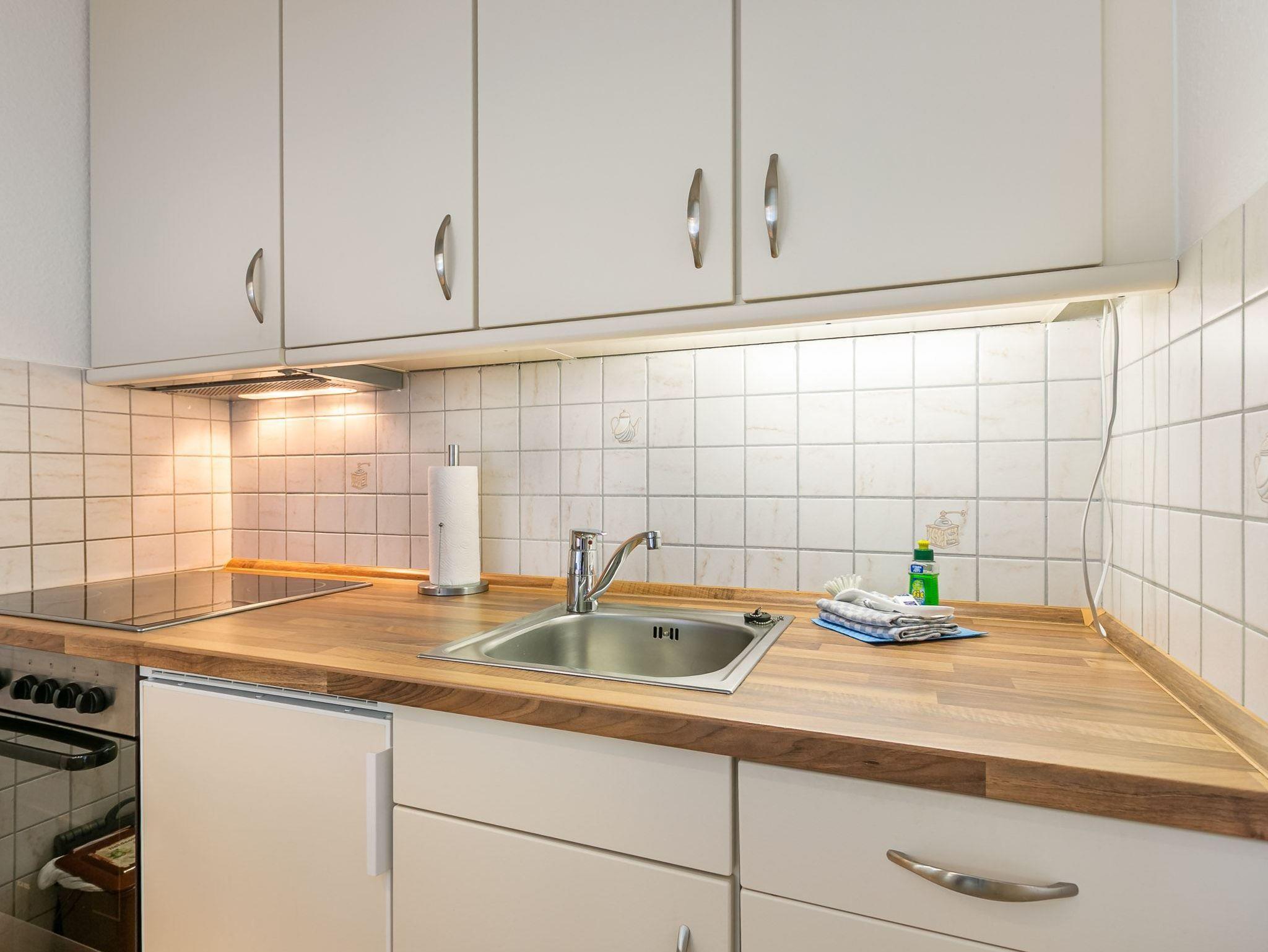 Wohnzimmer mit Ecksofa, TV (Sat) und Esstisch für 4 Personen. Direkter Zugang zum möblierten Balkon nach Südosten. Halboffene Küche mit Backofen, Geschirrspüler und Kühlschrank mit Gefrierfach.