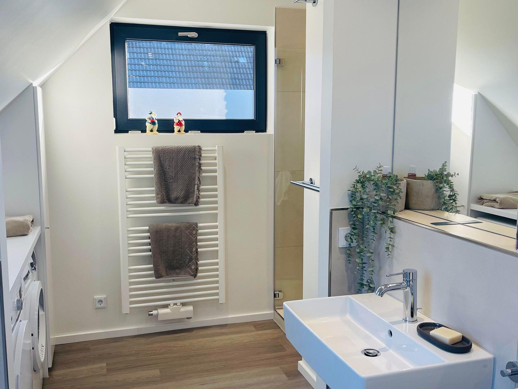 Ein kleines Duschbad befindet sich im Erdgeschoß, im Obergeschoß ein großes Badezimmer mit Badewanne, Dusche und 2 Waschbecken.