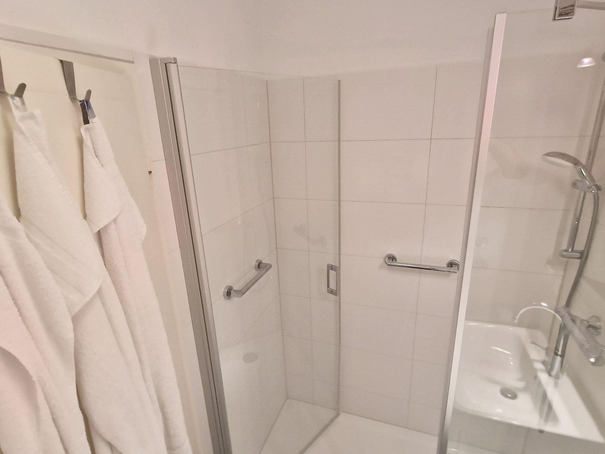Modernes Badezimmer: Das geschmackvoll geflieste Bad ist hell und einladend.